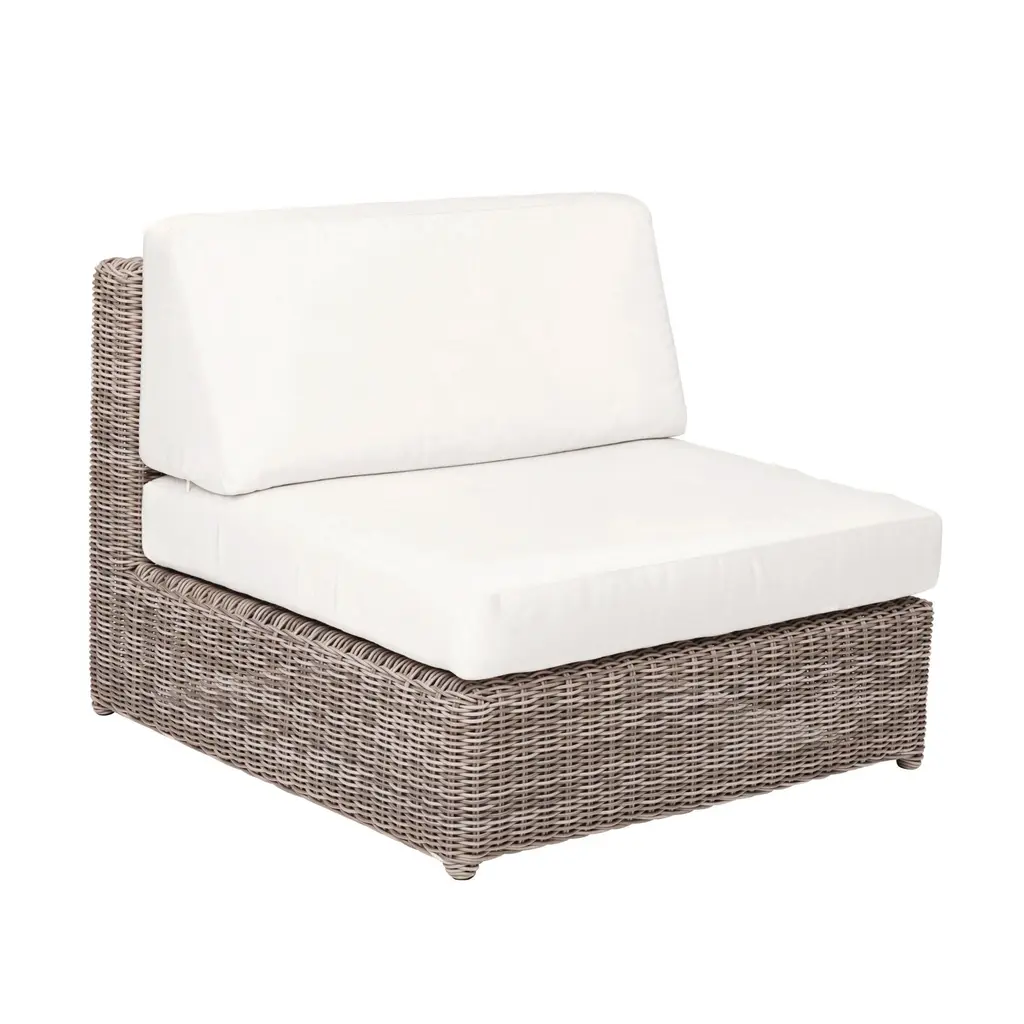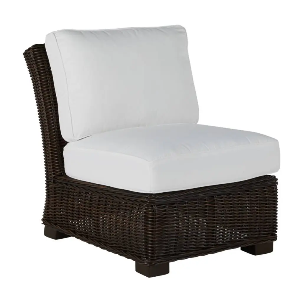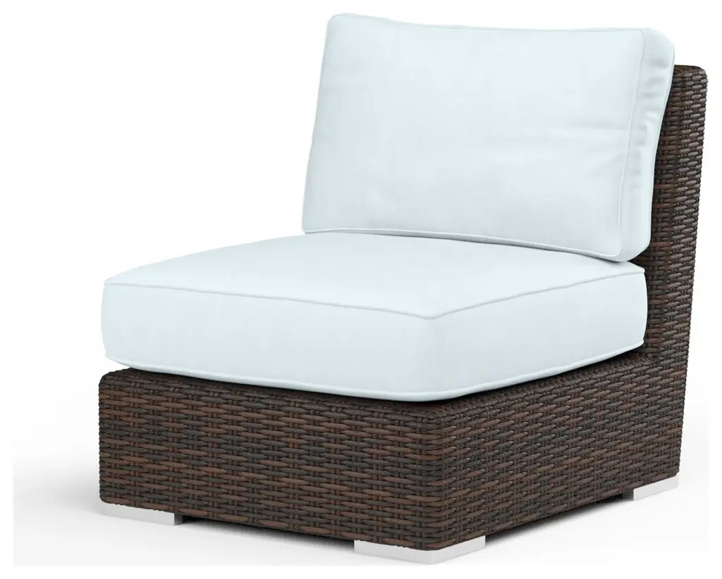 Expertly wrapped in a rich Cognac multi-colored weave, Montecito Armless Club Chair mimics natural materials with low maintenance in durable virgin resin wicker. Absolute comfort is provided with its generously sized frames and advanced seating support.Fully welded powder-coated aluminum frameWrapped in virgin PE Resin Wicker in CognacSunset West Progressive Springing System TechnologyWeather resistant, high-resiliency foam cushionsStocked in Premium Sunbrella fabric in Canvas FlaxNon-marking plastic glidesCommercial Quality ConstructionCustom Cushions available in approx. 4 weeks.Montecito is part of the Cognac color story, and coordinates well with Monterey and pieces from the Bazaar.