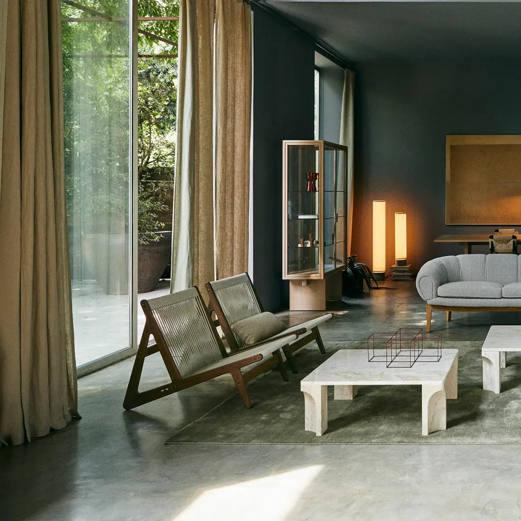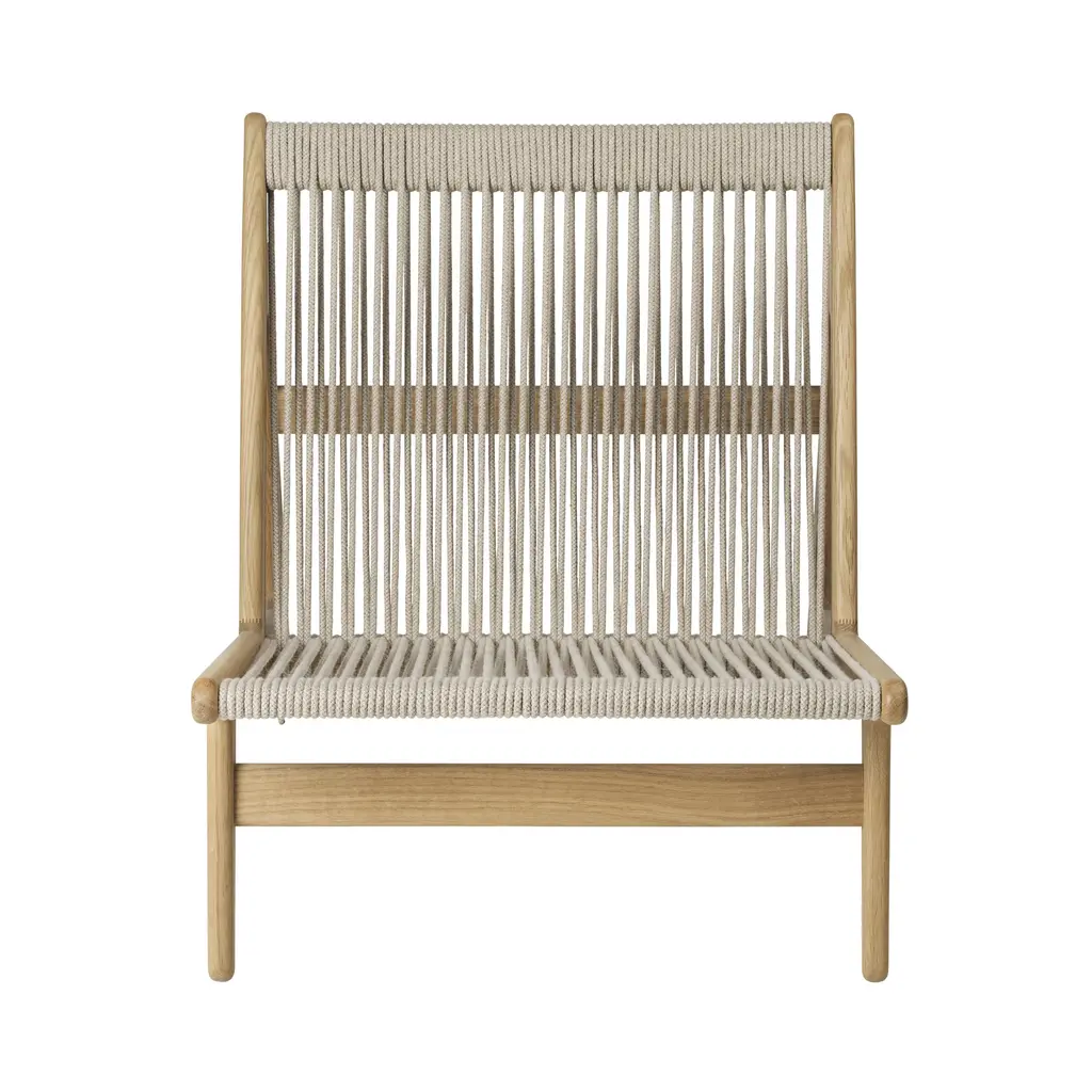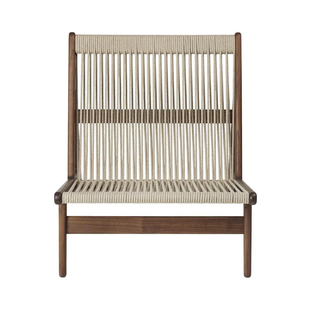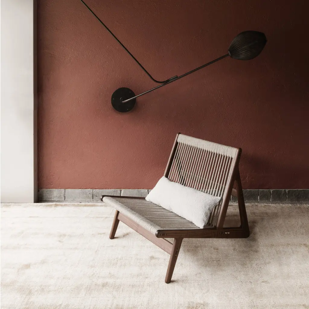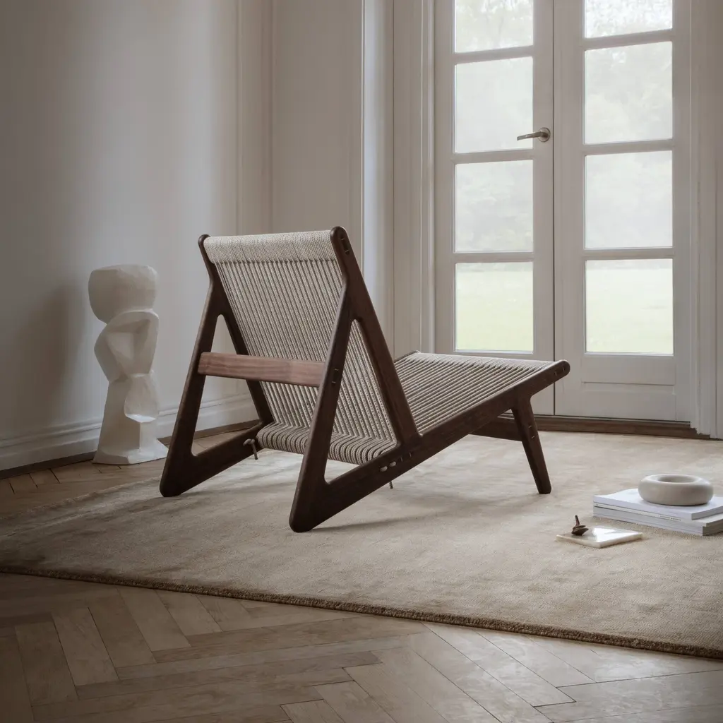 From a young Danish designer and trained cabinetmaker comes a carefully crafted lounge chair fashioned without a single nail. Mathias Steen Rasmussen starts with a low-slung, gently inclining seat which extends into the back leg and provides support for the backrest. In solid American walnut or oak, MR01's wedged tenon joints go right through the frame and 4 out its 5 cross bars are identical, simplifying construction and reducing waste. Ninety meters of rope are then hand-woven for the seat, using a method Mathias developed himself, for a eloquent play of organic materials.