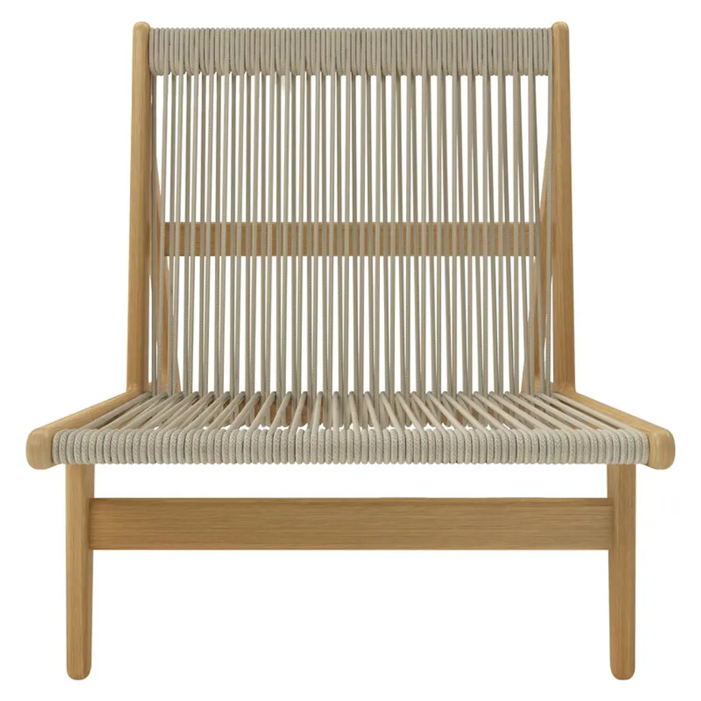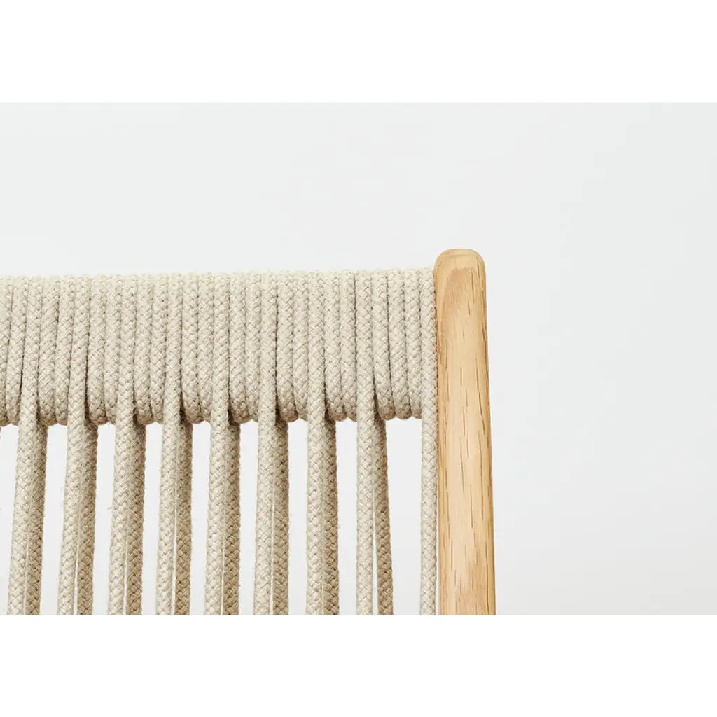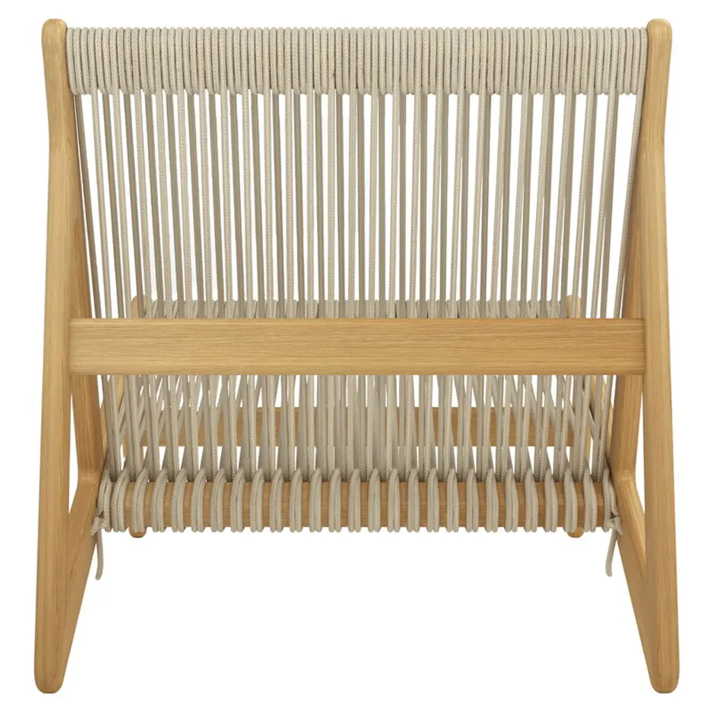 GUBI’s MR01 Initial chair, designed by Mathias Steen Rasmussen, is a unique lounge chair with influences from mid-century Danish design as well as Rasmussen's background in cabinetmaking. The Initial chair has a uniquely shaped, gently inclined solid wood frame, but what makes the chair even more unique is its seat material: the seat and backrest are hand-woven from 90 meters of rope using a method developed by Rasmussen. Skillful, visible joints complete the chair’s organic charm. Rasmussen originally designed the Initial chair for his own home: the aim was to design a lounge chair that would also be suitable for meditation. The tight rope weave gives the Initial chair not only an extremely lightweight look but also a sense of floating when sitting. The chair's fascinating form language and graceful, airy construction make it a perfect lounge chair for both small spaces and large living rooms and lobbies. Over time, the chair will develop a beautiful patina.