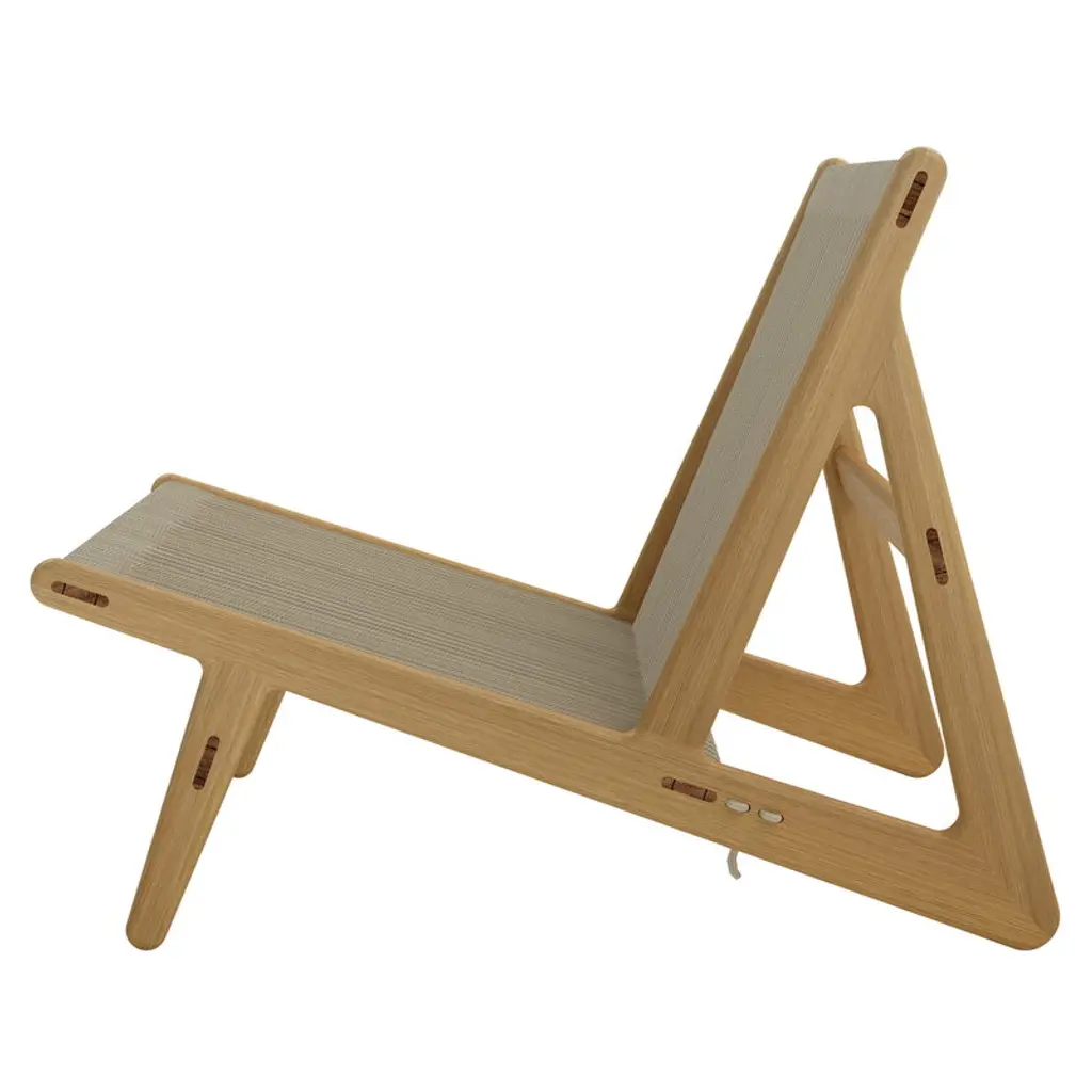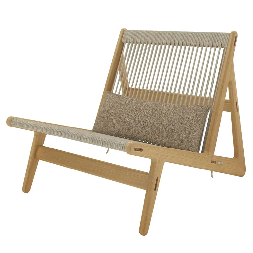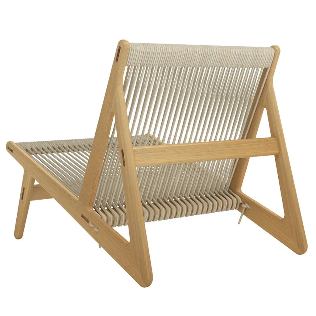 GUBI’s MR01 Initial chair, designed by Mathias Steen Rasmussen, is a unique lounge chair with influences from mid-century Danish design as well as Rasmussen's background in cabinetmaking. The Initial chair has a uniquely shaped, gently inclined solid wood frame, but what makes the chair even more unique is its seat material: the seat and backrest are hand-woven from 90 meters of rope using a method developed by Rasmussen. Skillful, visible joints complete the chair’s organic charm. Rasmussen originally designed the Initial chair for his own home: the aim was to design a lounge chair that would also be suitable for meditation. The tight rope weave gives the Initial chair not only an extremely lightweight look but also a sense of floating when sitting. The chair's fascinating form language and graceful, airy construction make it a perfect lounge chair for both small spaces and large living rooms and lobbies. Over time, the chair will develop a beautiful patina.