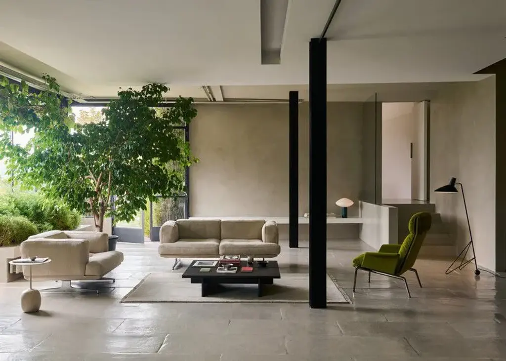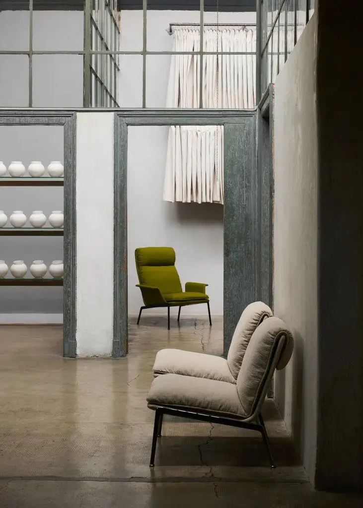 Denoted by an effortless elegance, the Muno series epitomises the spirit of Scandinavian and Italian design principles. Featuring a distinctive high back, the Muno lounge chair invites users to lean into moments of quietude with ample height to rest one’s head. The gentle incline of the sloping base enhances the chair’s posture while the padded contours of the design provide a strong sense of support.Product MaterialPlywood frame, HR foam, polyester wadding, cast aluminium. Fabric or leather upholstery.Production ProcessThe frame is made from form-pressed plywood, upholstered with foam and a textile cover. The cushion consists of duvets made from HR foam, which are attached to the upholstered seat frame with zippers. The armrests are made from bent plywood and covered with foam and textile. The legs are made from cast aluminium and are surface-treated with dark chrome or powder-coated in black.VariantsDark ChromeWarm Black