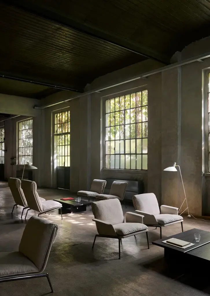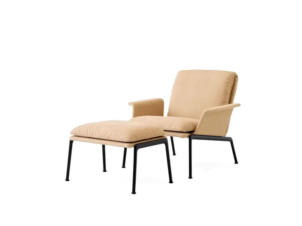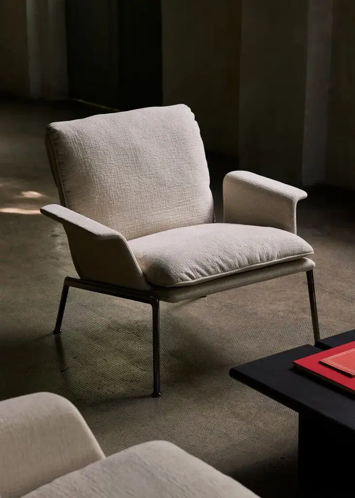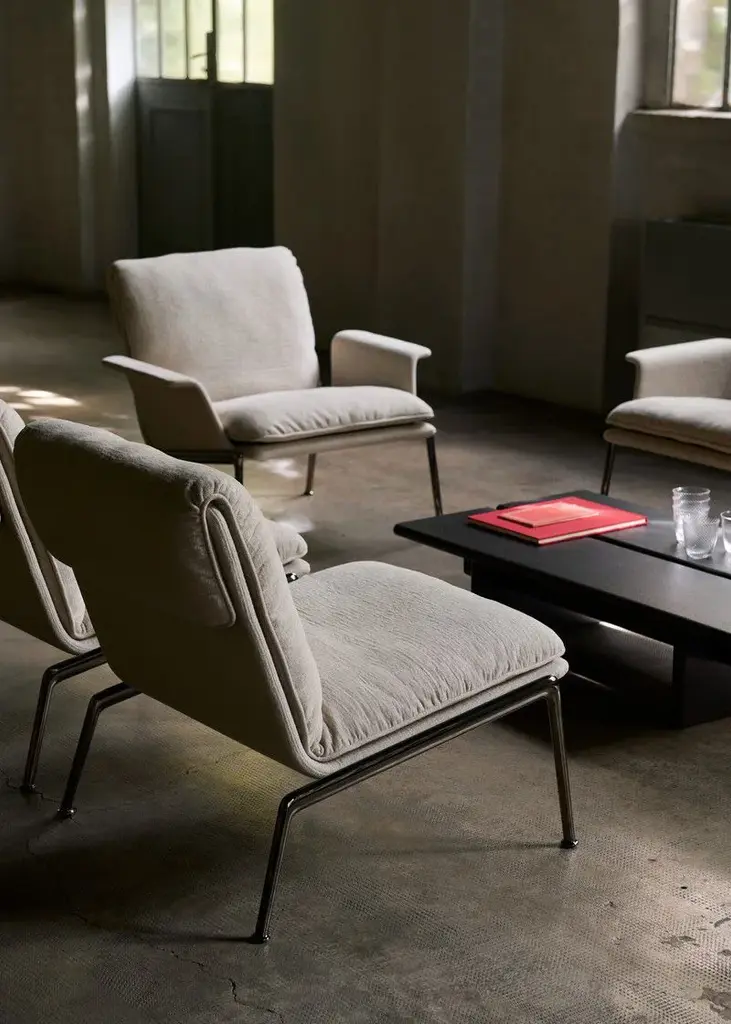 Characterised by its plush cushions and sleek, cast aluminium legs, the Muno lounge chair offers the same compelling experience as its taller counterpart in a more compact form. Revolving around a single cushion, the chair’s seat and backrest appear as though draped over the frame to achieve a relaxed yet contained expression.MaterialPlywood frame, HR foam, polyester wadding, cast aluminium. Fabric or leather upholstery.Production ProcessThe frame is made from form-pressed plywood upholstered with foam and a textile cover. The cushion consists of duvets made from HR foam, which are attached to the upholstered seat frame with zippers. The armrests are made from bent plywood and covered with foam and textile. The legs are made from cast aluminium and surface-treated with dark chrome or powder-coated in black.VariantsDark ChromeWarm Black