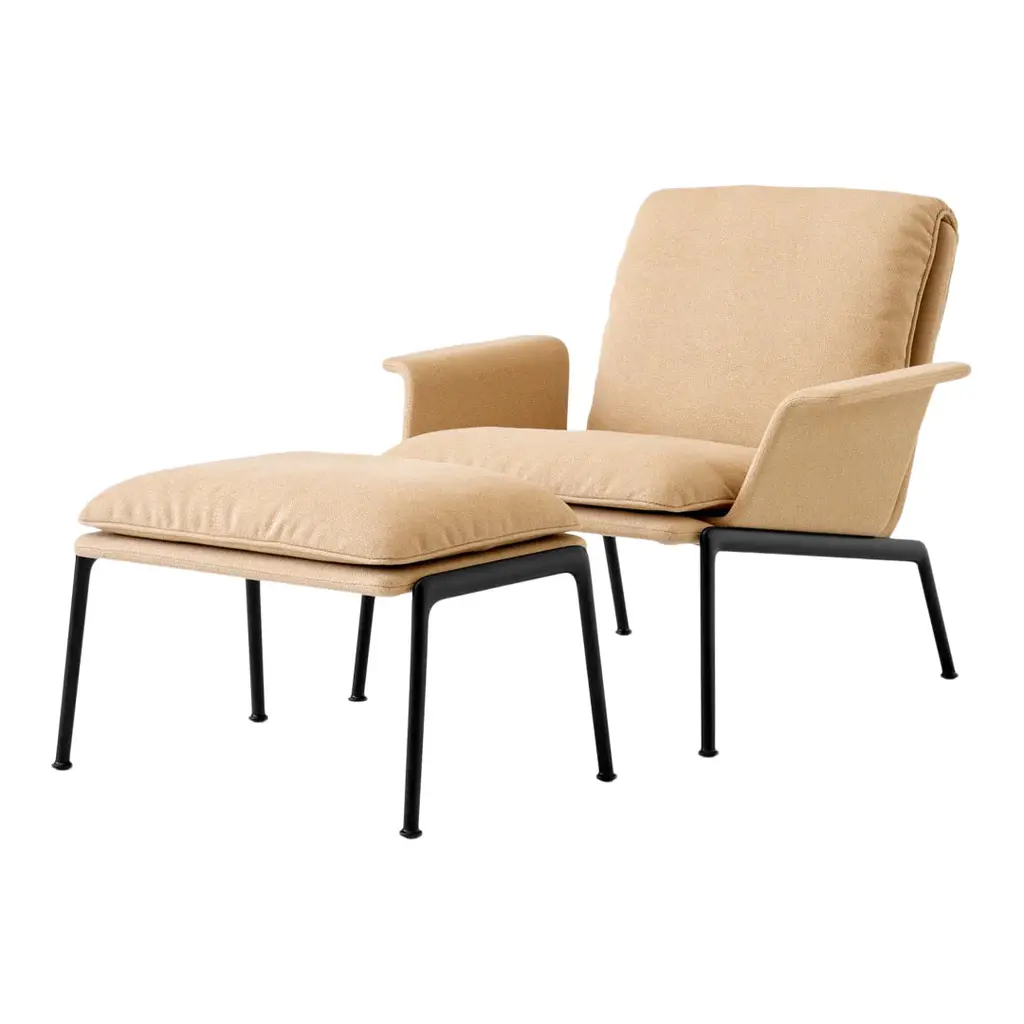 Characterised by its plush cushions and sleek, cast aluminium legs, the Muno lounge chair offers the same compelling experience as its taller counterpart in a more compact form. Revolving around a single cushion, the chair's seat and backrest appear as though draped over the frame to achieve a relaxed yet contained expression.