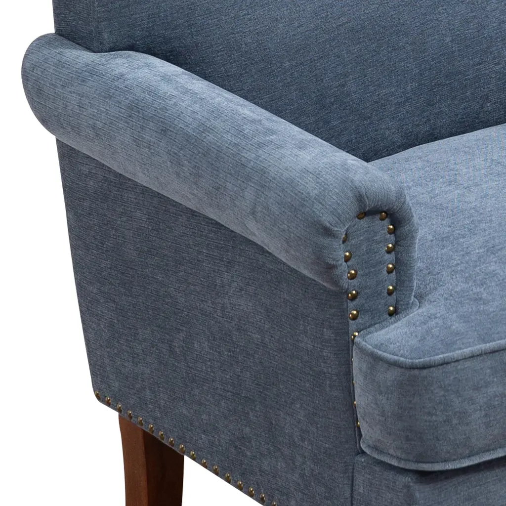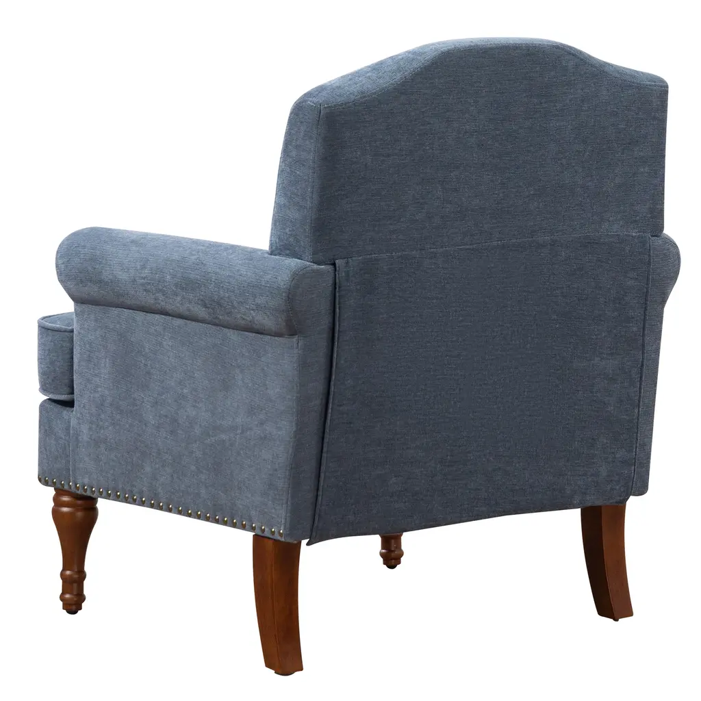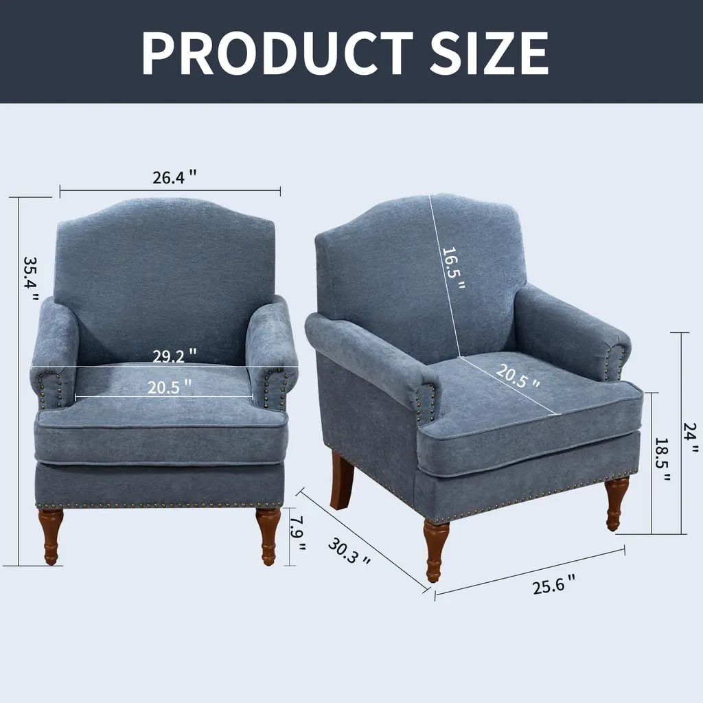 This accent armchair has a solid wooden frame structure. With wooden legs, the entire chair has super sturdiness and durability. It can hold up to 300 pounds.; Designed with your comfort in mind,Made of high quality polyester fabric, this upholstered chair gives you a better seating experience. The backrest and seat cushion filled with high-density sponge provide a high level of comfort and relaxation. Besides, high-elastic springs in the seat cushion offer extra support, comfortable seats that are avoiding collapse after long-time use.; The armrests and backrest, with ergonomic shape, make you feel relaxed while leaning against this chair, helping you relieve spine & neck pressure.; Simple yet elegant design, with nailhead trim and retro wooden legs, adds a touch of charm to your home decoration. You can put this chair in your living room, bedroom or office.; This living room chair comes with all hardware & necessary tools, so you can easily assemble them.