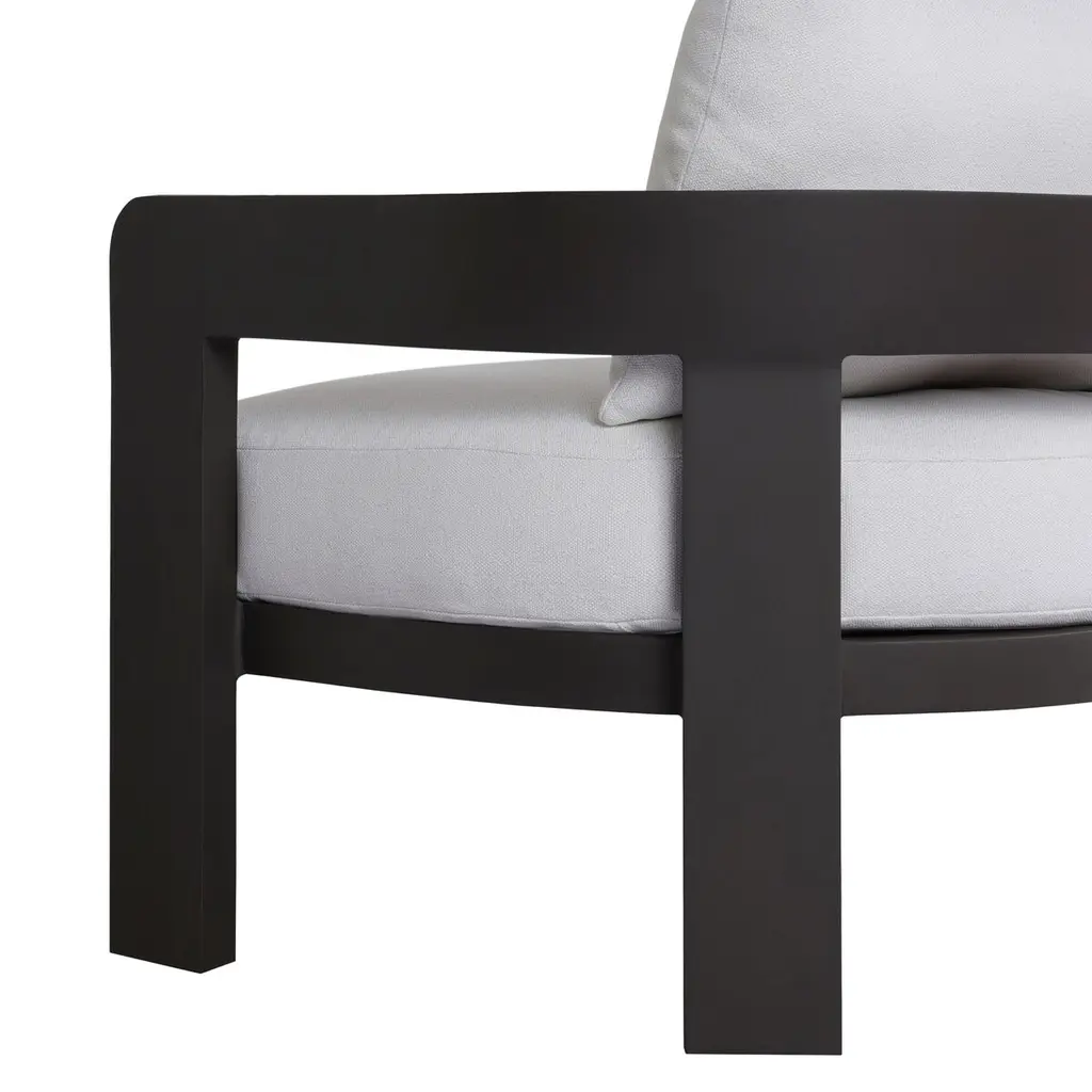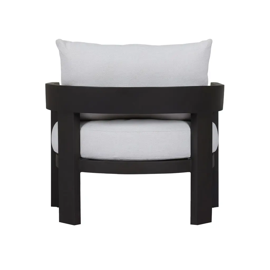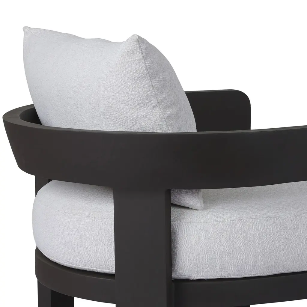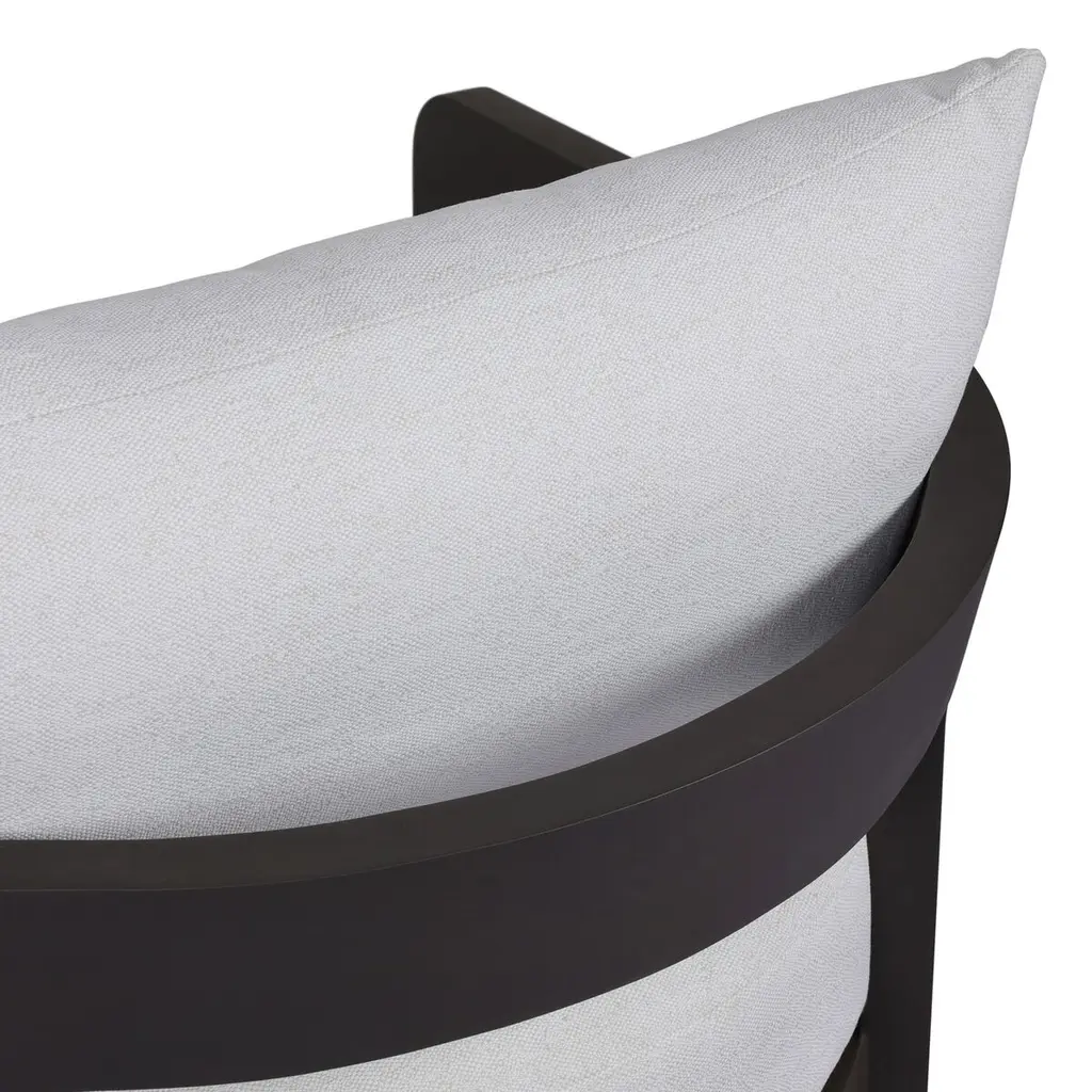 Crisp upholstery and metal framing form a simple barrel back outdoor chair, complemented by softened edges and a fluid shape for a classic look. Perfect for adding elegance to any outdoor setting, this chair is designed to withstand the elements while offering timeless style. Its graceful contours invite relaxation, making it an ideal choice for leisurely afternoons in the open air.