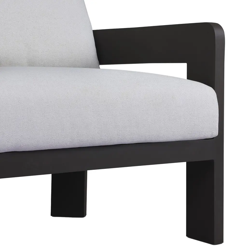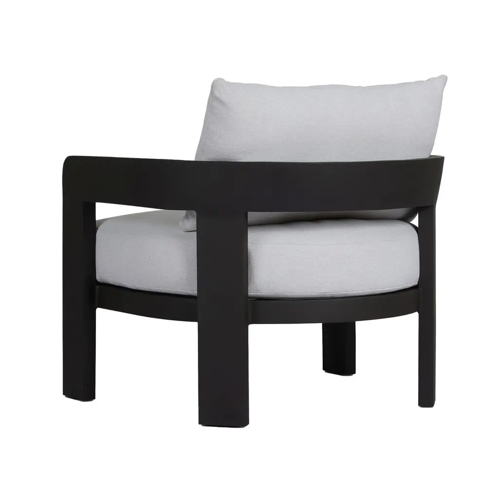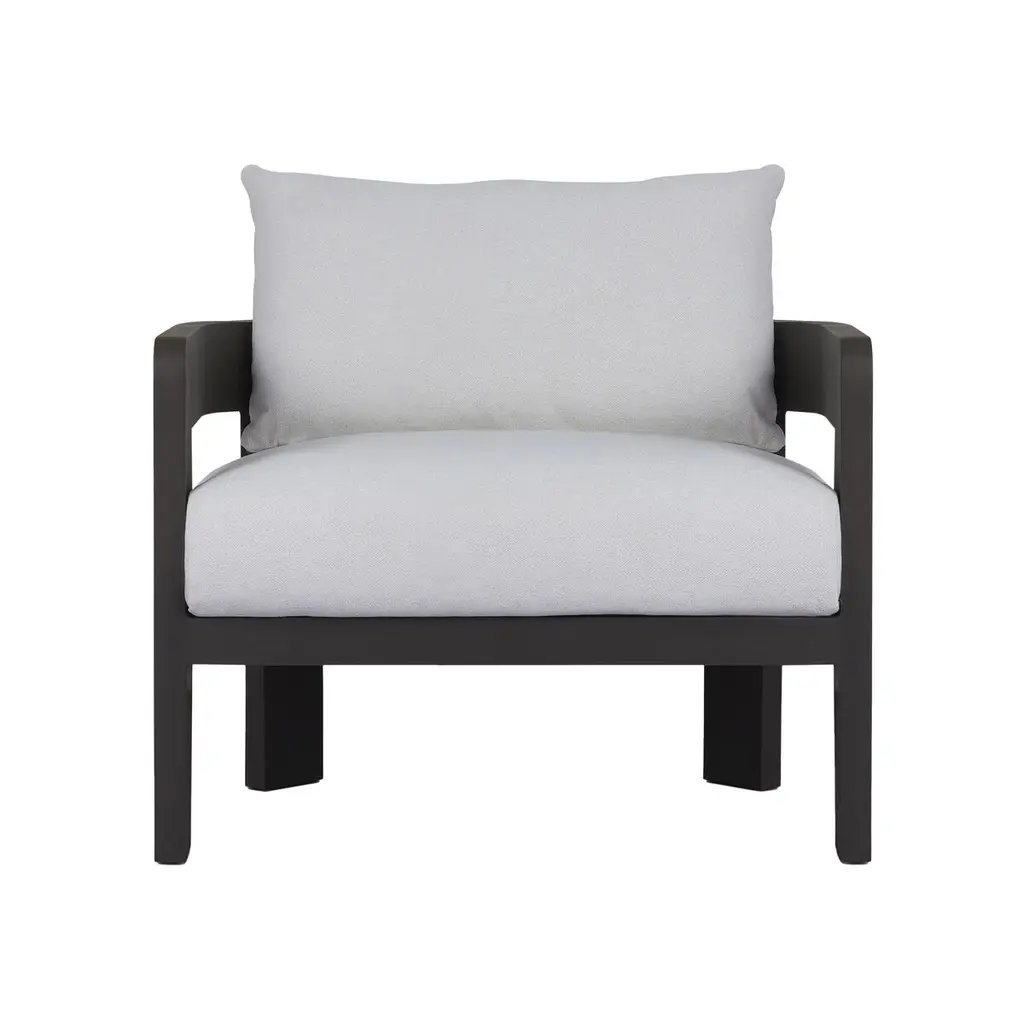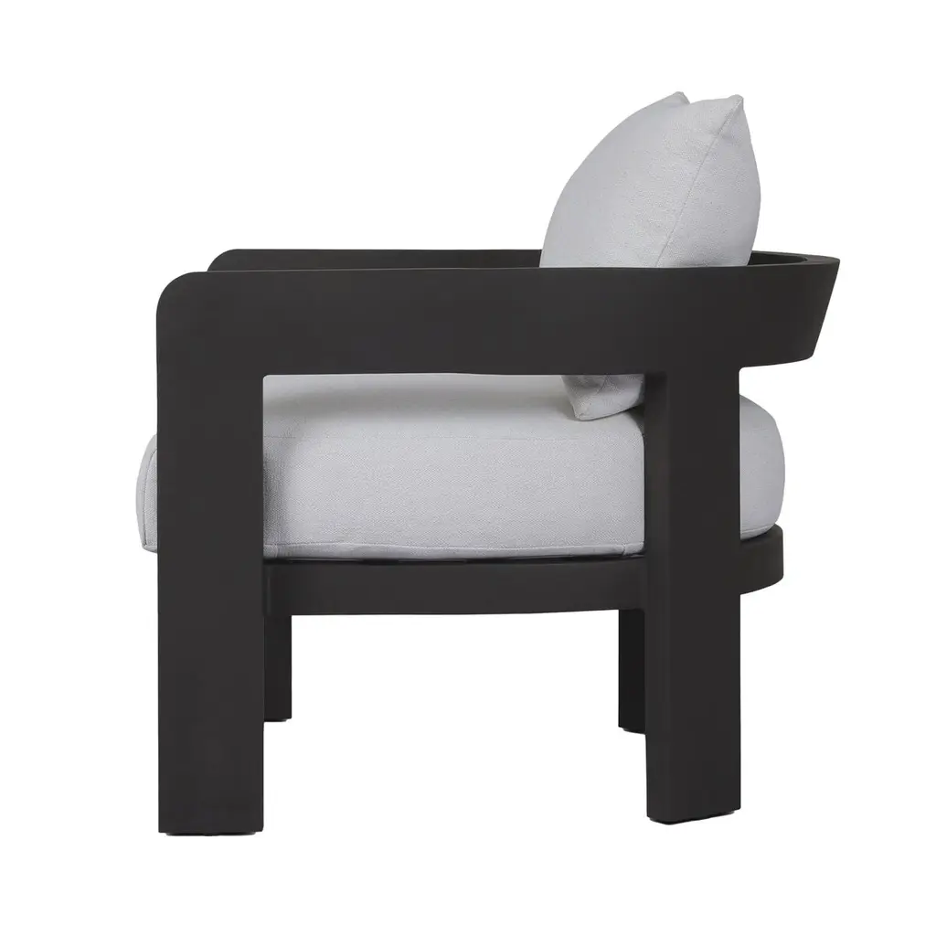 Crisp upholstery and metal framing form a simple barrel back outdoor chair, complemented by softened edges and a fluid shape for a classic look. Perfect for adding elegance to any outdoor setting, this chair is designed to withstand the elements while offering timeless style. Its graceful contours invite relaxation, making it an ideal choice for leisurely afternoons in the open air.