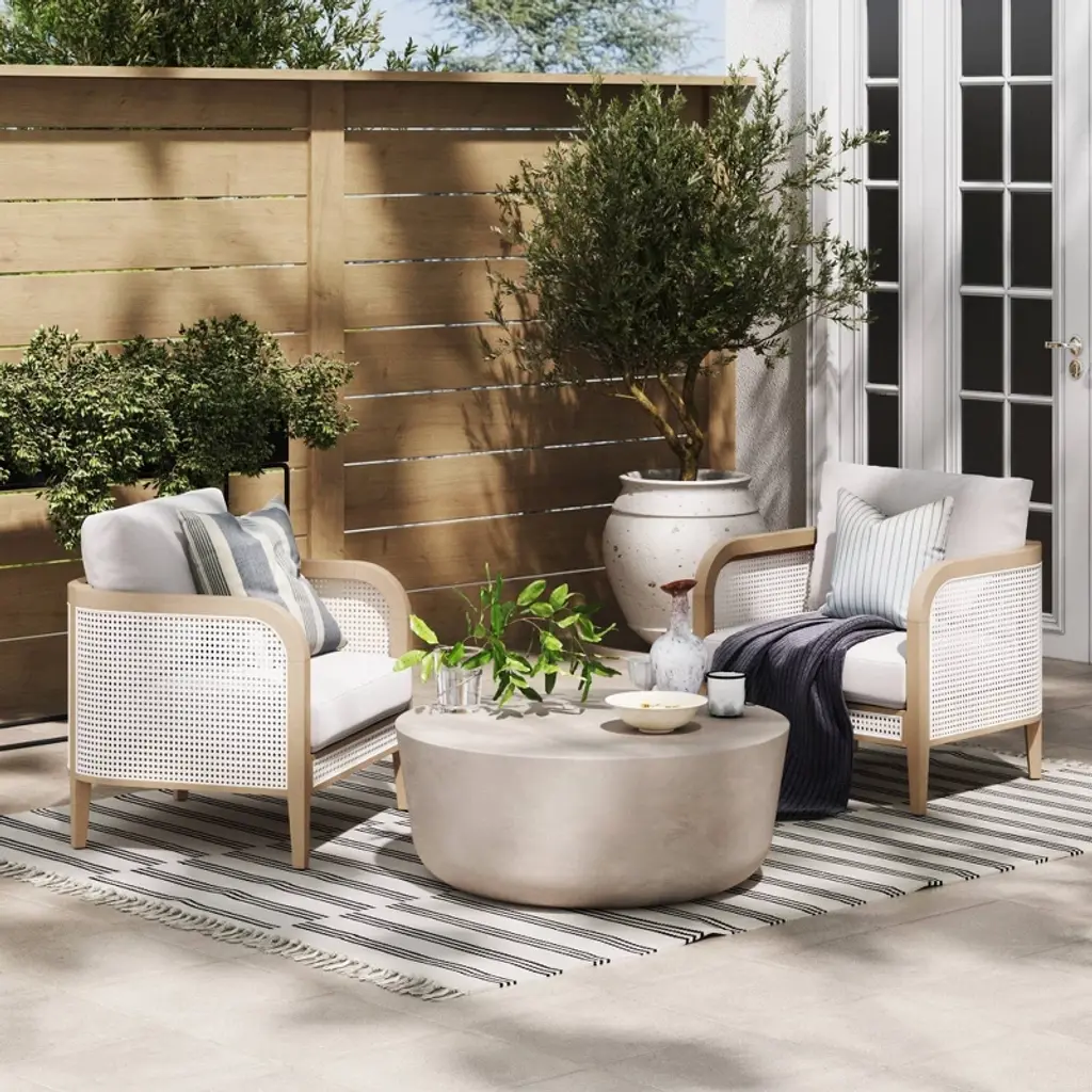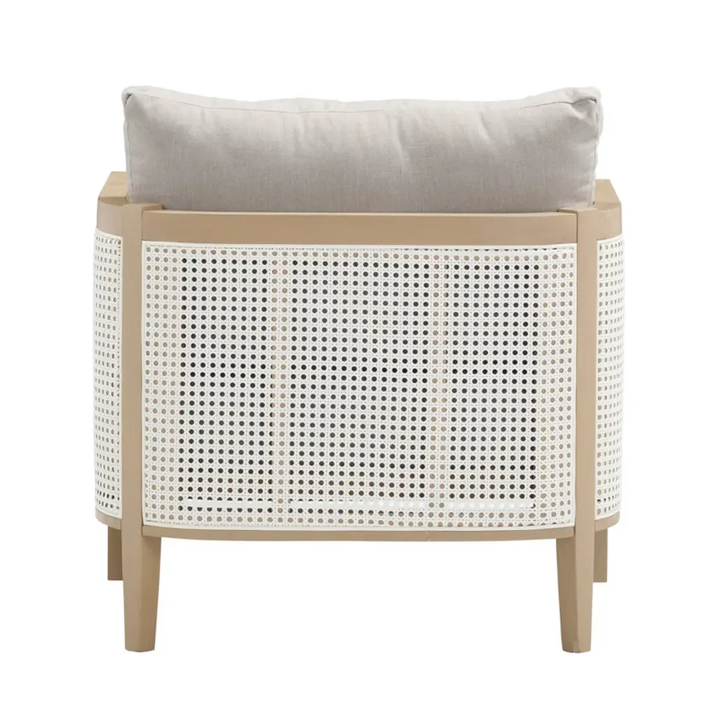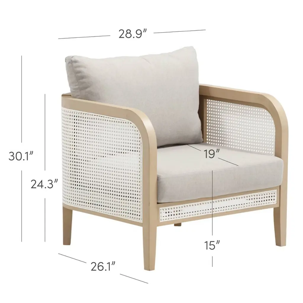 Introducing Twila, a cushioned patio chair in a beautiful bohemian style. This rattan boho chair offers luxurious comfort with its plush cushions, inviting you to unwind and relax in the outdoors. Constructed from weatherproof solid acacia wood with durable rust-proof hardware, the armchair's frame is built to withstand the elements guaranteeing a reliable foundation for years. This patio lounge chair also features cushion covers that are UV, fade, and weather-resistant for that timeless vibrancy through sun, rain, and everything in between. The cushions are removable, too, for easy cleaning and maintenance. And to add to its boho appeal, this upholstered patio chair is adorned with fade-resistant synthetic rattan that effortless visual upgrade. The wicker chair for your patio exudes a timeless charm whether on a cozy patio or nestled in a lush garden. Pair the Twila rattan boho chair with our matching outdoor loveseat for a cohesive seating on your yard or deck.Nathan James is the furniture company built for this generation. You don't need to spend a fortune to get quality design-first furniture and when we say easy assembly, we mean it. Our guarantee is our word. Your purchase is backed by a 100% money-back guarantee. If you have any quality issues just contact us and we will send you a replacement immediately—no questions asked.This product is not recommended for commercial use.Materials:- Acacia wood- Upholstery Fabric- Cane- FoamAssembly Must-Haves:- Packaging carton as working surface Weight Limit:- 300 lbs