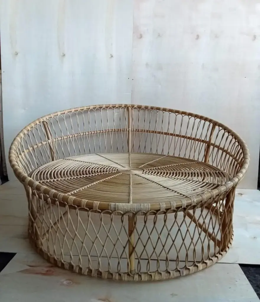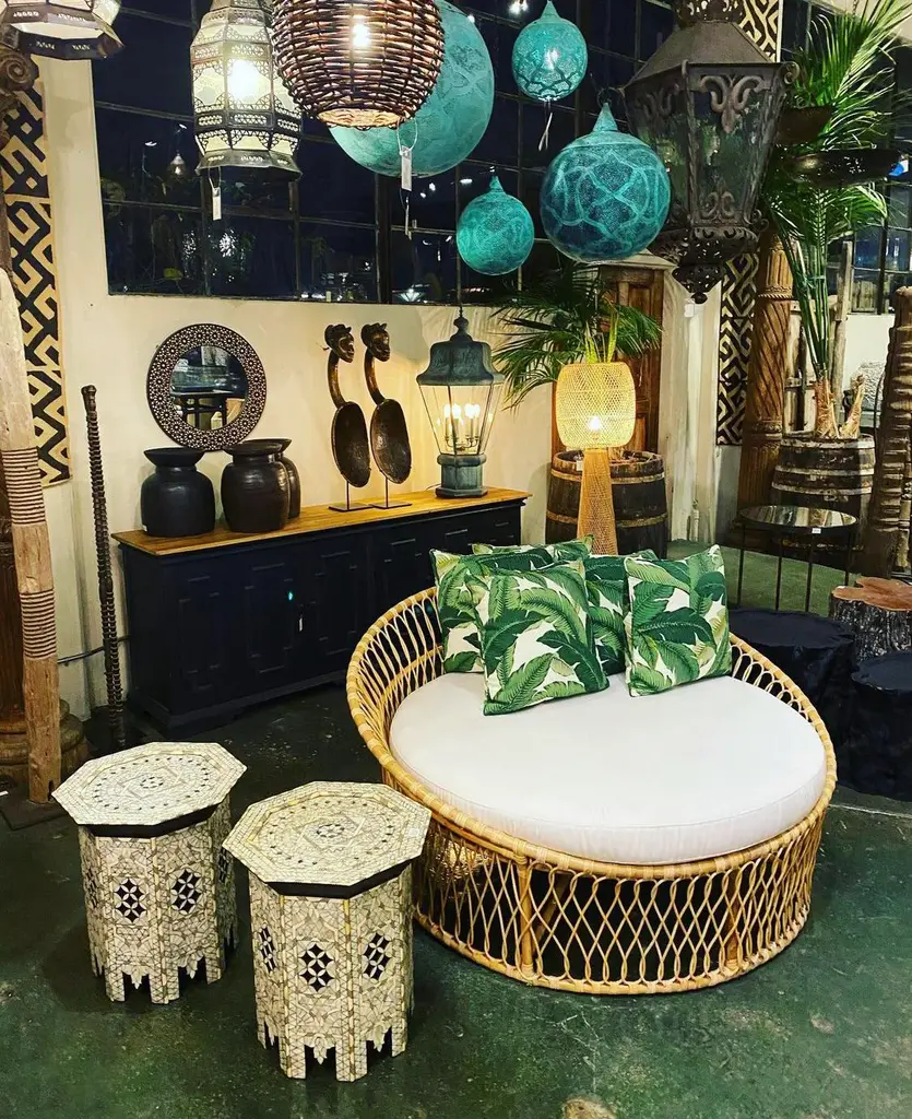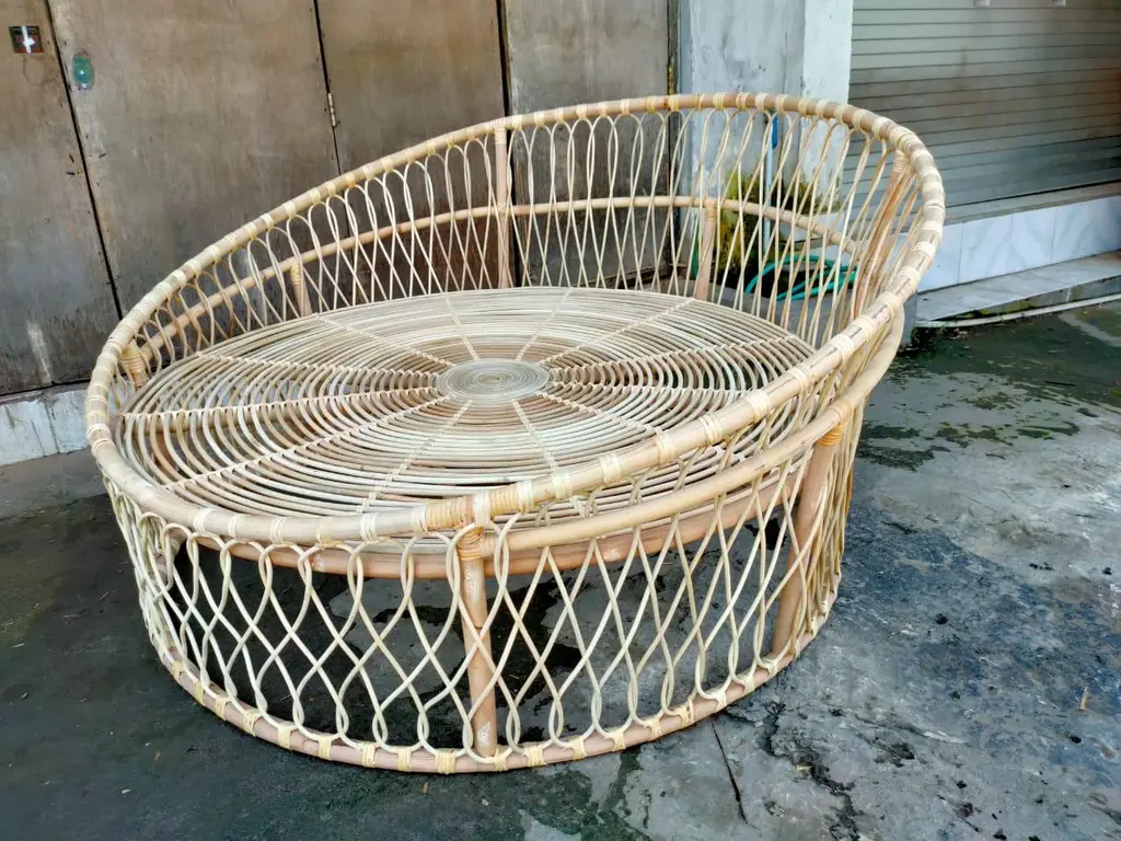 Natural Rada loop hand woven round lounge chair. Beautiful piece for use indoors or outdoors (under covered area recommended). Includes 4" thick white sunbrella cushion. Seat height is 18" with cushion and 14" without. Each piece may vary in exact tones and natural imperfections. Green leaf pillows shown in sub-photo are not included and are sold separately.