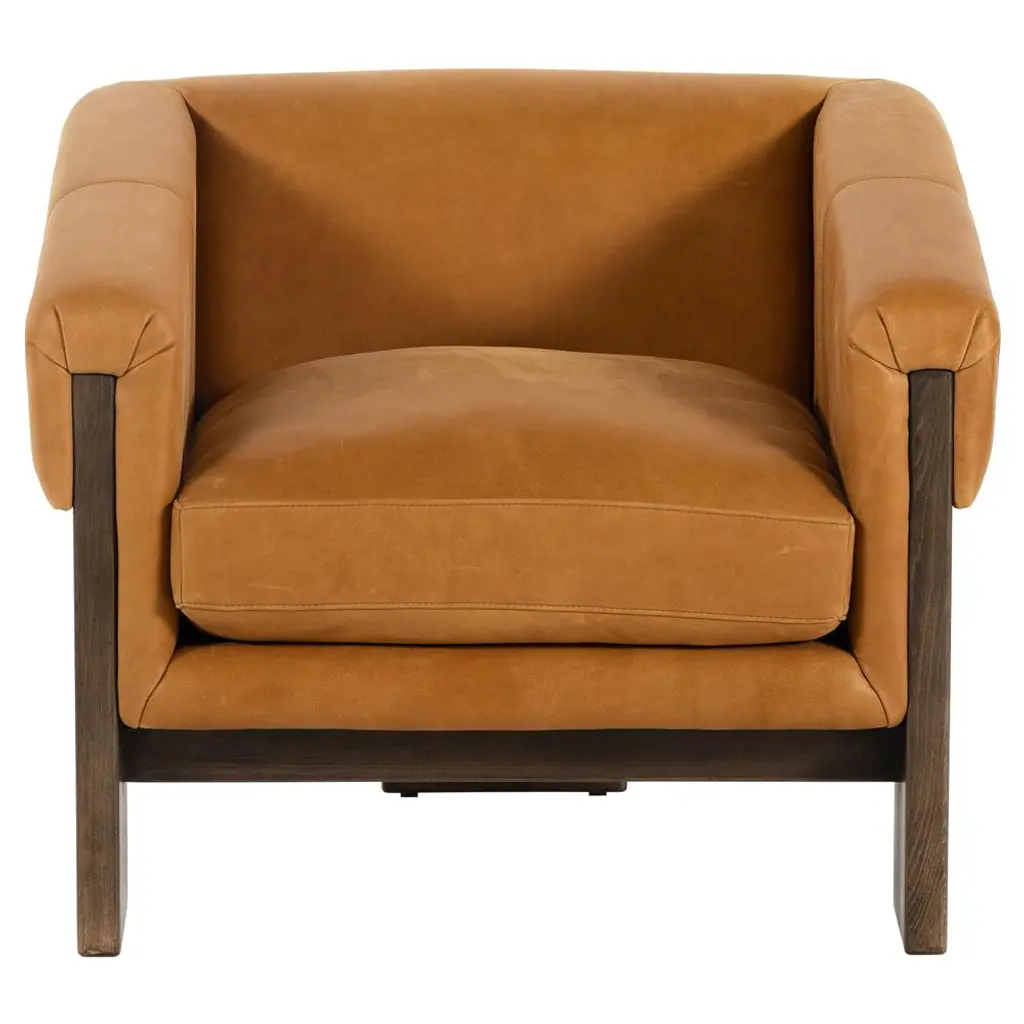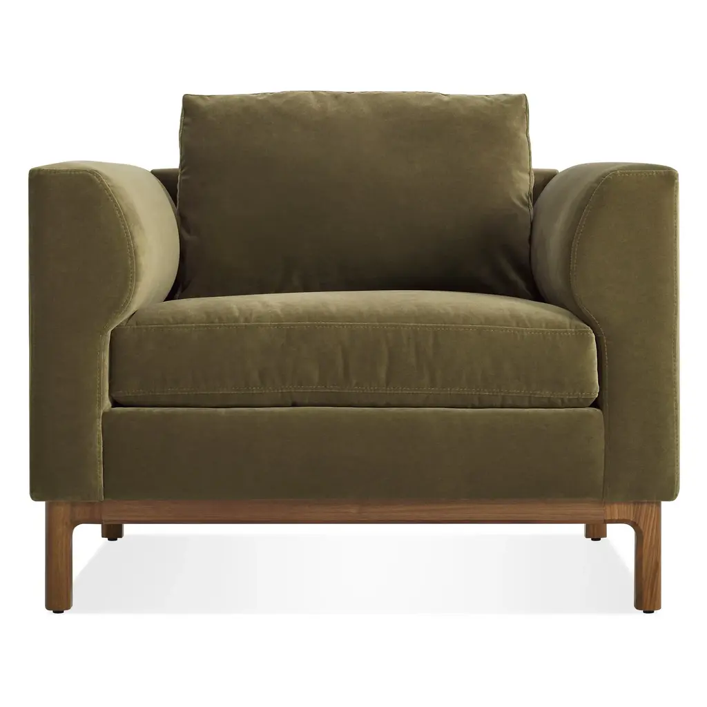 Round out your living room or den with the sleekly curved barrel chair. Made in the USA, it rests atop a wood base that keeps the overall look one of laid-back elegance. The loose seat cushion features a foam core enveloped in sumptuous feathers and down for optimal comfort.
