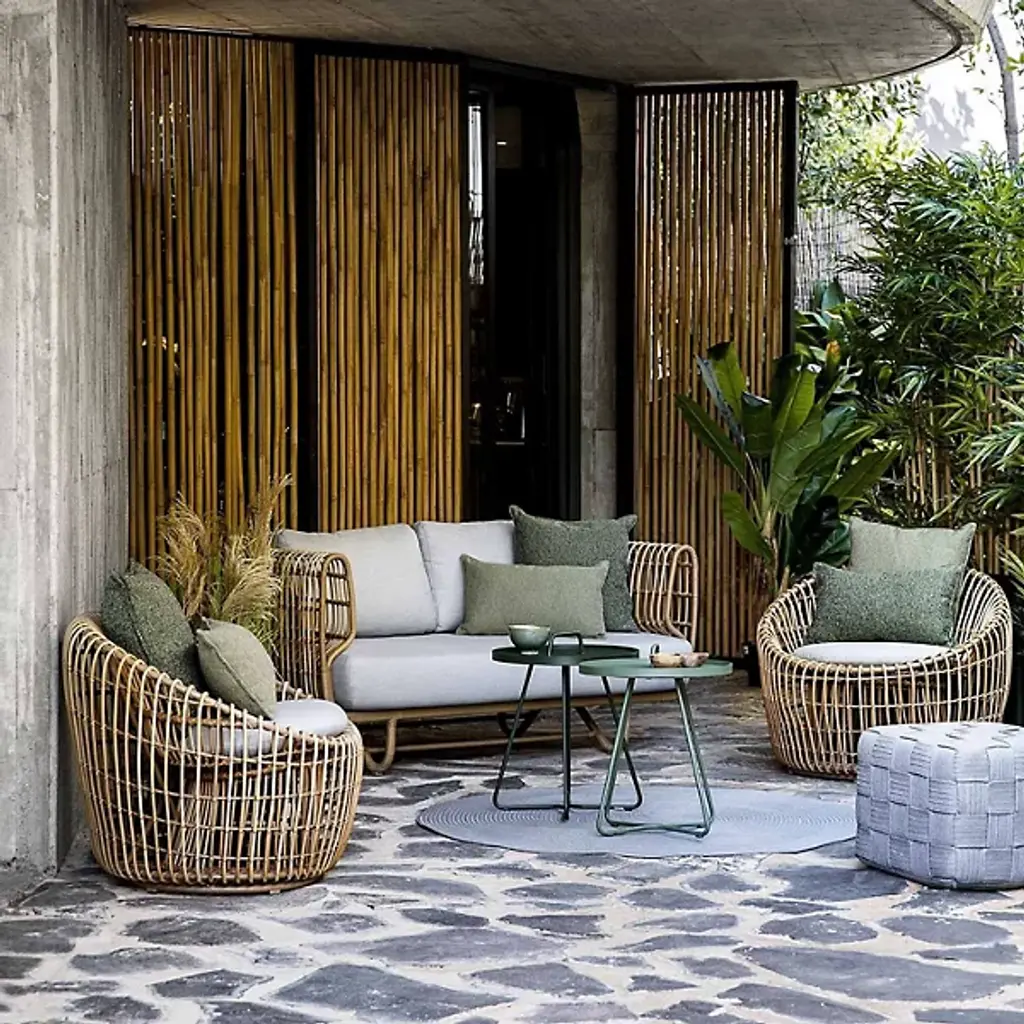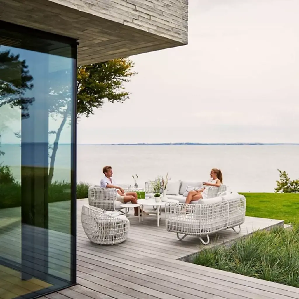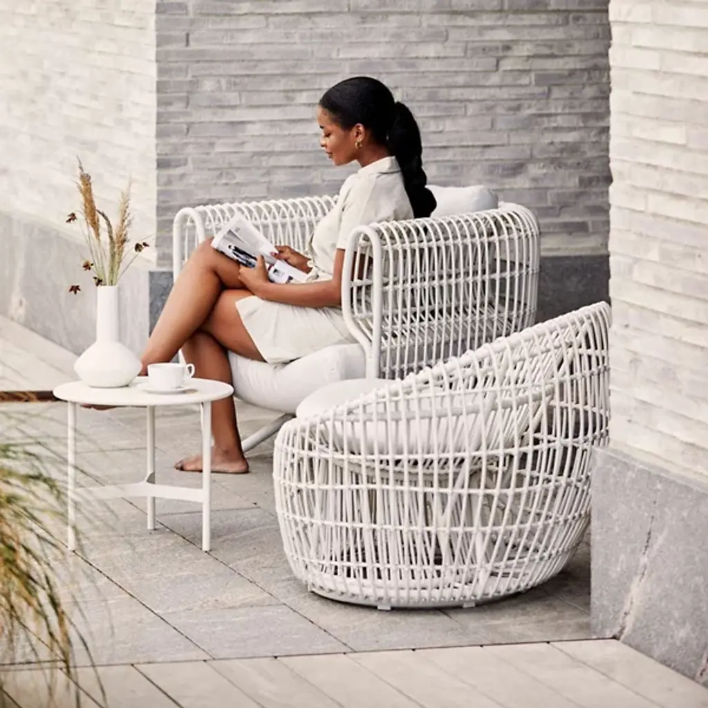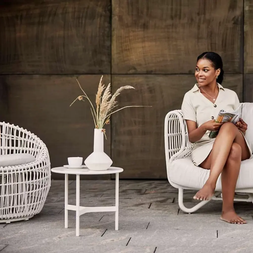 Rest and relax in the comfortable confines of the Nest Outdoor Round Lounge Chair from Cane-line. Designed by Foersom & Hiort-Lorenzen and made in Indonesia, it uses a sturdy aluminum frame further accented by Cane-line Weave to create a natural appearance with practical reinforcement. The weave and frame form the shape of a flaring, bevel-cut cylinder, offering back and arm support with the appearance of organic wireframe, while the round seat cushion offers a contrasting, opaque note.