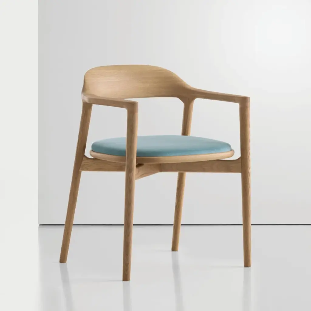 Neve armchair inventively plays with curves and lines, bringing subtle beauty to the archetypal wooden armchair. Sculpted from solid wood, a crossed wooden base accents the curved frame and backrest, evolving poetically from an organic to a geometric shape at the end of the armrests. The cushioned seat provides a central retreat, sheltered by the solid frame.