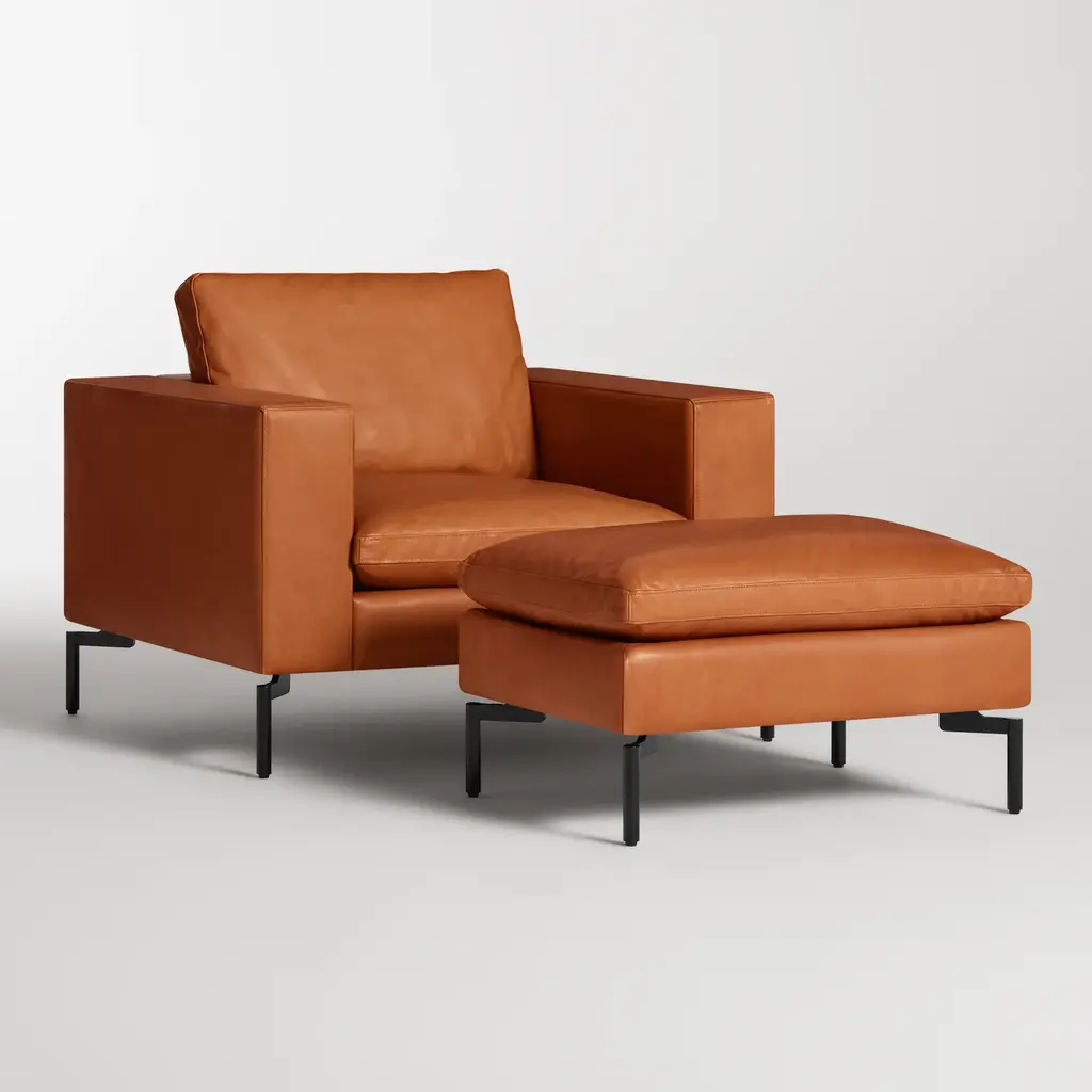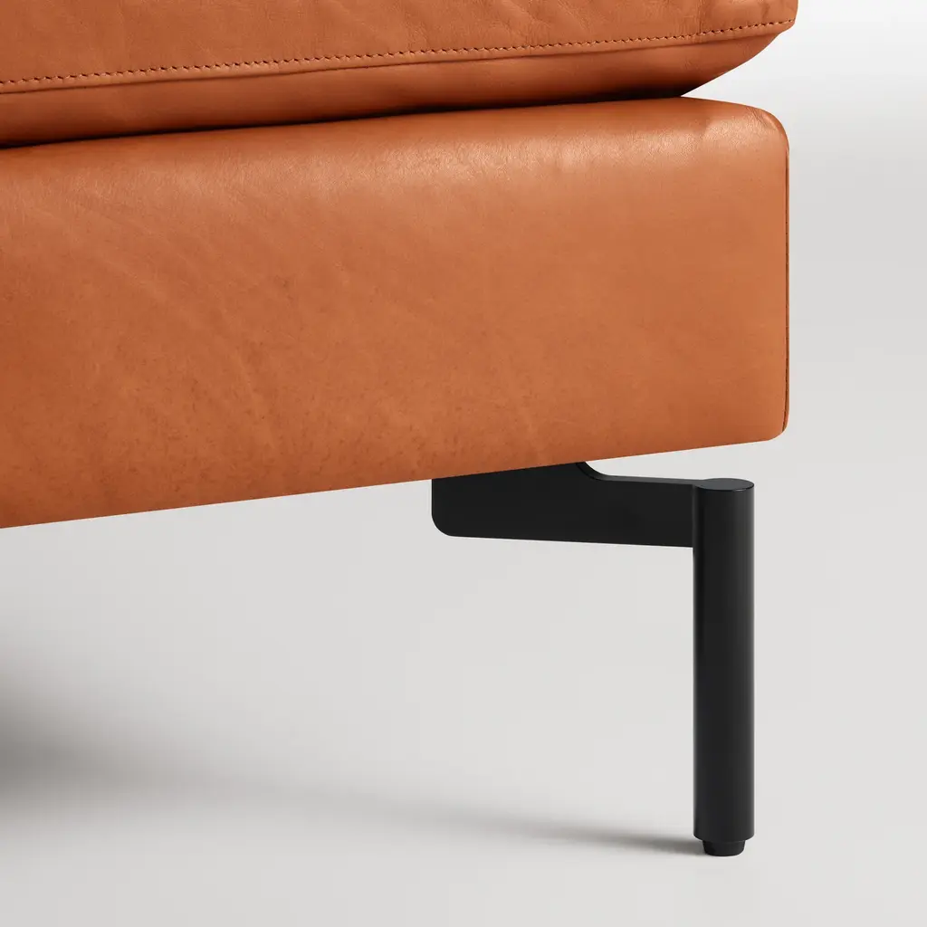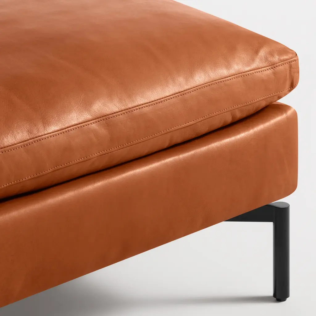 Sometimes it is not about starting from scratch, but rather revisiting past designs and making them better. The New Standard modern ottoman is simplicity at its best with a twist. Now new and improved. Wide arms and inviting loose cushions all come together with tuned proportions and show stopping legs.