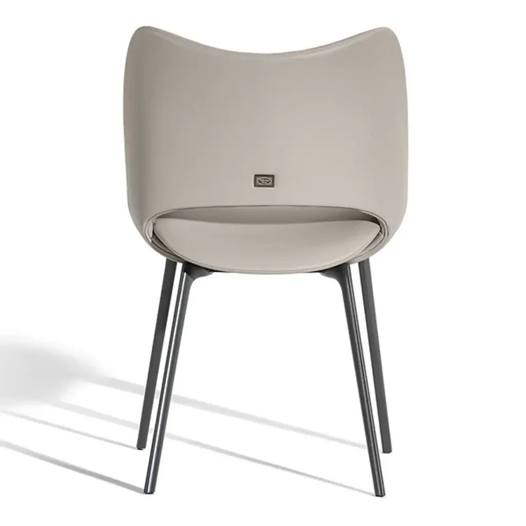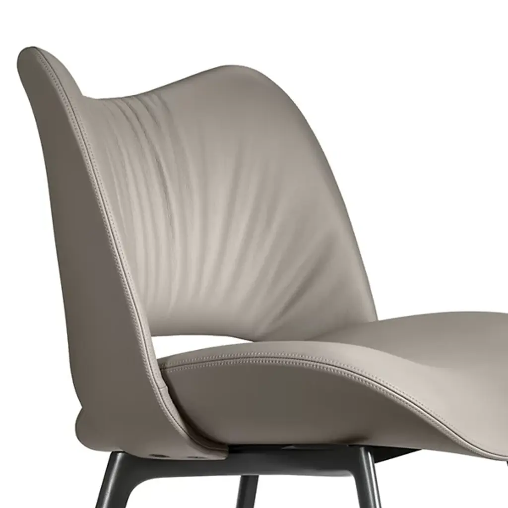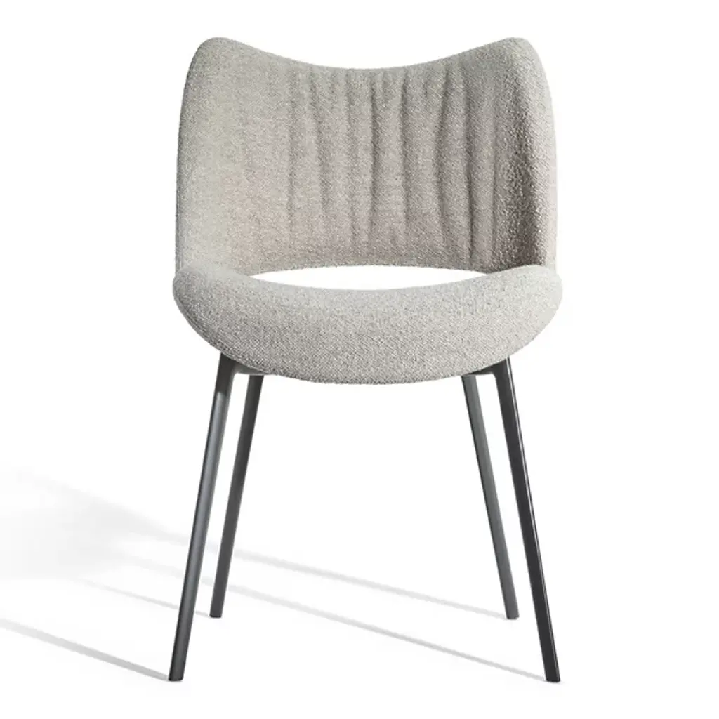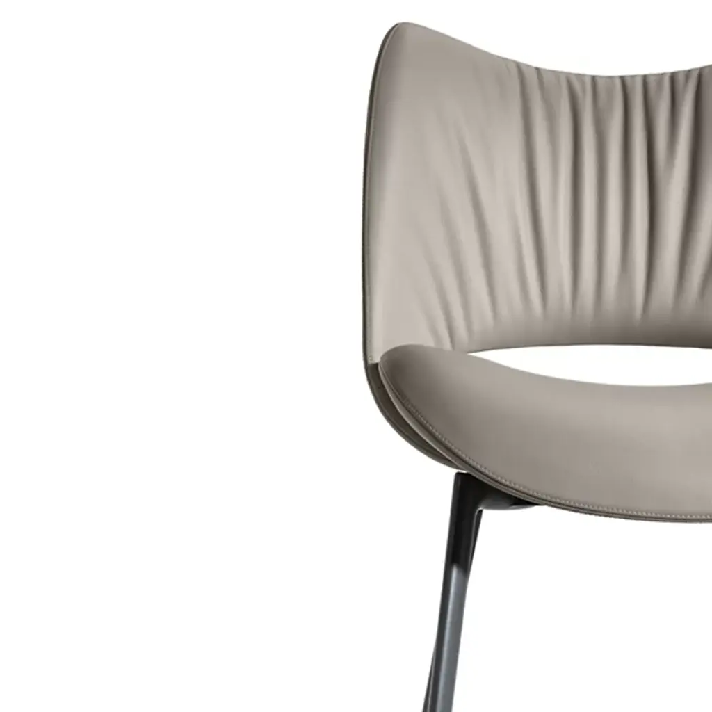 Pairing curving modernity with contemporary simplicity, the Nice Armchair from Poltrona Frau is at once compact and clever. Designed to place its occupant at table height, this expressive GamFratesi design is made in Italy. It extends from slender, angular metal legs in a harmonious array, intersecting to elevate a scooping seat and back that offer encompassing support ideal for commercial or domestic space. The curving back and seat feature a small cutaway, the signature element of the seat that adds an airy accent to the otherwise opaque form. The inspired final product of intricate technical designs, the soft upholstery is artisan-stitched and stretched over soft foam cushioning, creating an exceptional and welcoming design with an unforgettable silhouette