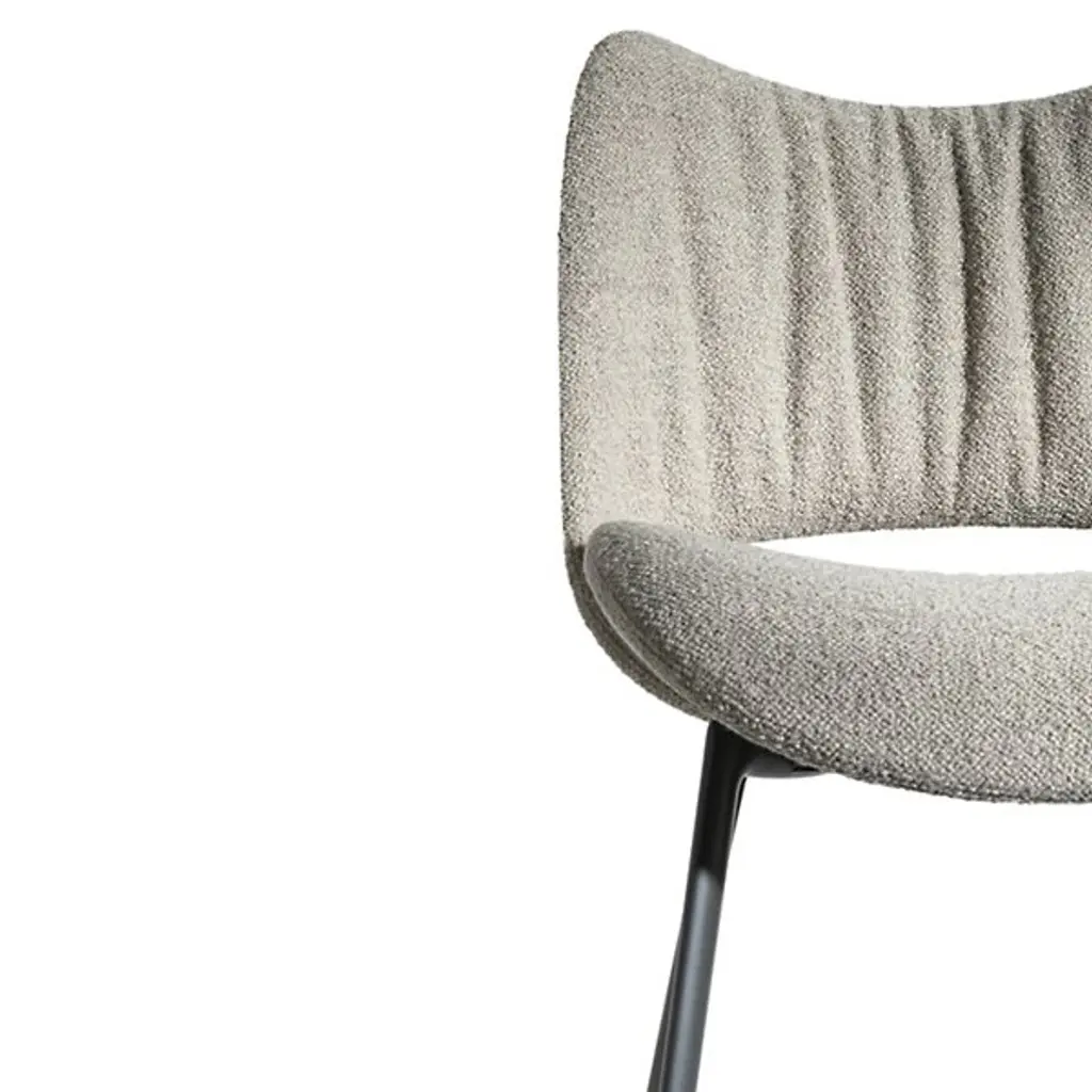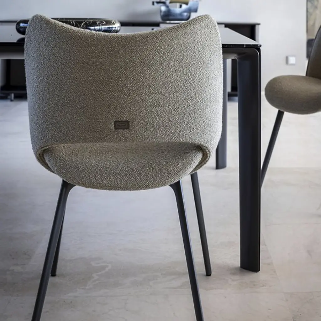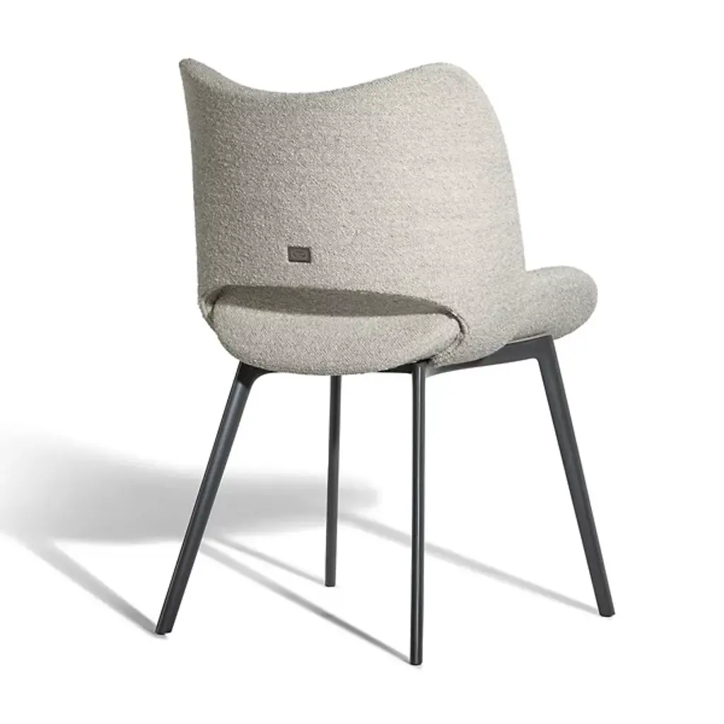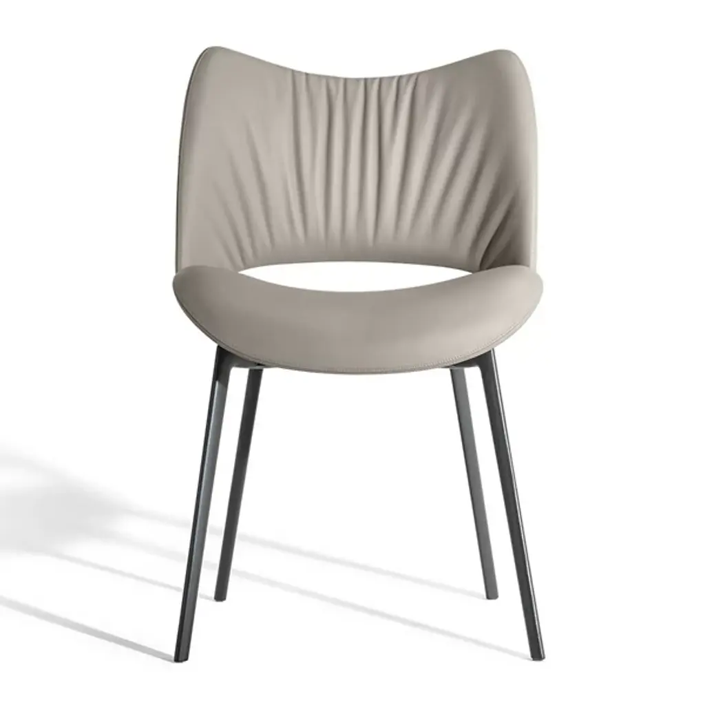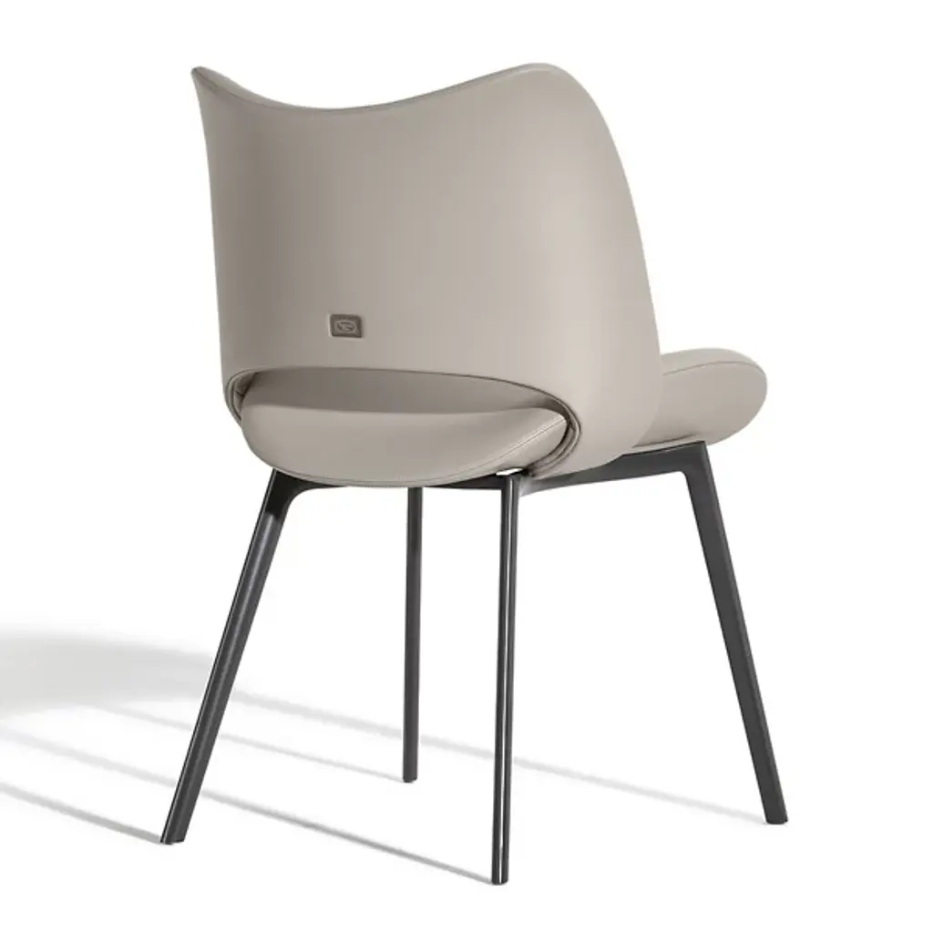 Pairing curving modernity with contemporary simplicity, the Nice Armchair from Poltrona Frau is at once compact and clever. Designed to place its occupant at table height, this expressive GamFratesi design is made in Italy. It extends from slender, angular metal legs in a harmonious array, intersecting to elevate a scooping seat and back that offer encompassing support ideal for commercial or domestic space. The curving back and seat feature a small cutaway, the signature element of the seat that adds an airy accent to the otherwise opaque form. The inspired final product of intricate technical designs, the soft upholstery is artisan-stitched and stretched over soft foam cushioning, creating an exceptional and welcoming design with an unforgettable silhouette