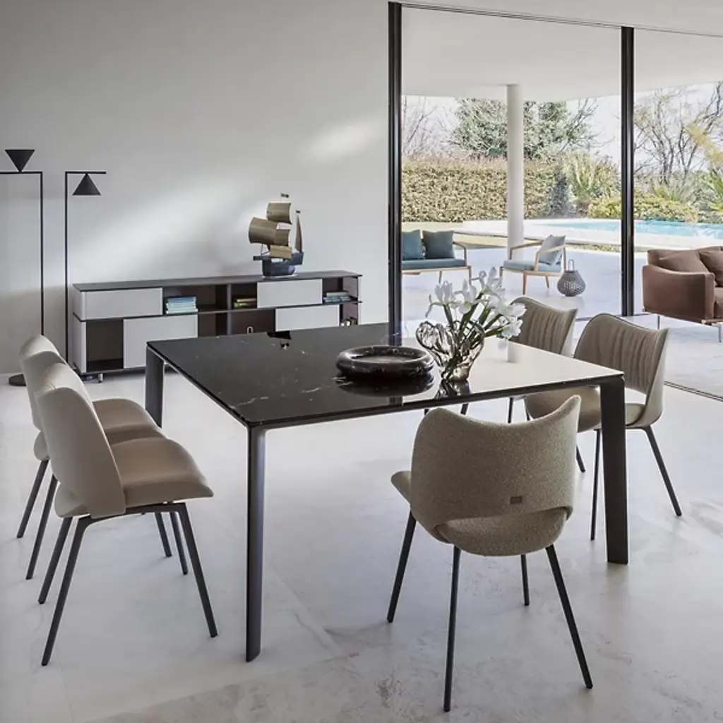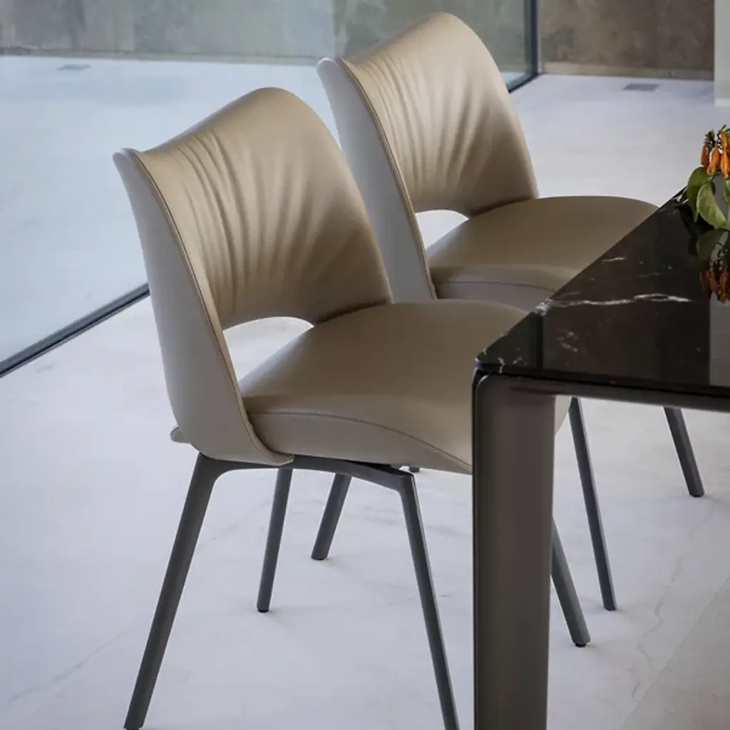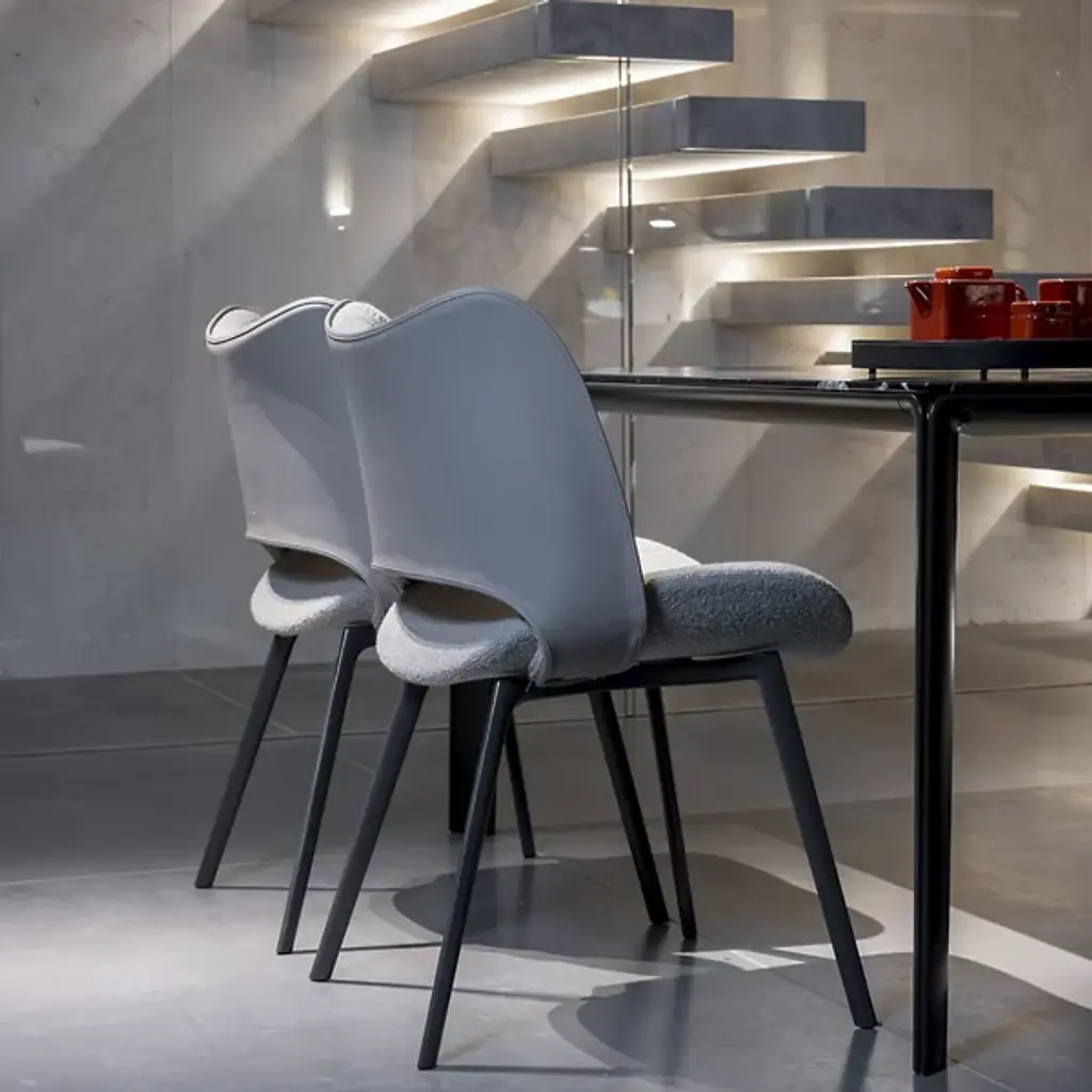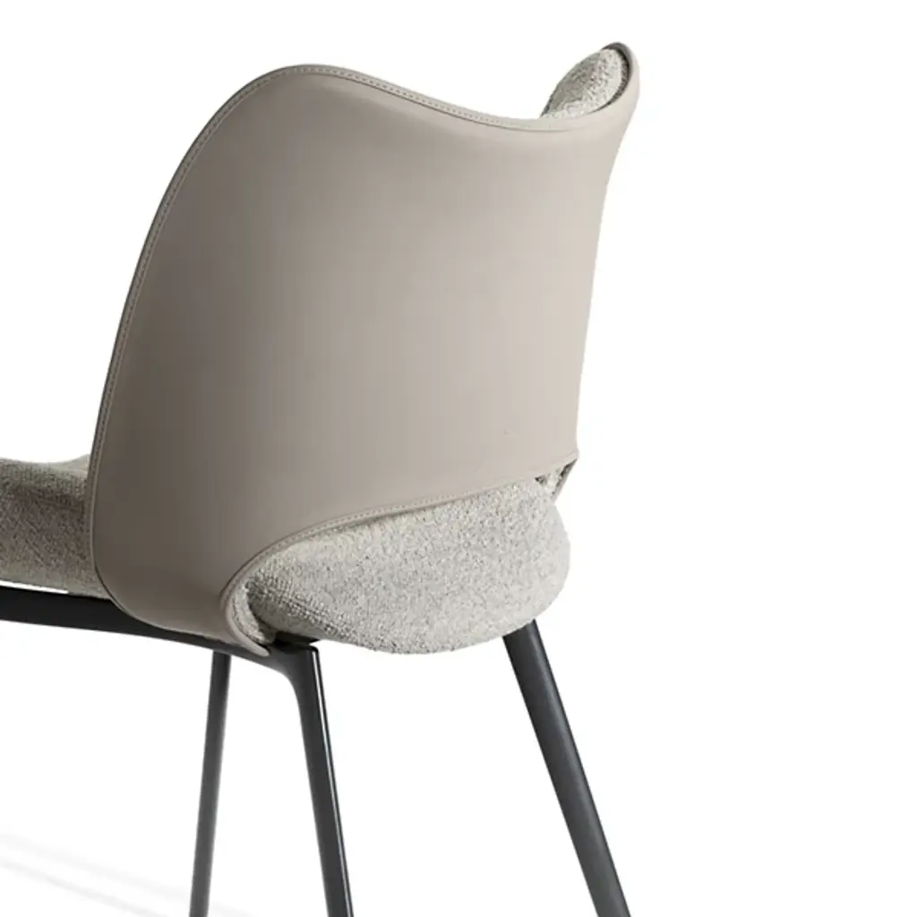 Pairing curving modernity with contemporary simplicity, the Nice Armchair from Poltrona Frau is at once compact and clever. Designed to place its occupant at table height, this expressive GamFratesi design is made in Italy. It extends from slender, angular metal legs in a harmonious array, intersecting to elevate a scooping seat and back that offer encompassing support ideal for commercial or domestic space. The curving back and seat feature a small cutaway, the signature element of the seat that adds an airy accent to the otherwise opaque form. The inspired final product of intricate technical designs, the soft upholstery is artisan-stitched and stretched over soft foam cushioning, creating an exceptional and welcoming design with an unforgettable silhouette