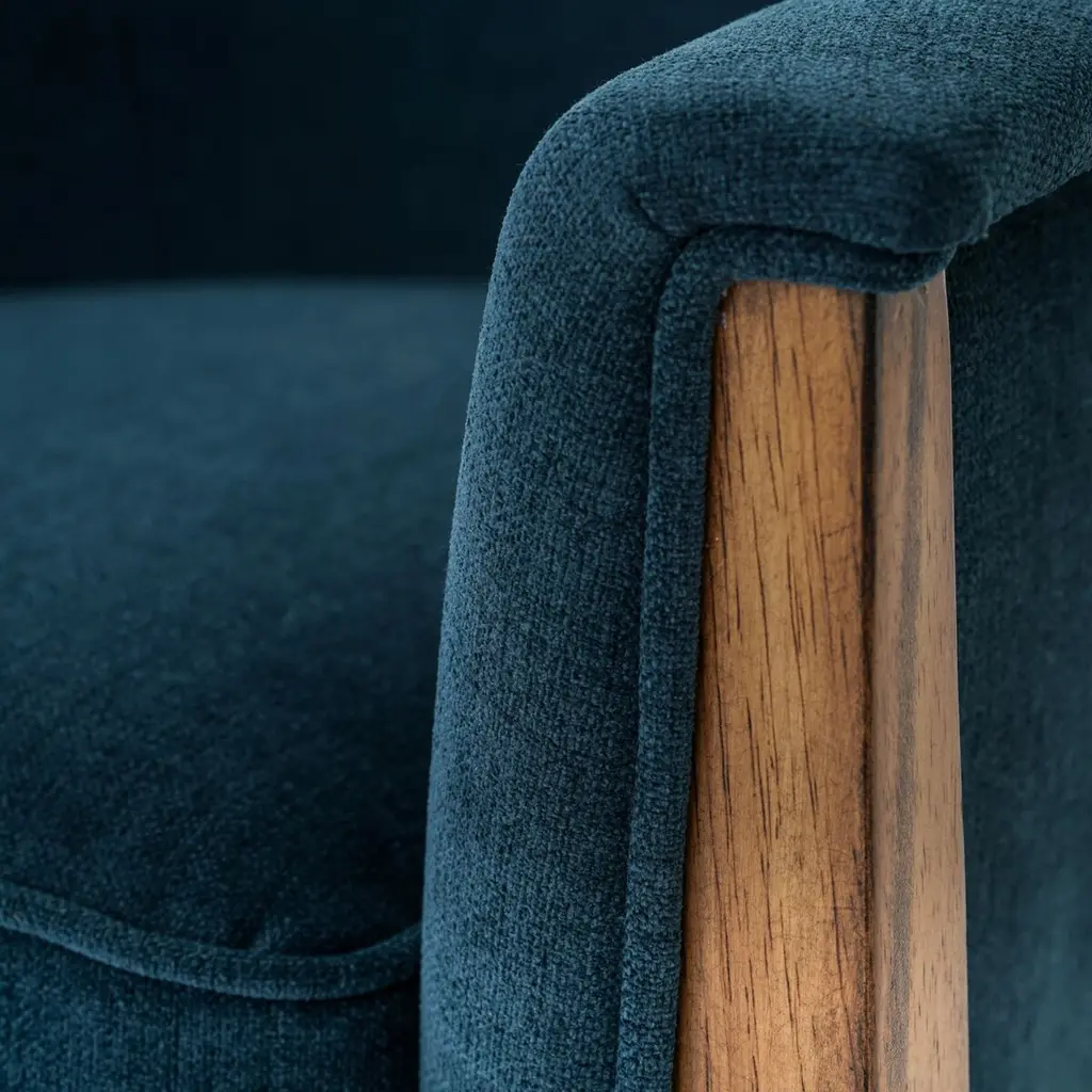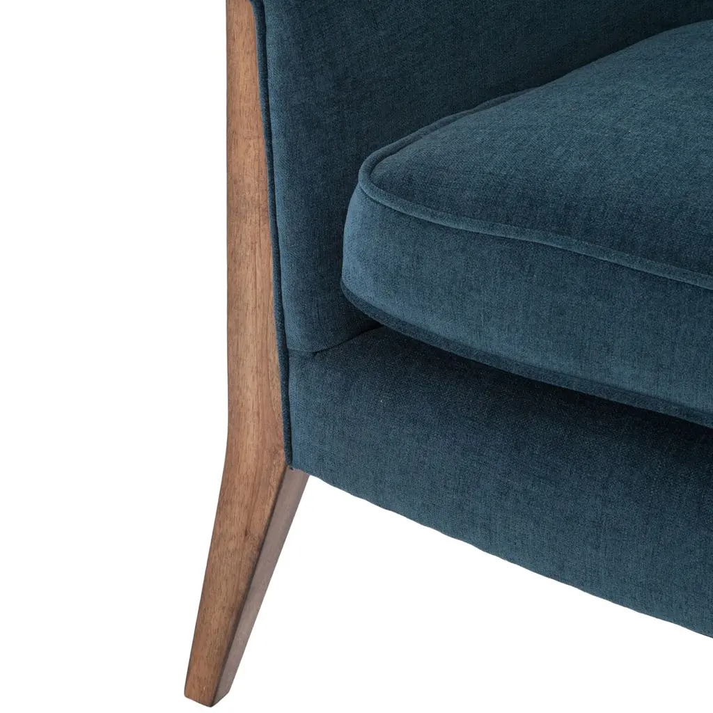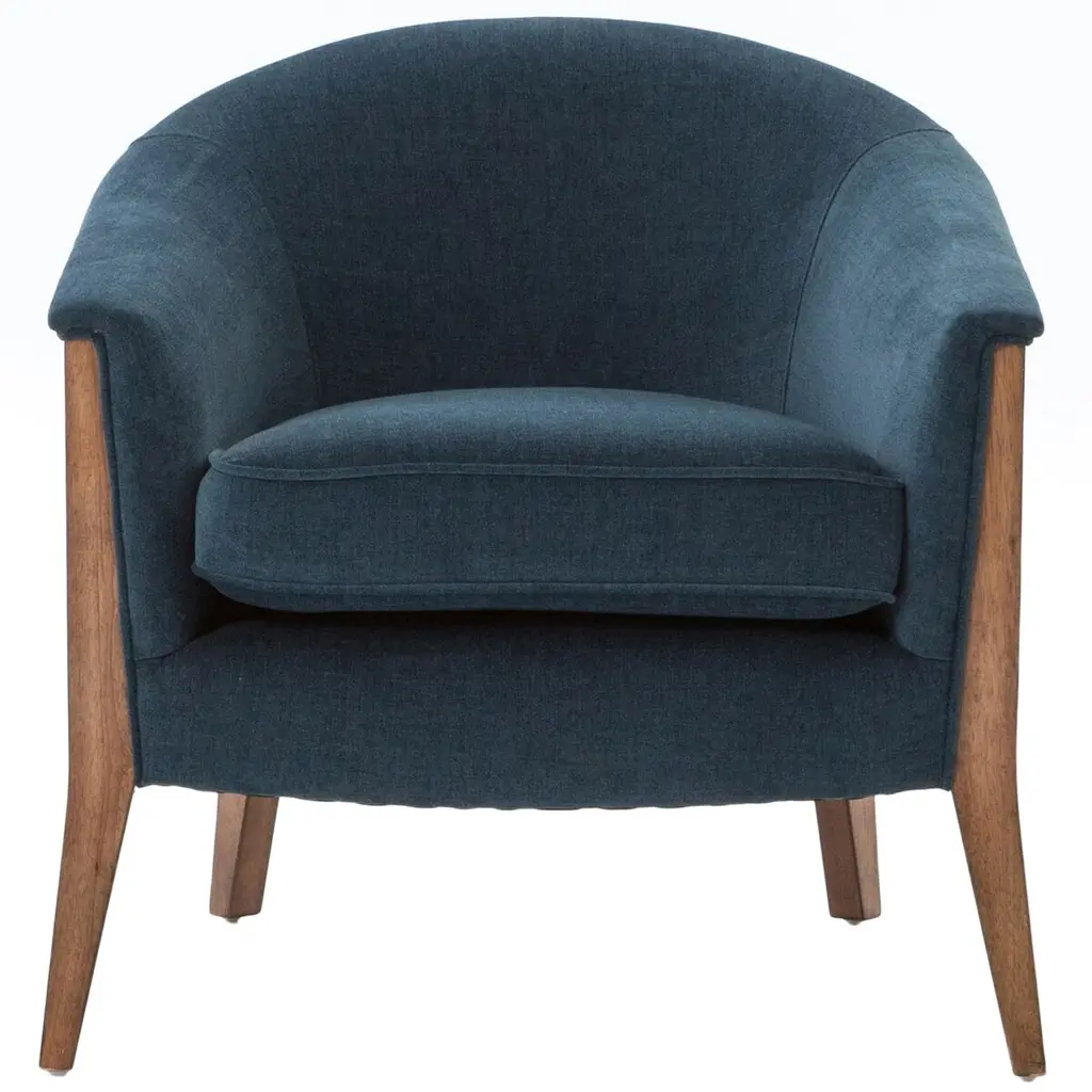 French Deco elegance inspired this chair's sleek curves and unexpected angles. Complementing the parawood legs is stain-resistant performance fabric in a rich blue; because the upholstery has a 25,000 rub rate, it will withstand daily use. S-spring seat construction ensures long-lasting comfort.