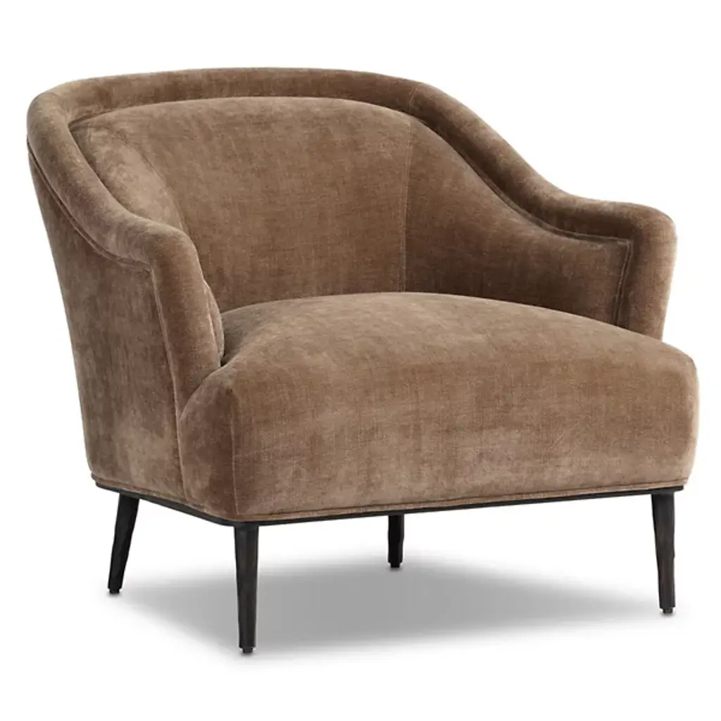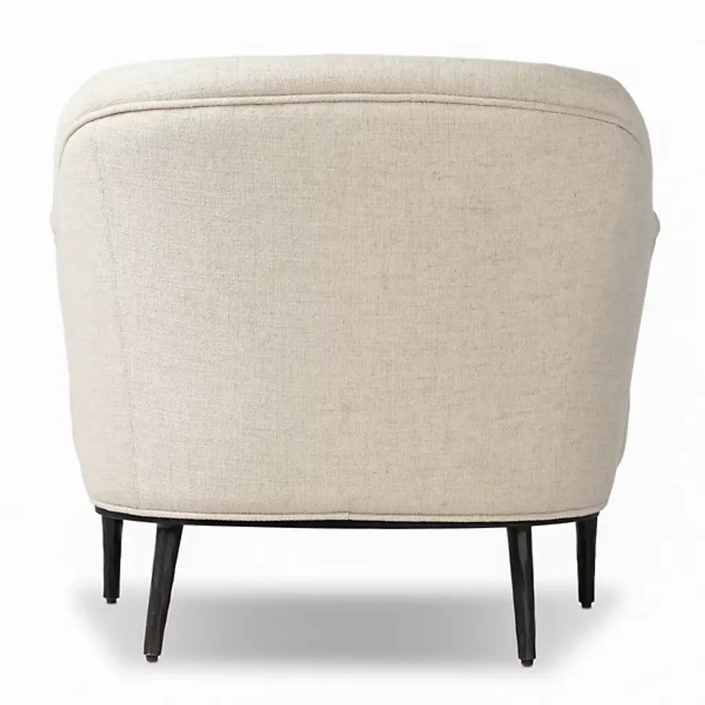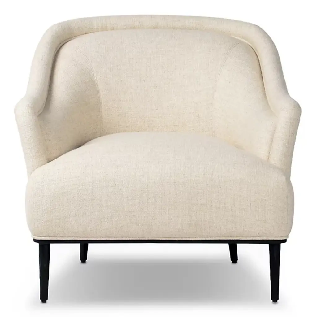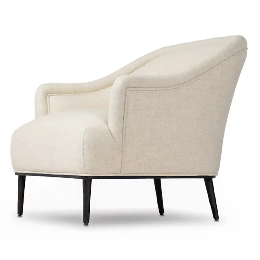 The Noel Lounge Chair from Four Hands wraps generously scaled upholstery around a curved back that flows seamlessly into protective arms. This enveloping profile creates intimate seating that shields the occupant while maintaining open sight lines throughout the room. Polyester fabric covers the entire form in consistent texture while slim iron legs provide structural support that nearly disappears beneath the substantial cushioning. The oversized proportions prioritize comfort without sacrificing the clean geometric lines that define contemporary furniture aesthetics.