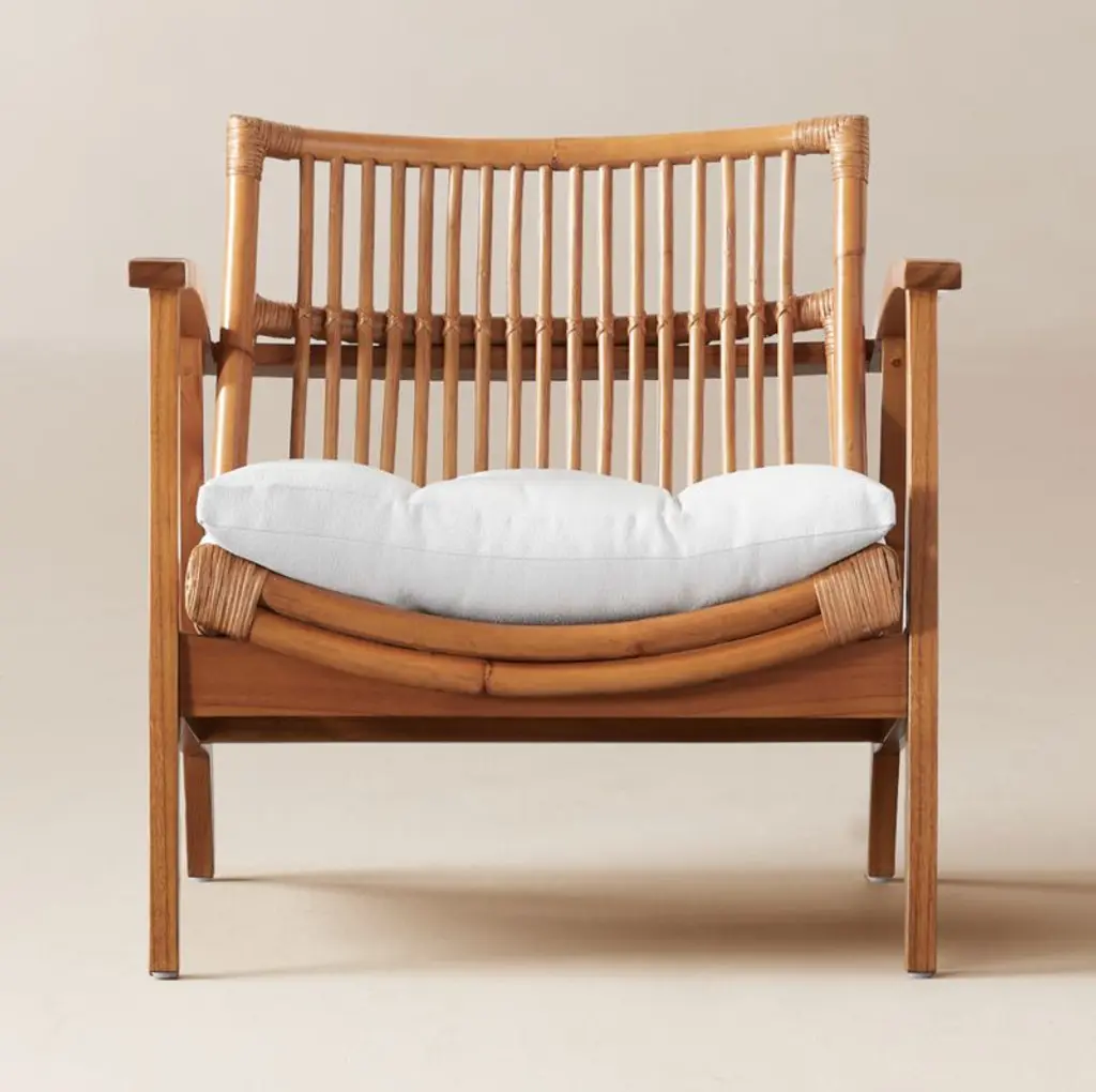 Mindi wood and rattan lounge chair brings alfresco vibes indoors. Warm mindi wood frames a strong silhouette, while Indonesian rattan curves to shape the back and seat. White seat cushion is extra-plush and discreetly fastens with velcro straps to keep from sliding. CB2 exclusive.