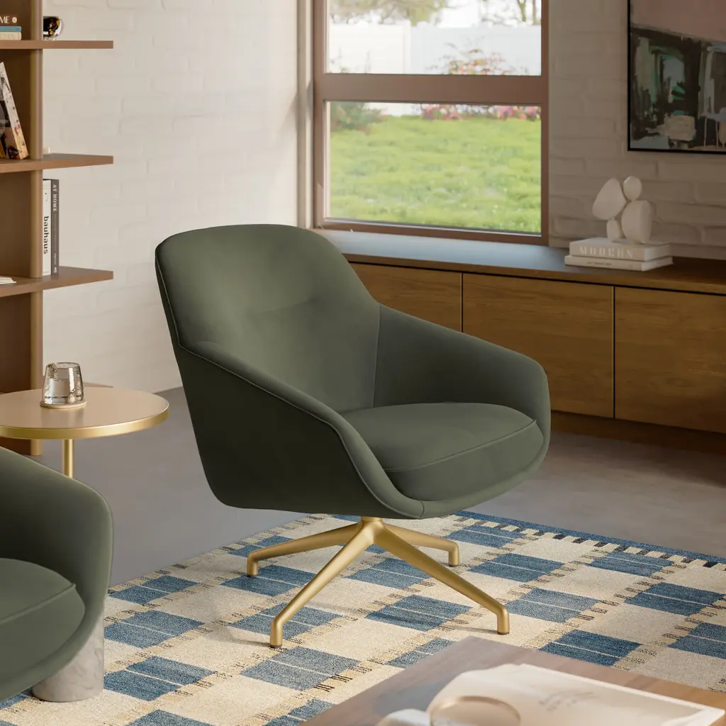 Not Lounge is a padded and upholstered fabric armchair with a trestle base.A large enveloping shell encloses the seat in a soft embrace.The stitching defines and designs the soft lines, providing an elegant and versatile look. Suitable for conference rooms and relaxation areas in hotels and residences. The Not family of seats, characterized by a large enveloping shell and an elegant and versatile look, has been expanded with two new versions: the Lounge, with more generous dimensions where comfort is in the foreground and the Mini, more compact and with new bases that extend the possibilities of use to new environments.The Not collection is conceived to become an oasis of relaxation for body and mind and is available in several options with different backrest heights and with the option of a revolving base and an extra ottoman as well.A very flexible product that can fit inside different kind of spaces, from a reading spot in a house to public spaces and lounges.