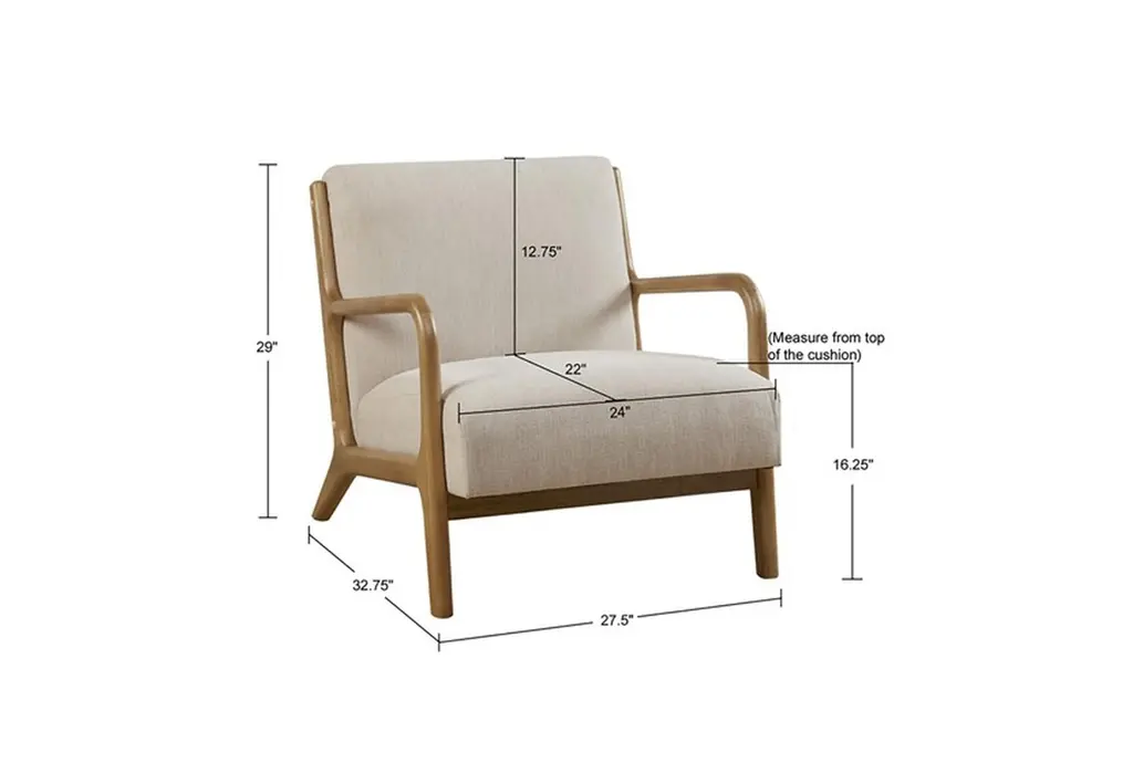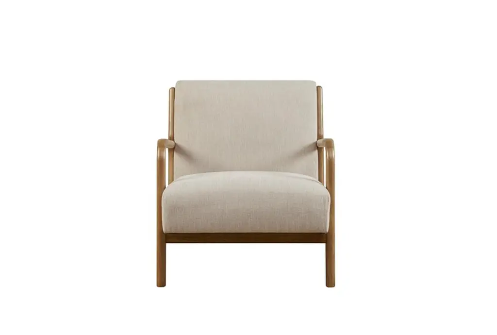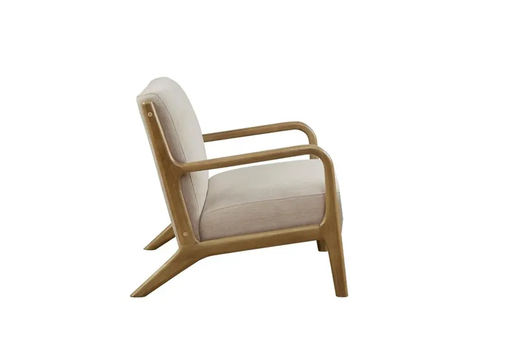 The Novak Cream White Fabric Accent Arm Chair brings modern comfort to your living room. Upholstered in soft polyester fabric, this chair features a tight back and solid wood arms for reliable support. The elm wood finish adds a natural touch to its minimalistic design.