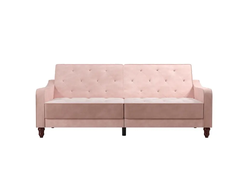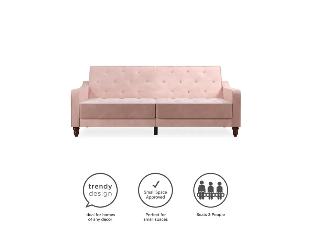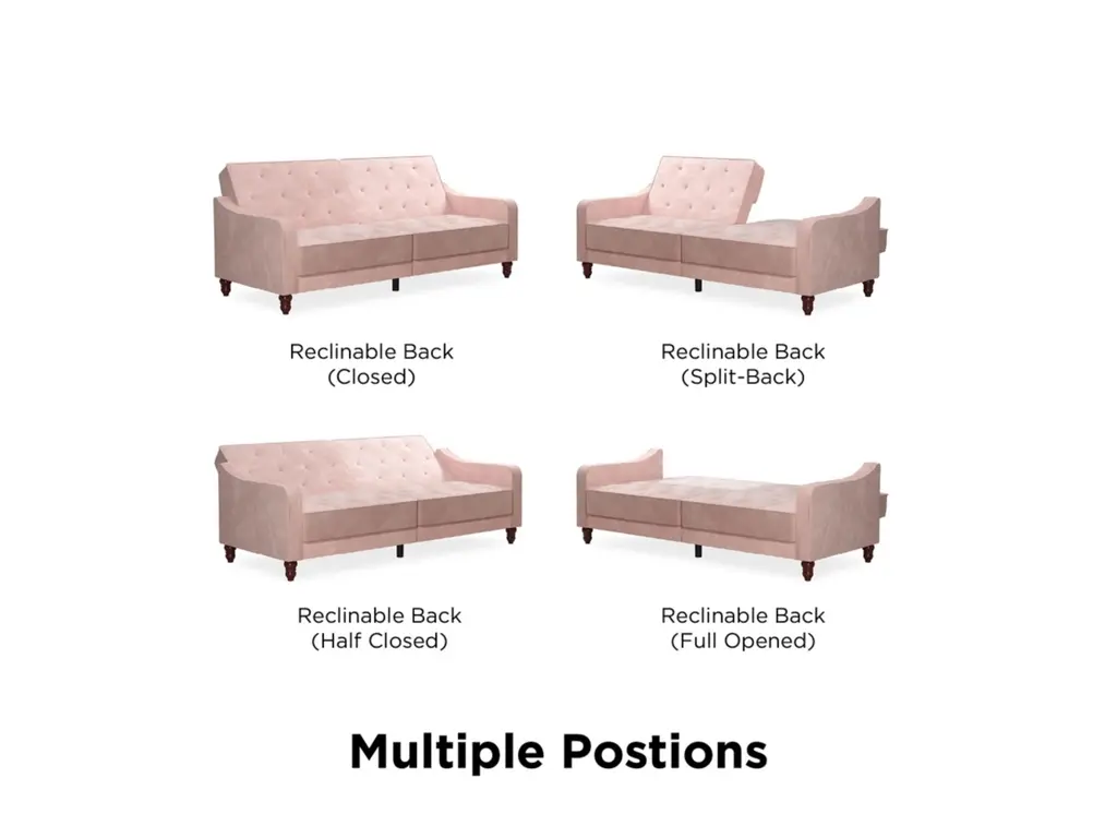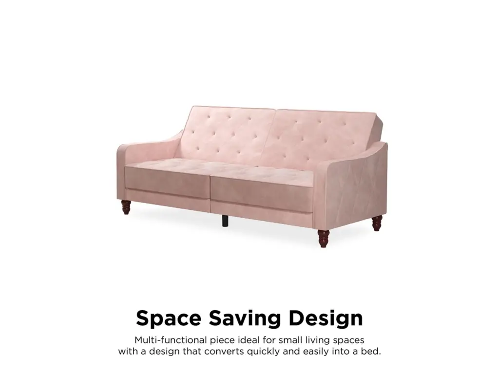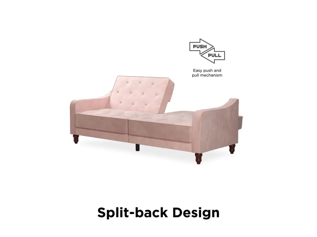 The Novogratz Vintage Tufted Split Back Futon is the best way to make a style statement in your home! In fact, this sofa does everything for you. Made with a robust wooden frame, its elegant design pops in adventurous colors that will make sure to leave a lasting impression. The split-back feature is ideal when looking for functionality: it can be independently reclined to multiple positions, which allows you to sit, lounge and even sleep! Upholstered in soft velvet with diamond-tufted seat, cushion and arms, it has Victorian style legs that add the last touch. Pair it with the Novogratz Vintage Tufted armchair and/or ottoman to achieve a complete look and bring on the fun!
