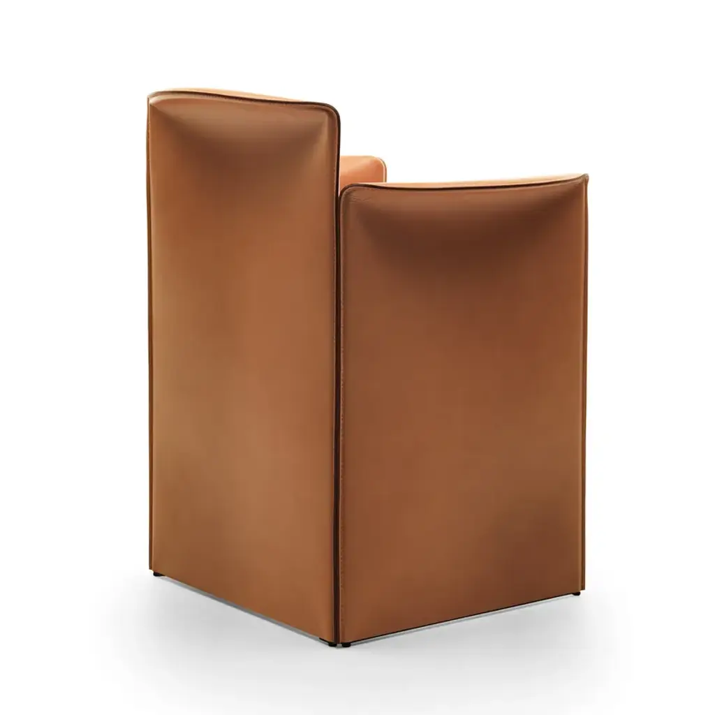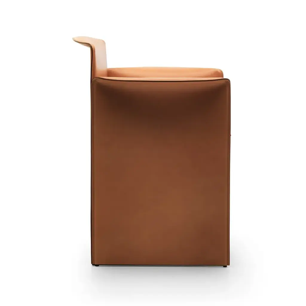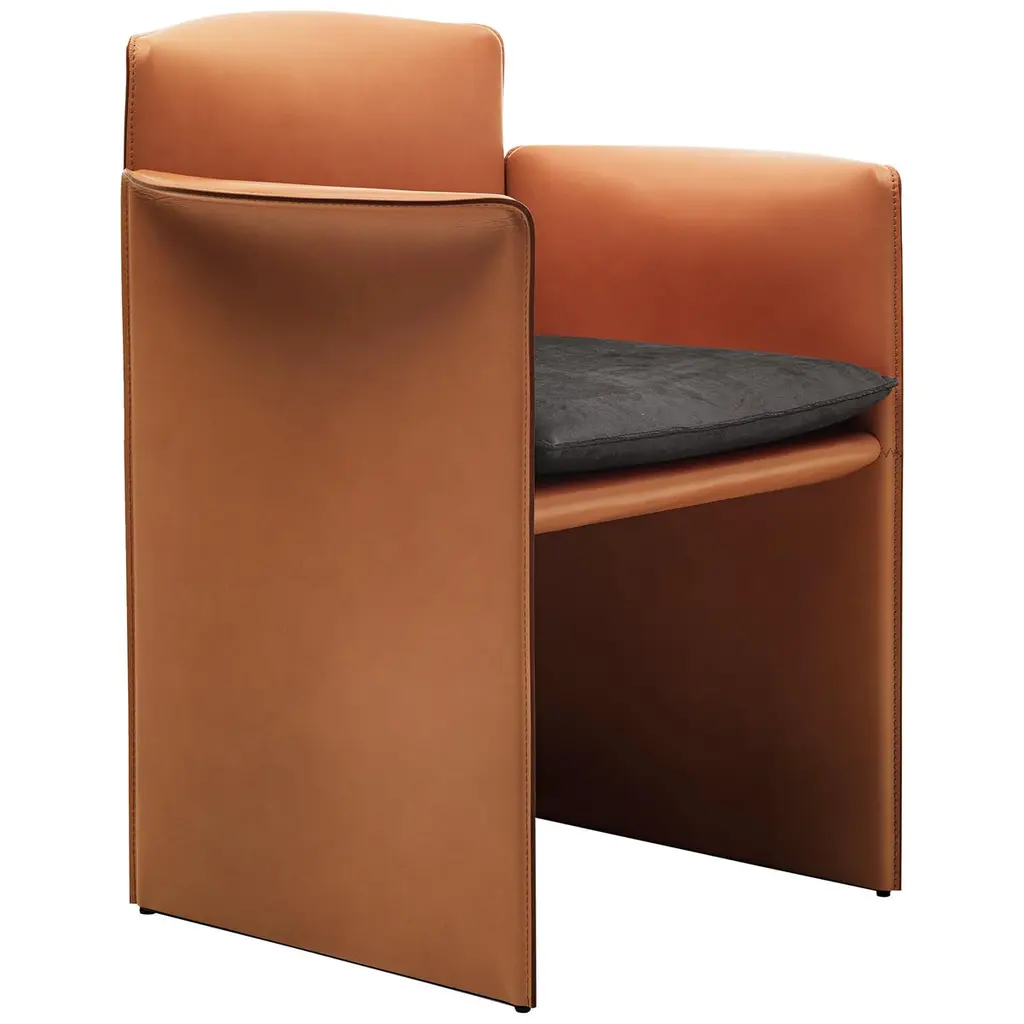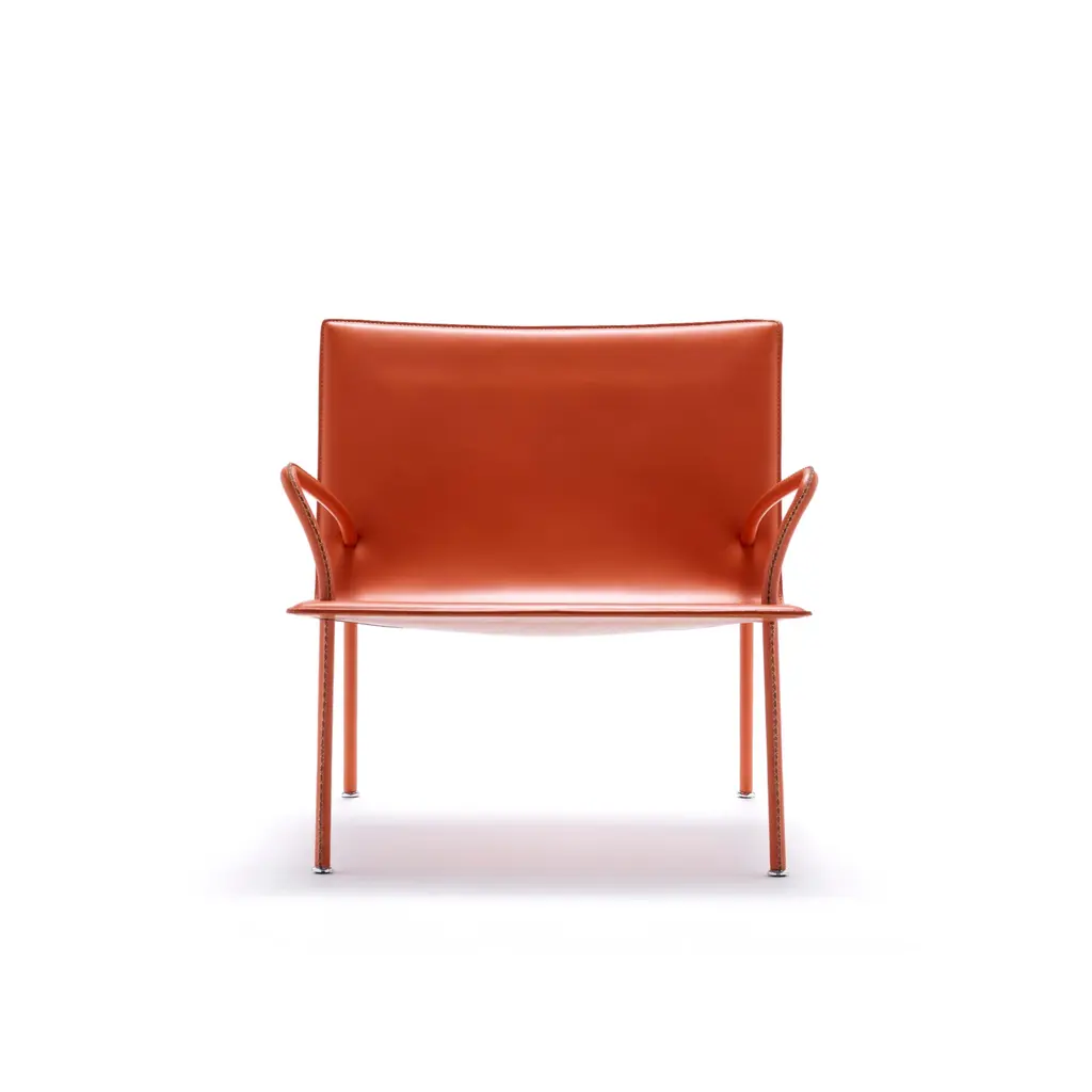 “O” is an armchair made of multiple cow-hide panels sewn over steel frames. It’s an intelligent manufacturing technique re-invented here through an original and contemporary design. When seen from above the seat is a square inscribed in the circle defined by the backrest and armrests. Thanks to the plastic nature of cow-hide, this rigorous geometry when developed in space becomes a fluid and functional harmonic language. “O” is available in 8 colours. Steel structure, cow-hide cover, fabric-covered polyurethane pillow.