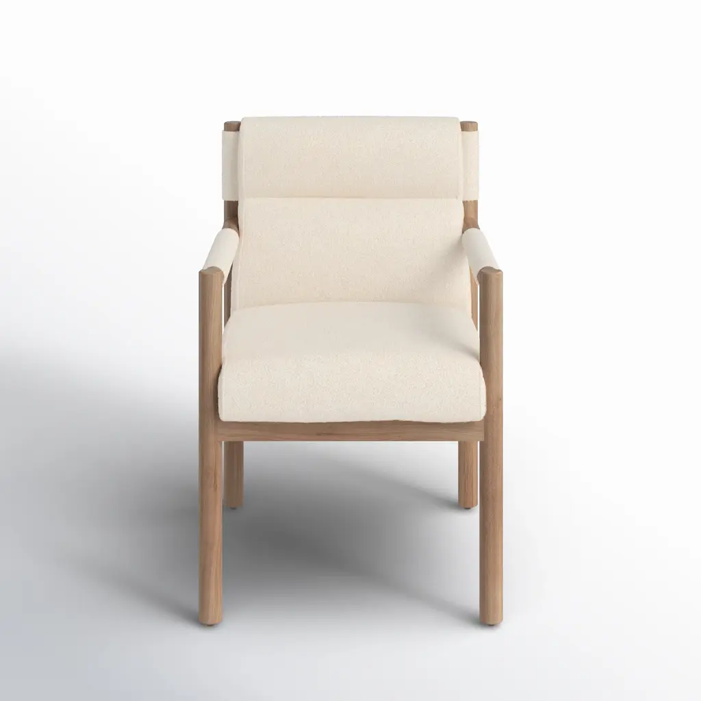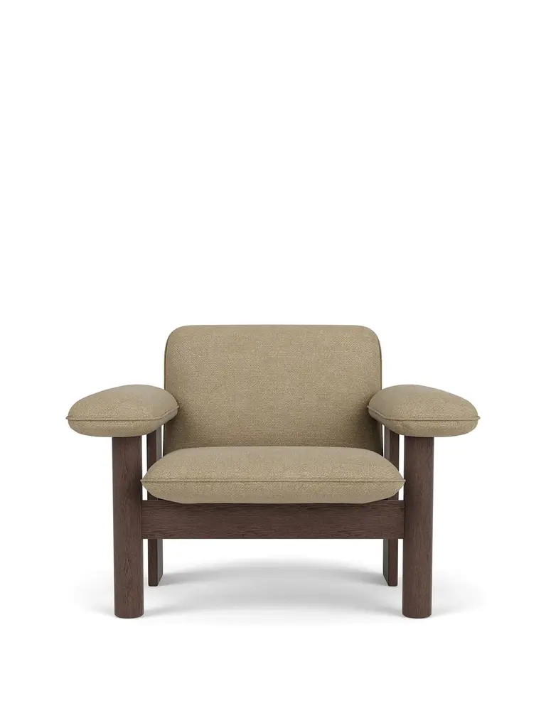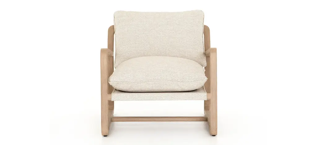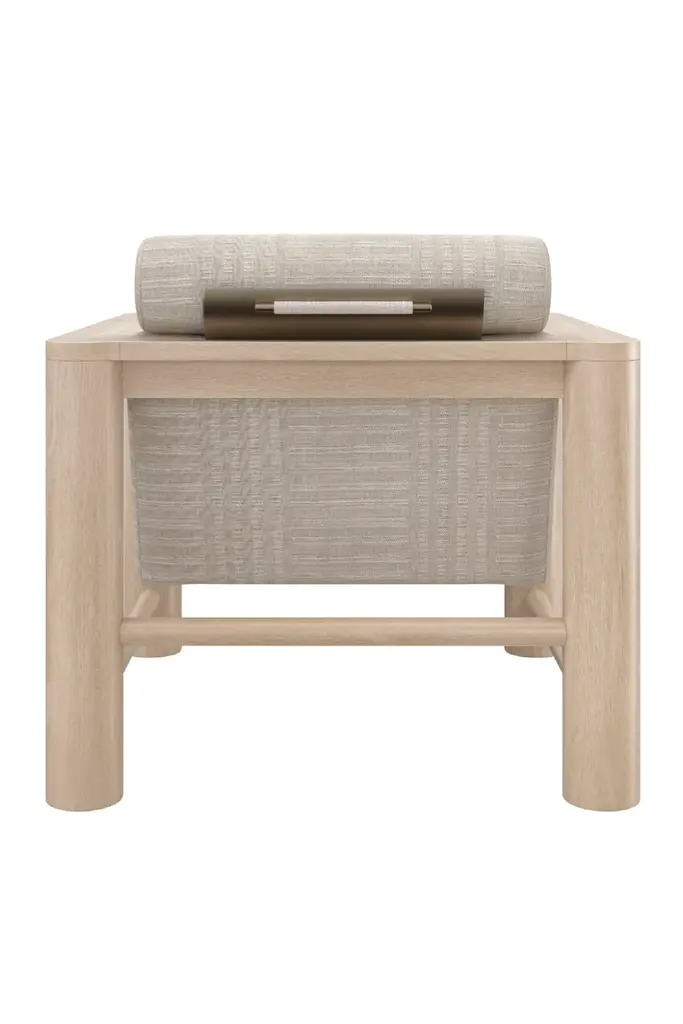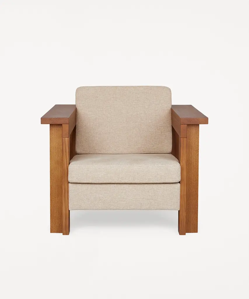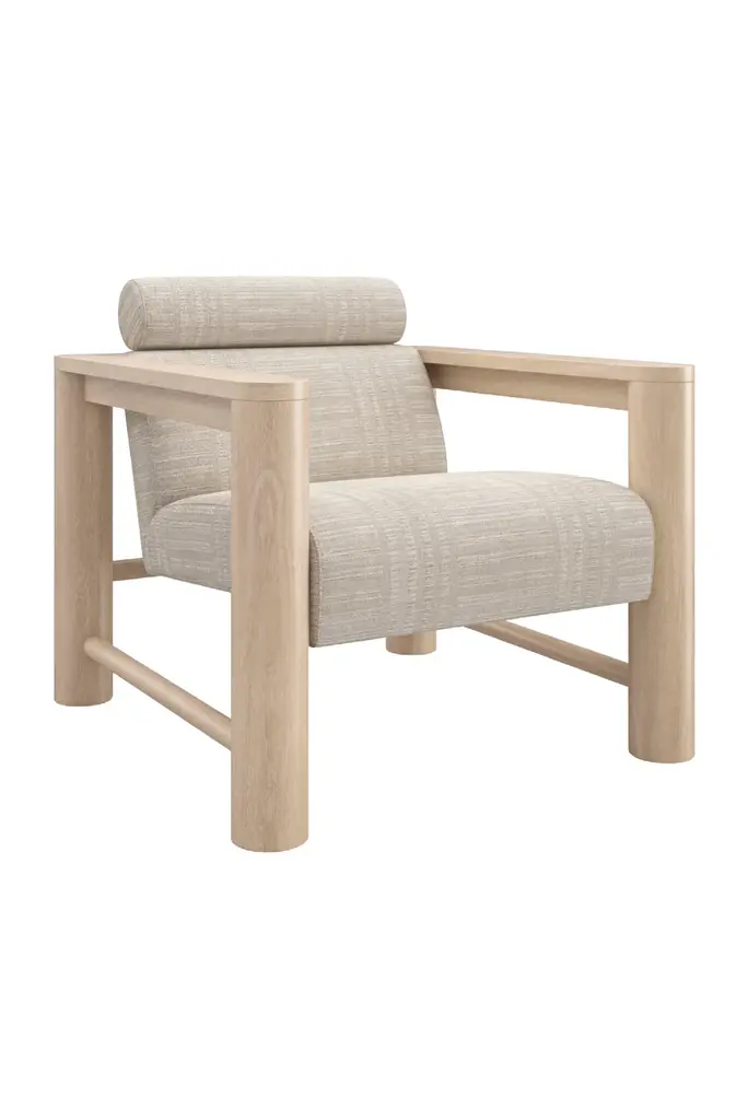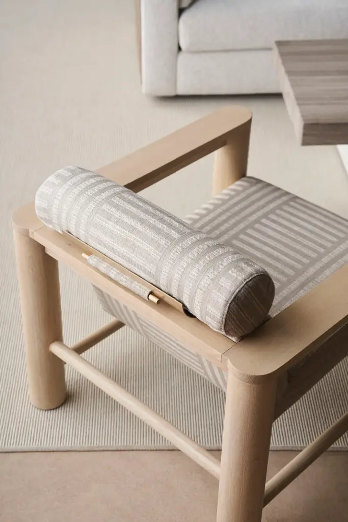 With a luxe, lounge-like aesthetic, this statement-maker exemplifies a unity of materiality, form and function. Features a pillared Natural Oak frame, softly contrasted by a tactile fabric that introduces a subtle stripe pattern. Style on its own, or in pairs to create a cozy space for laidback conversation.