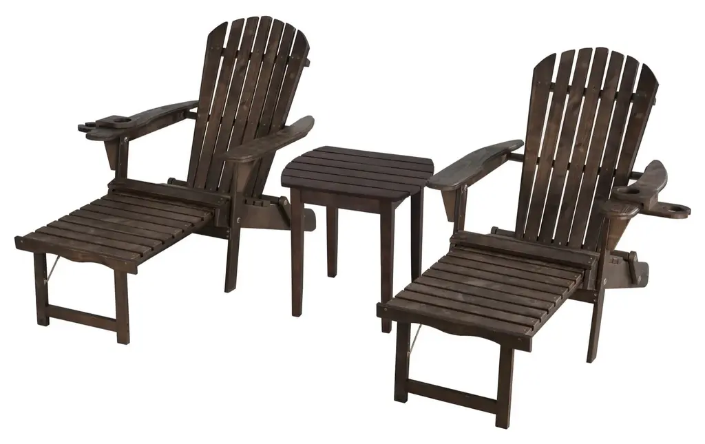 The Adirondack Chaise Lounge chair is a staple of the backyard patio, providing both casual comfort and timeless beauty. Constructed of beautiful pine wood that resists moisture and cracking, the reclined back, oversized arms, and a gently sloping seat. Equip with an interchangable cup and wine glass holder to suit your party need. Simply pull out the built-in ottoman and experience a new level of relaxation as you read a book or absorb the sun rays. The Adirondack Chaise Lounge will easily be folded to save storage space and to transport it effortlessly. A truly luxury classic outdoor experience.The natural pine wood finish of our Foldable Adirondack Chaise Lounge Chair will provide a comforting, stylish feel to the outdoor atmosphere of any home setting.Built in Ottoman with added comfort. Unique design of interchangeable cup and wine glass holder.The ergonomic structure of this chair ensures optimal comfort and relaxationThe chair itself is light weight and very easy to handle, as it folds flat for easy storageLight Assembly Required Using The Included HardwareMade with Finland PineSet includes Two Adirondack Chaise Lounge Chairs and One End Table