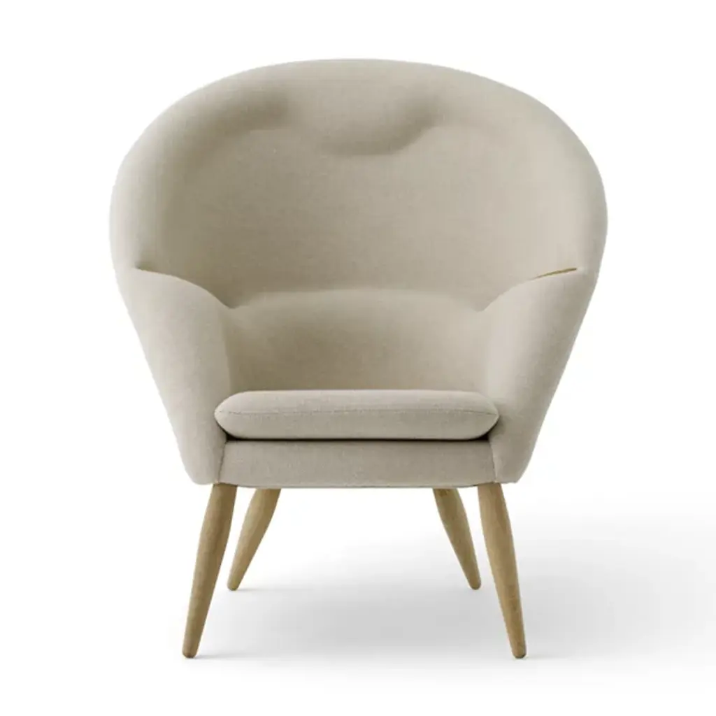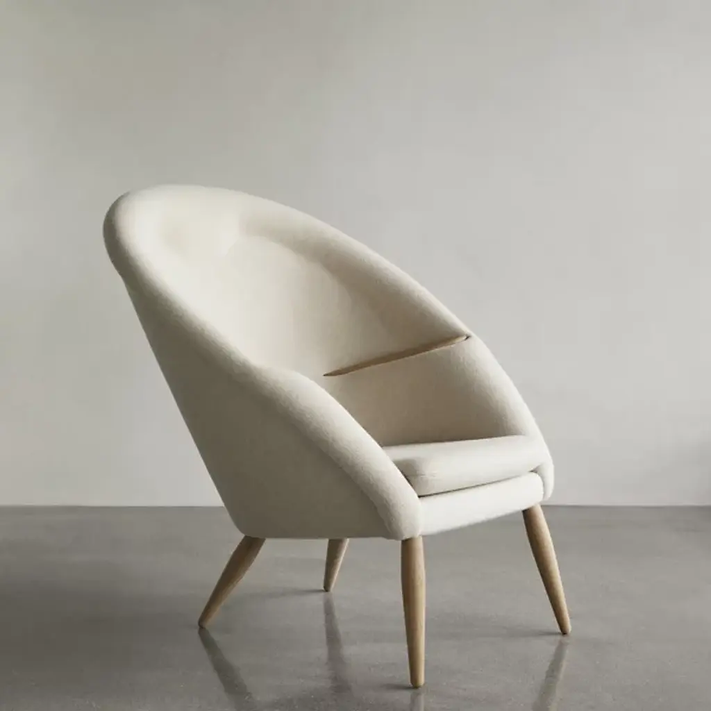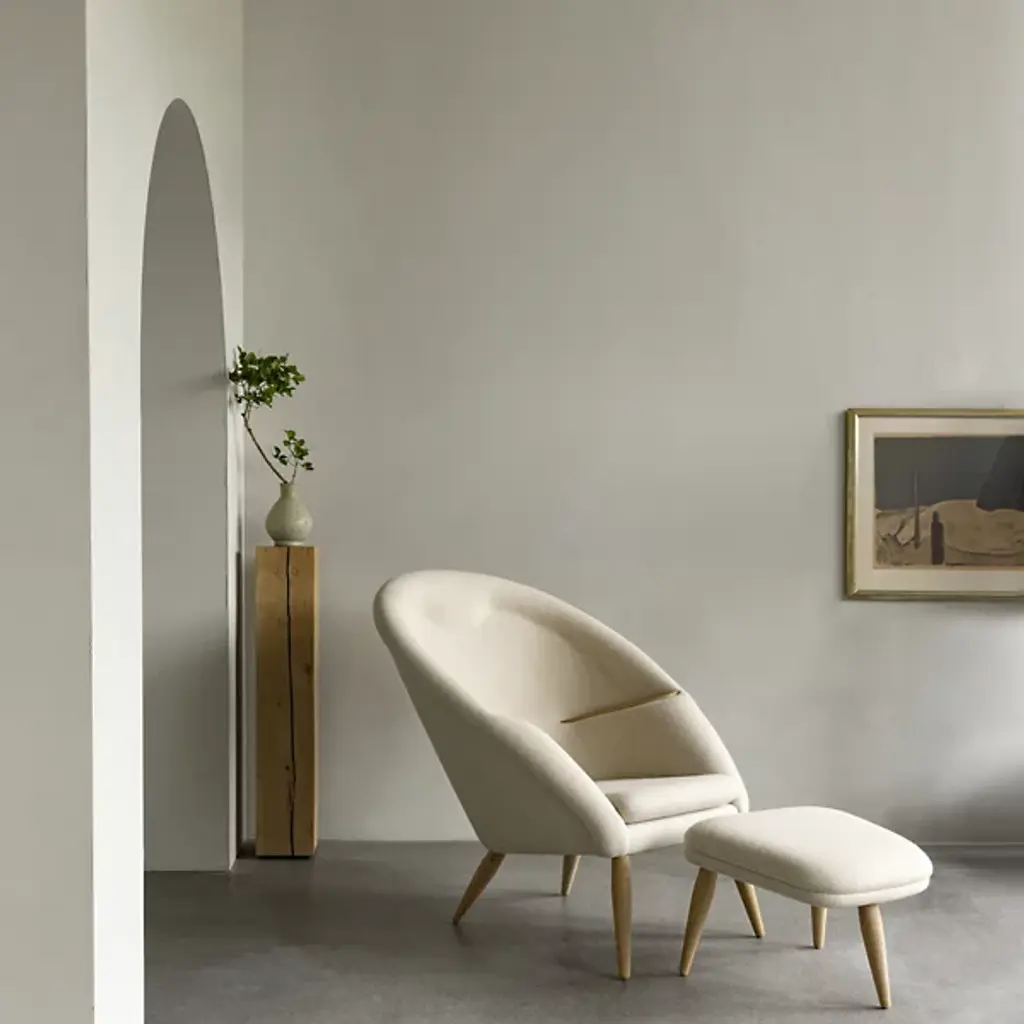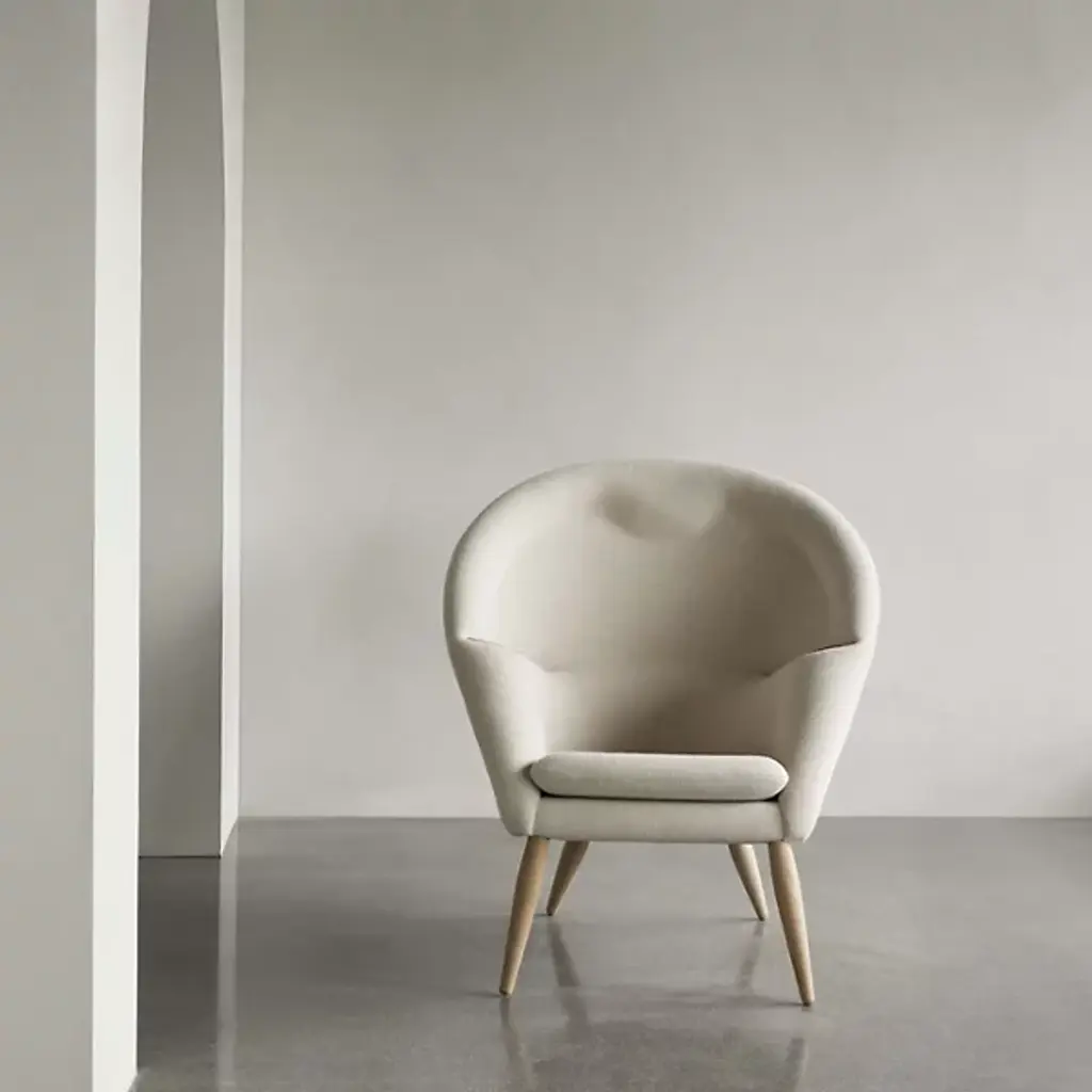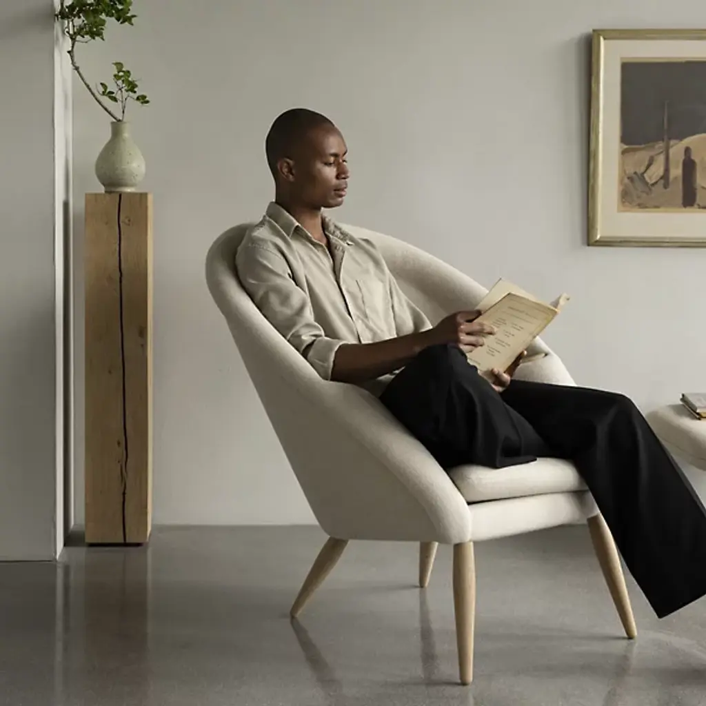 An ode to nature. The Oda Lounge Chair from Audo Copenhagen, formerly known as Menu, is as satisfying in silhouette from afar then cradled inside its comfortable curves. Renowned Danish designer Arnold Madsen’s works stand the test of time through their organic shapes and fluid contours. Here a framework creates an impressive shell that lets the upper body and arms rest with inset elements. This framework receives elegant upholstery that feels cozy around the body. The soft texture of the upholstery delights against the enduring warmth and grooves of the splayed wooden legs.