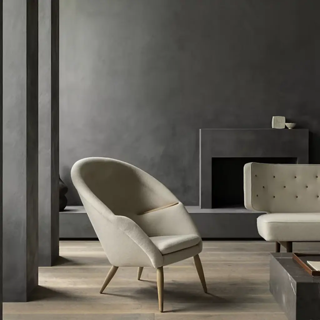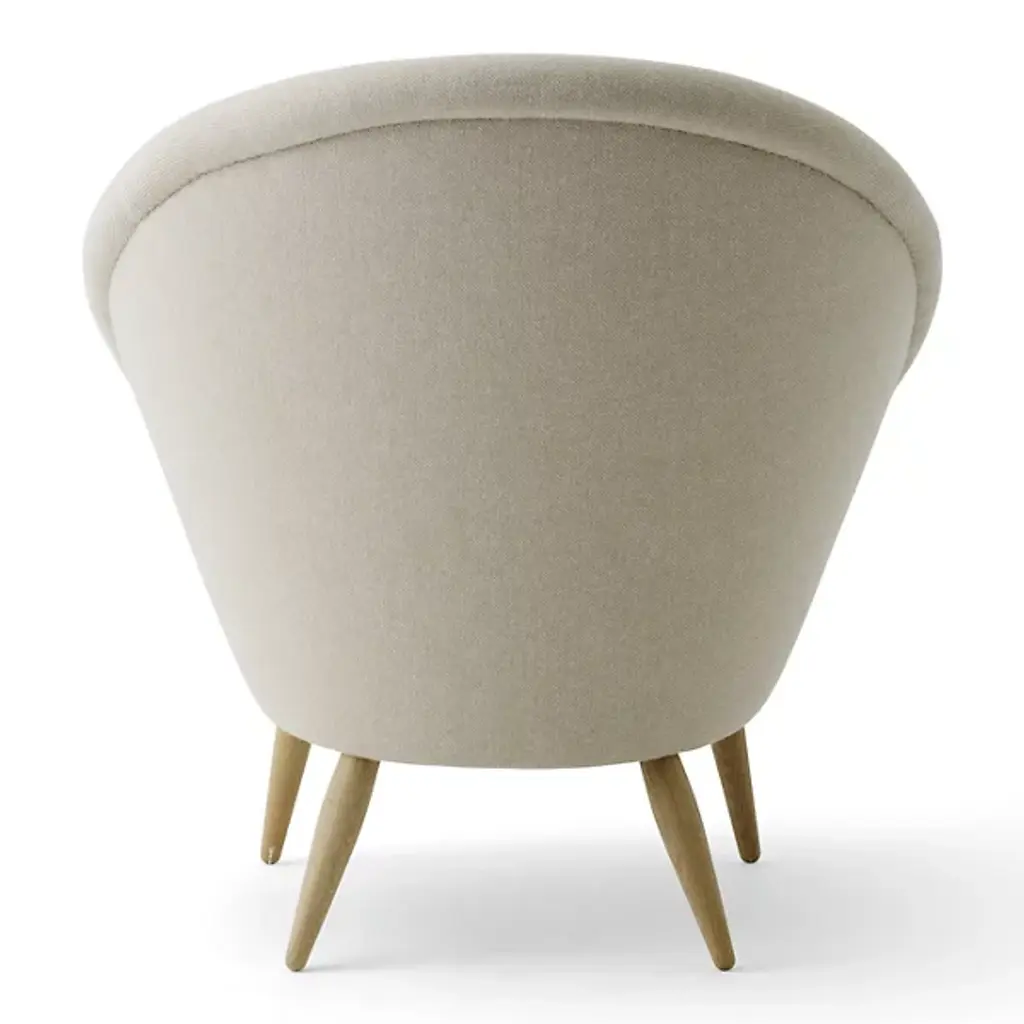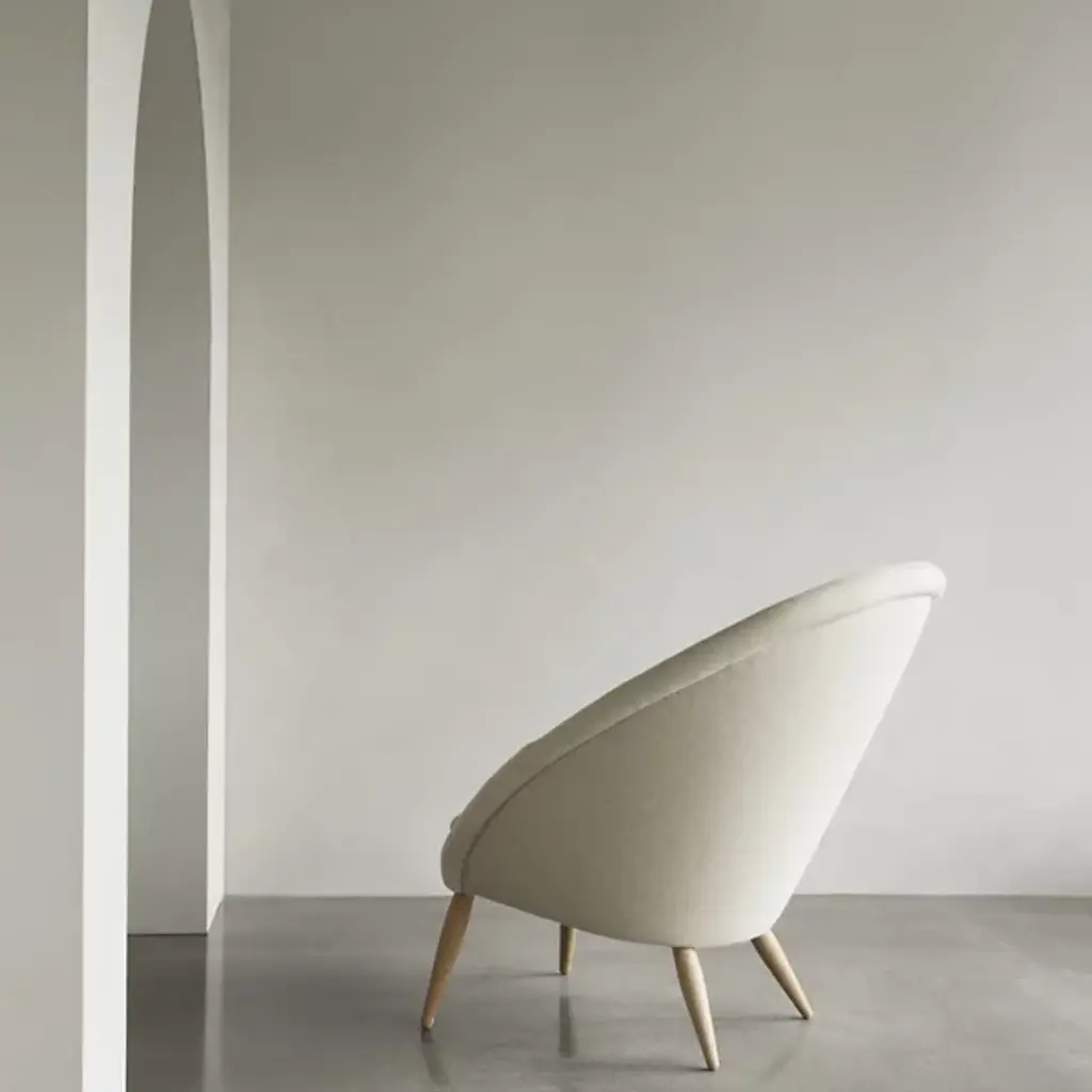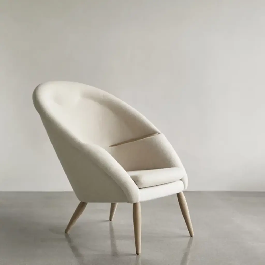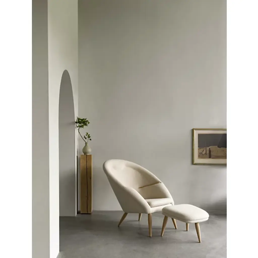 An ode to nature. The Oda Lounge Chair from Audo Copenhagen, formerly known as Menu, is as satisfying in silhouette from afar then cradled inside its comfortable curves. Renowned Danish designer Arnold Madsen’s works stand the test of time through their organic shapes and fluid contours. Here a framework creates an impressive shell that lets the upper body and arms rest with inset elements. This framework receives elegant upholstery that feels cozy around the body. The soft texture of the upholstery delights against the enduring warmth and grooves of the splayed wooden legs.