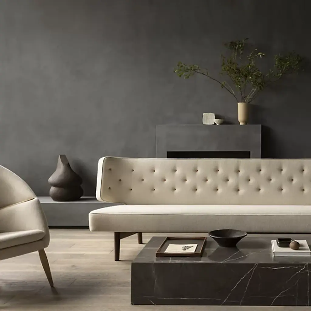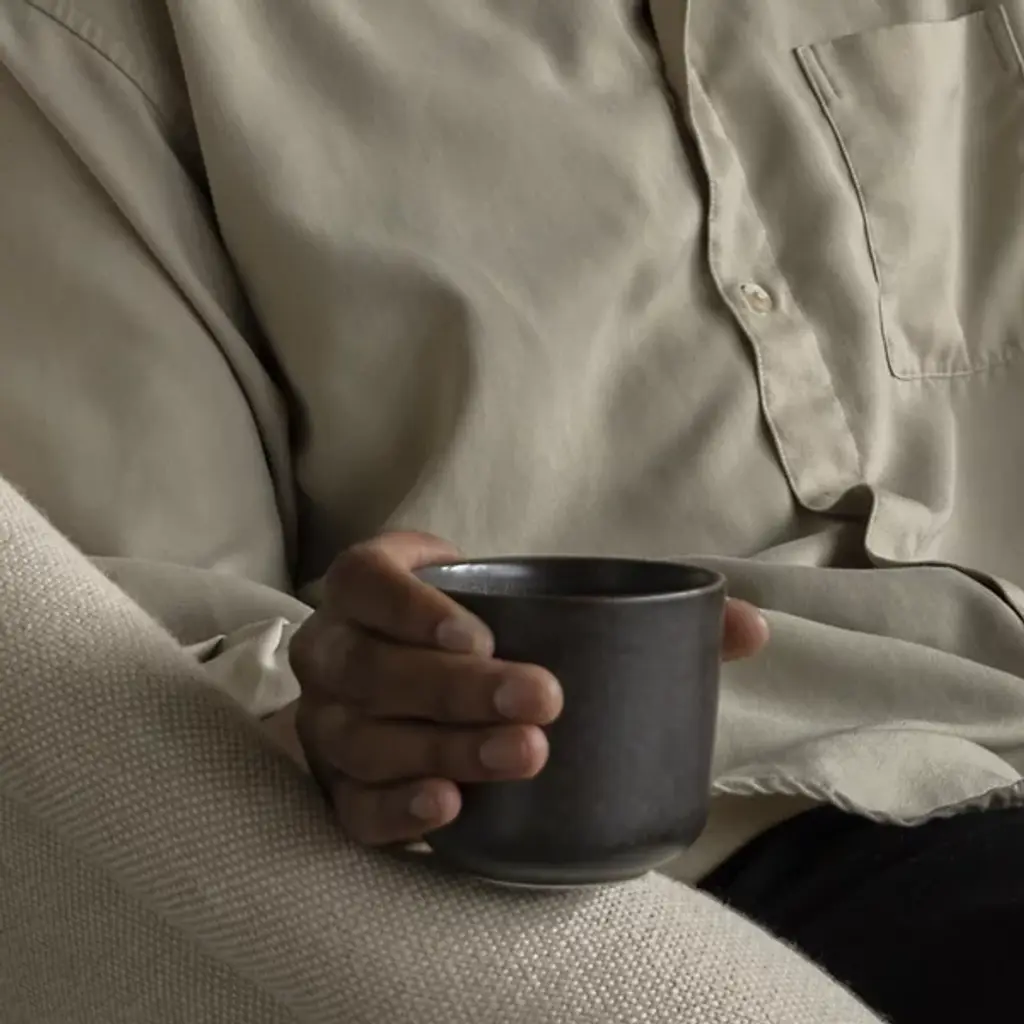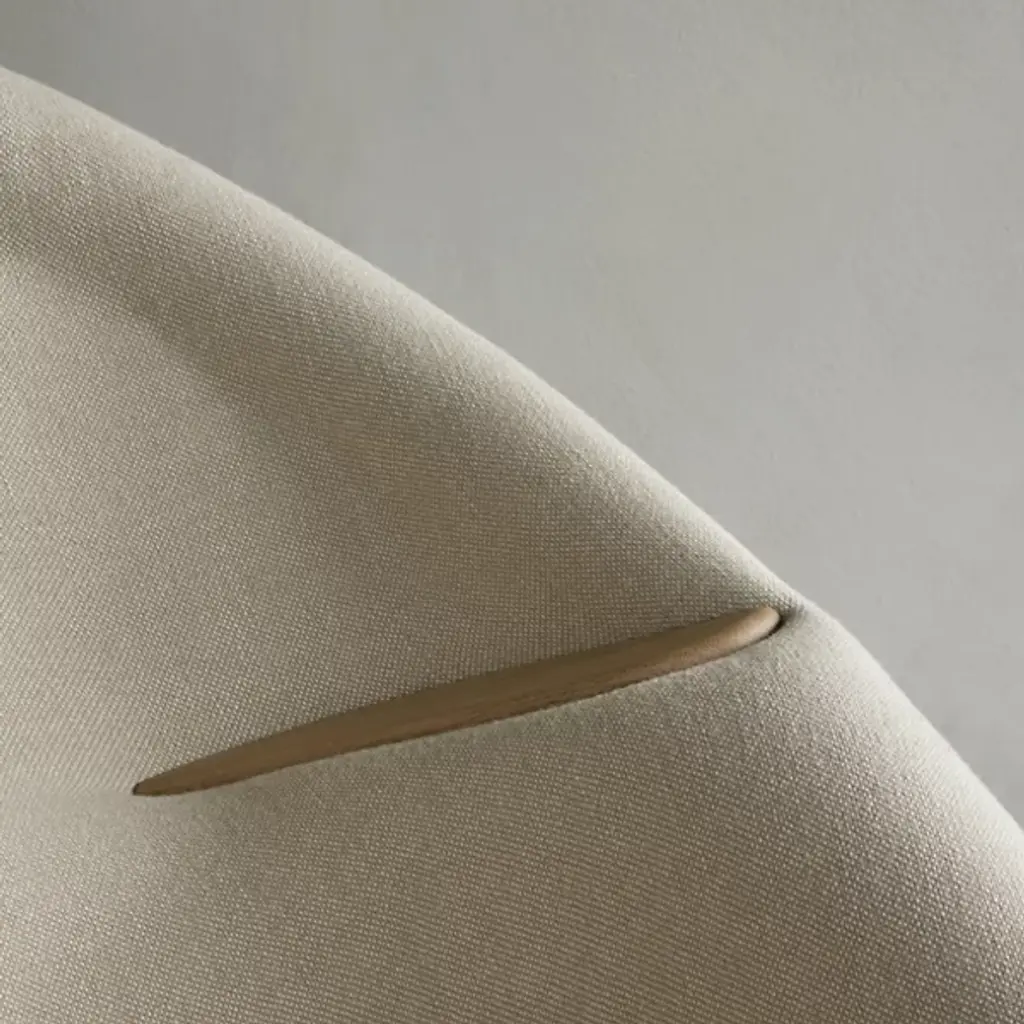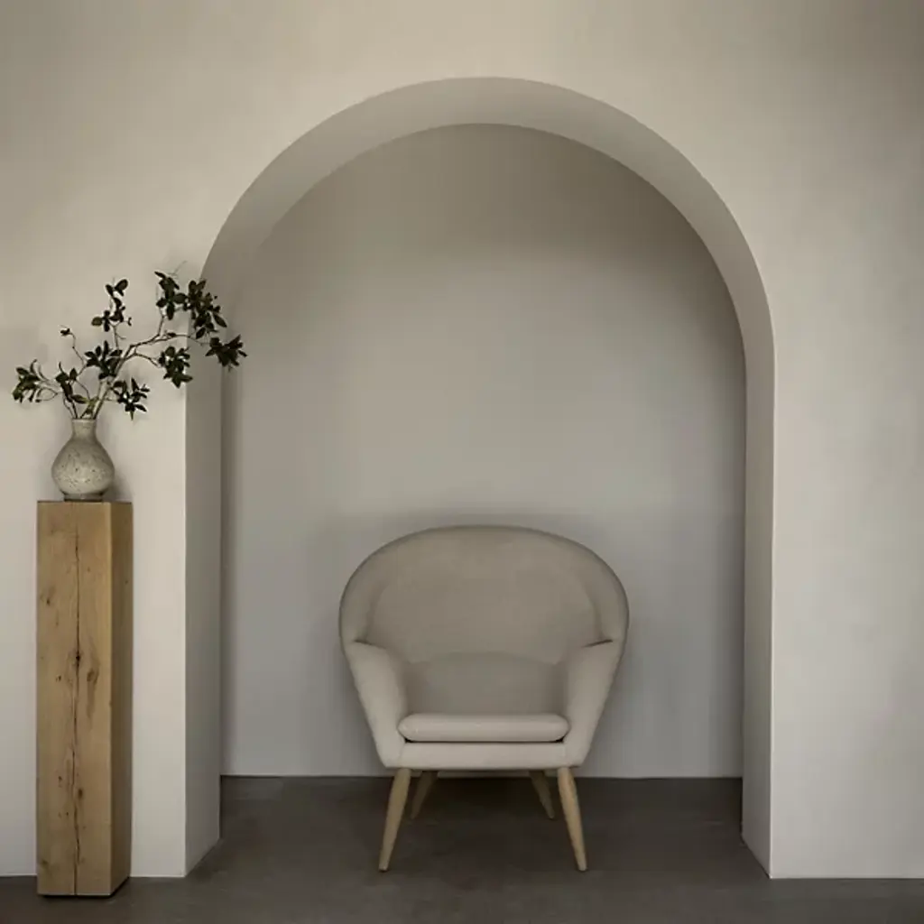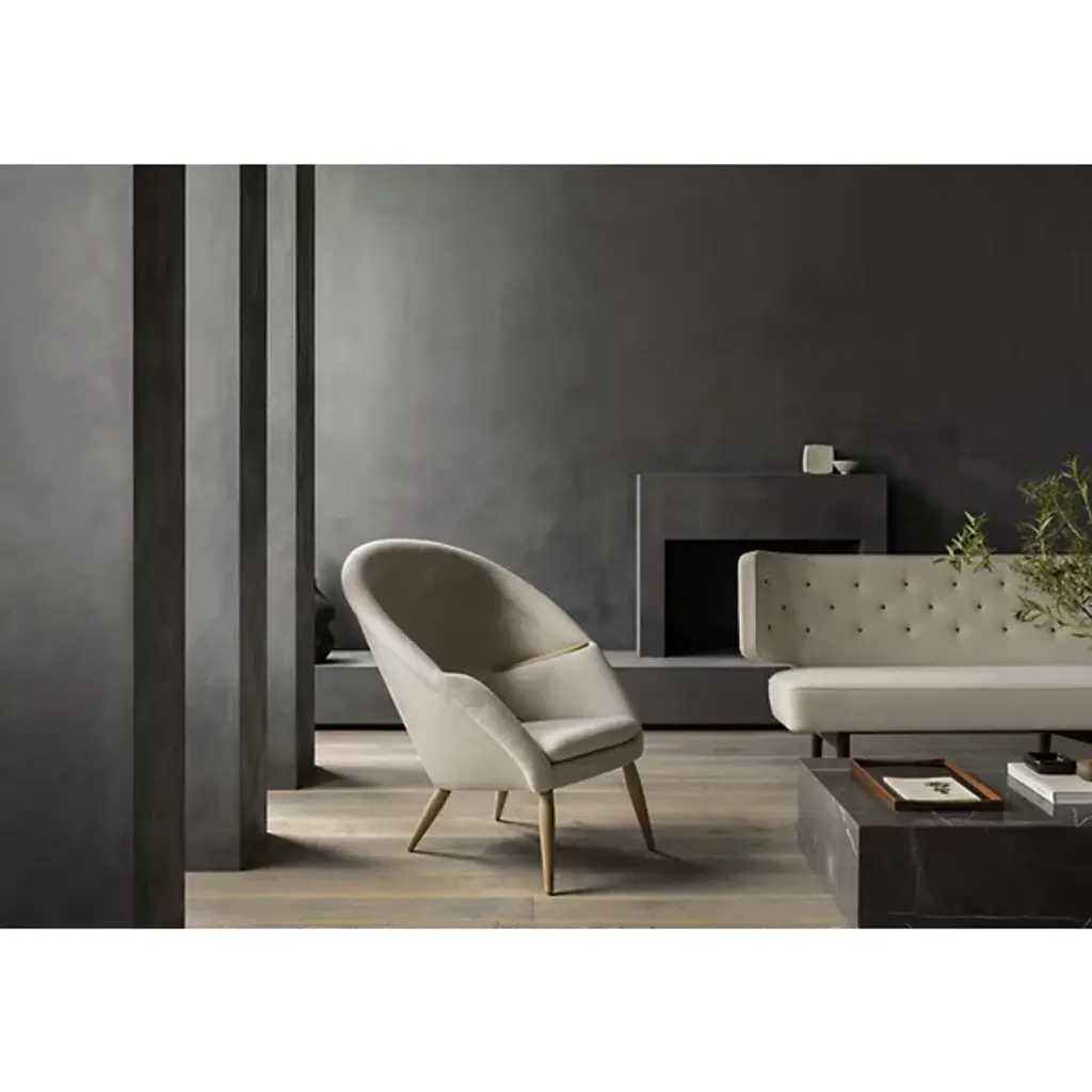 An ode to nature. The Oda Lounge Chair from Audo Copenhagen, formerly known as Menu, is as satisfying in silhouette from afar then cradled inside its comfortable curves. Renowned Danish designer Arnold Madsen’s works stand the test of time through their organic shapes and fluid contours. Here a framework creates an impressive shell that lets the upper body and arms rest with inset elements. This framework receives elegant upholstery that feels cozy around the body. The soft texture of the upholstery delights against the enduring warmth and grooves of the splayed wooden legs.