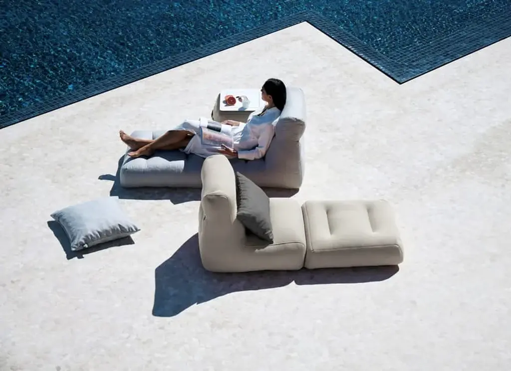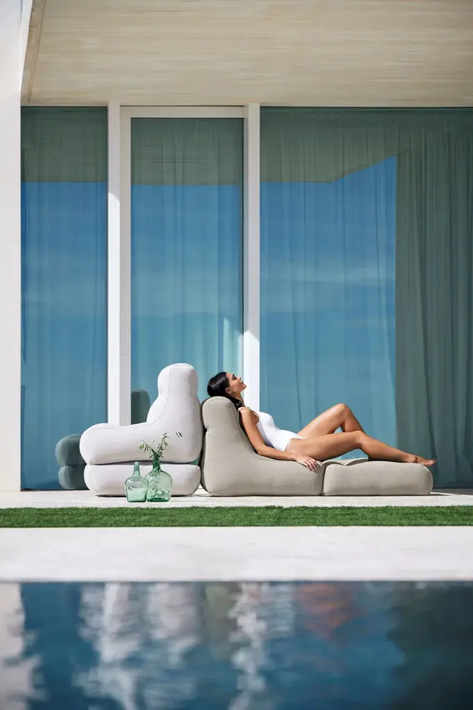 This has been specifically thought out as chaise longue for open spaces outdoors, but it also adapts itself to closed spaces.It’s the protagonist wherever it is placed, one of our star products in the catalogue.Again, it is its versatility that makes this piece so unique, as it can be combined in different ways to create chill-out areas which will make everyone stare!The comfort of SIT POOL is only comparable to its attractive minimalist design, which steals all eyes.G1/21 fabrics : AGORA suitable for indoor, outdoor and pools alsoColor: Sand