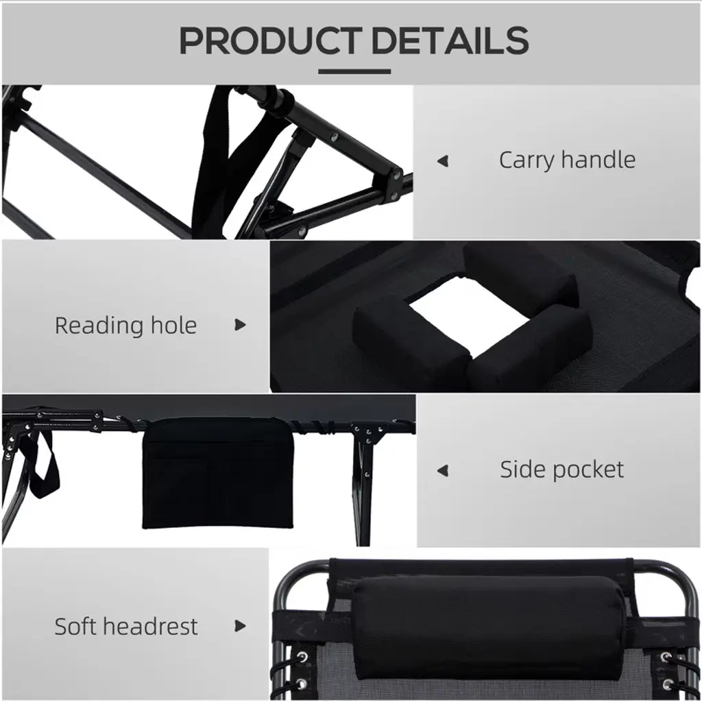 This versatile sunbathing lounge chair easily adjusts between a comfortable 120° reclining seat and a fully flat 180° tanning position, perfect for relaxing by the pool, firepit, or taking on outdoor adventures. Designed with portability in mind, it folds compactly to fit in your trunk, making it ideal for beach trips, camping, concerts, and more. Enjoy added comfort with a padded headrest, supportive armrests, and a handy back pocket to keep your essentials within reach. Crafted with a sturdy metal frame and breathable Oxford fabric, this lightweight chair supports up to 450 lbs while weighing only 13 lbs. Non-slip footpads protect surfaces from scratches, ensuring safe use on any terrain. With generous dimensions when open and a compact folded size, it’s the perfect companion for effortless relaxation anywhere.