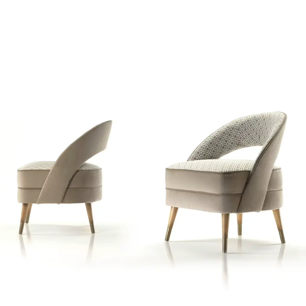 Dynamic and airy, the design marking this walnut-finished armchair reflects the predilection for daring lines and hypnotizing patterns popular in the '60s. Brass tips accent the tapered legs offering sustain to the richly cushioned seat that, embraced by a fluid-curved enveloping backrest, flaunts a vibrant upholstery combining taupe velvet with a coordinated geometric-style pattern.