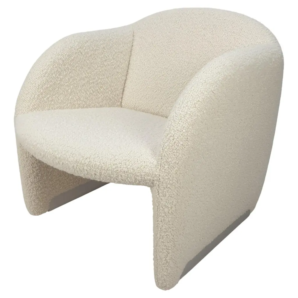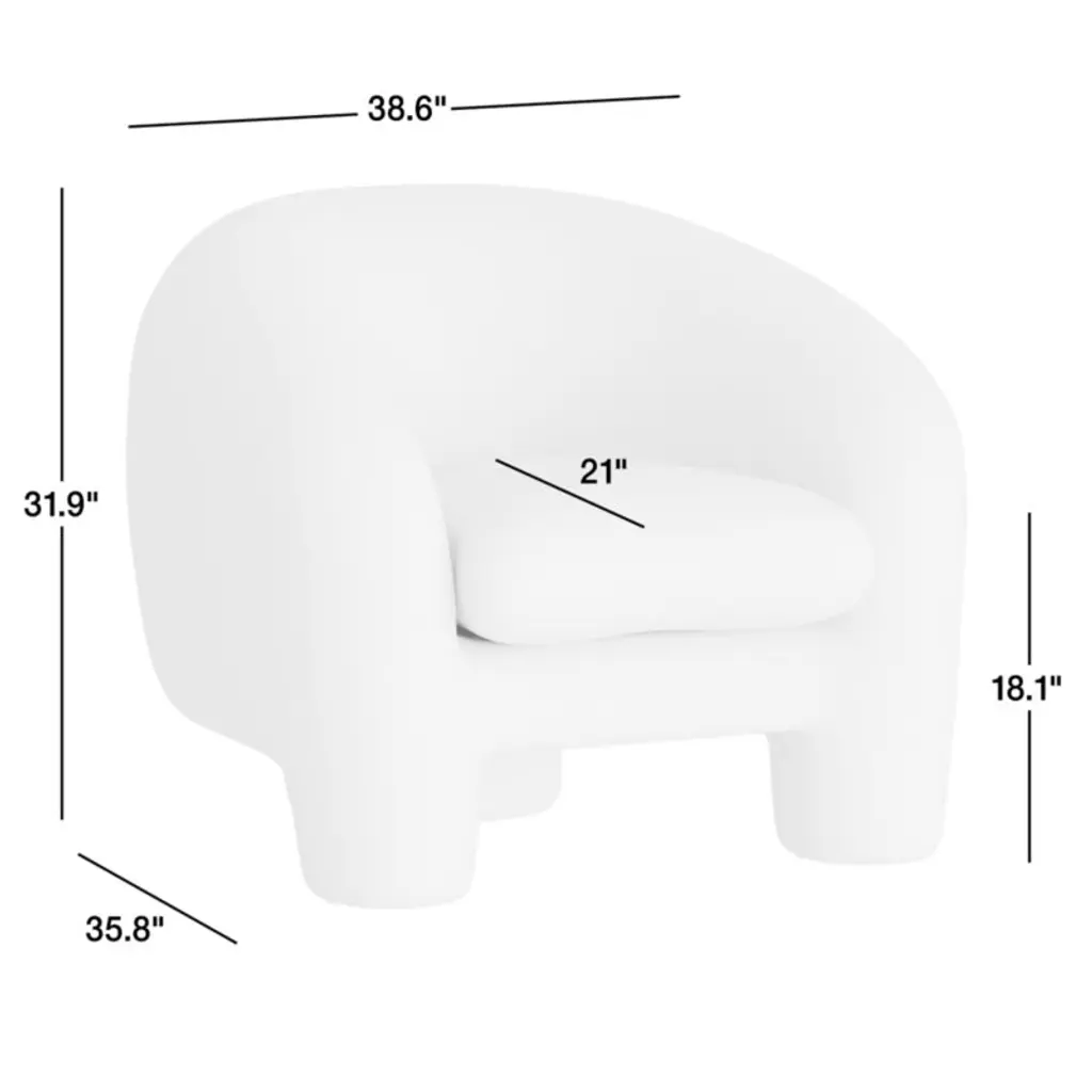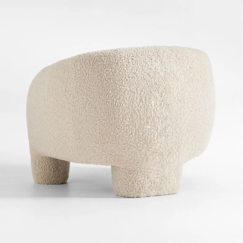 Voluminous form and wraparound comfort. Ono takes inspiration from contemporary Mexican furniture design, breaking away from straight lines with a fully rounded frame and delightfully chunky tripod legs. Sloped arms flow into a tight barrel back to snuggle a cushioned seat. For even more cozy comfort, faux off-white shearling covers every inch with luxurious texture and a supersoft hand.