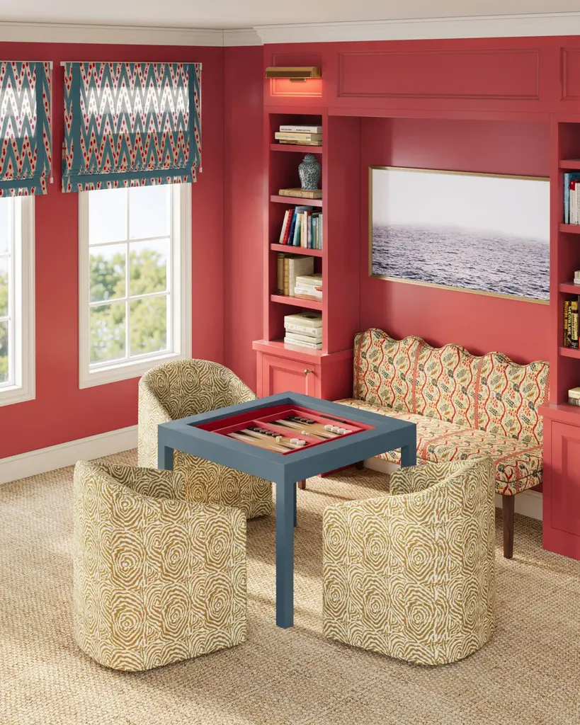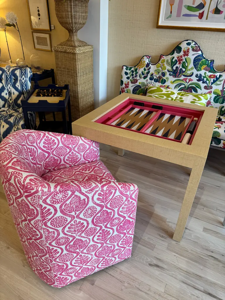 Dimensions: 24 W x 25 D x 32 H x 19 SD x 18 SH COM: 5 yards Finally a Game Chair to celebrate! Perfectly sized for all our game tables, comfortable sit, and rolls on hidden carpet casters. ** Please Note, if using COM, production will not start until we receive your COM FORM Made in America