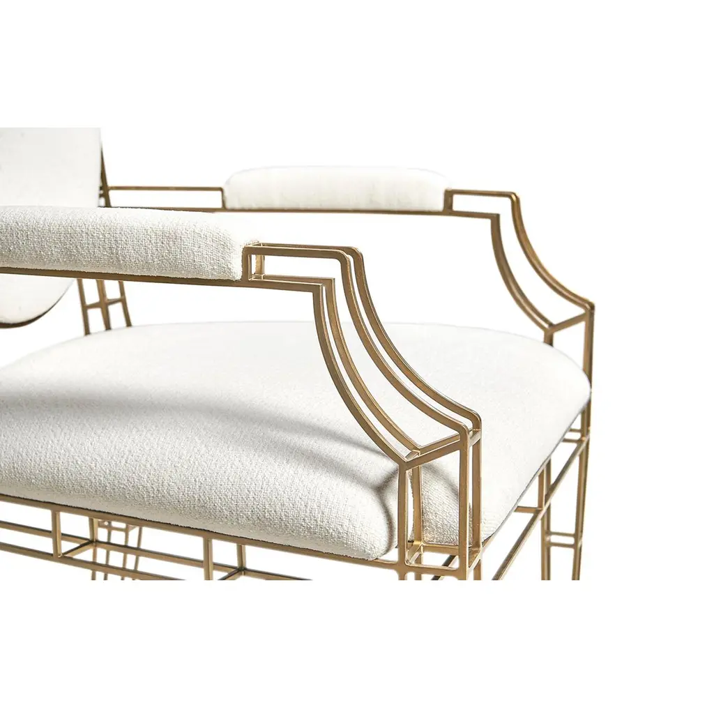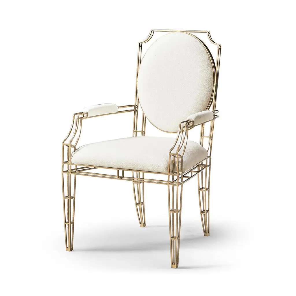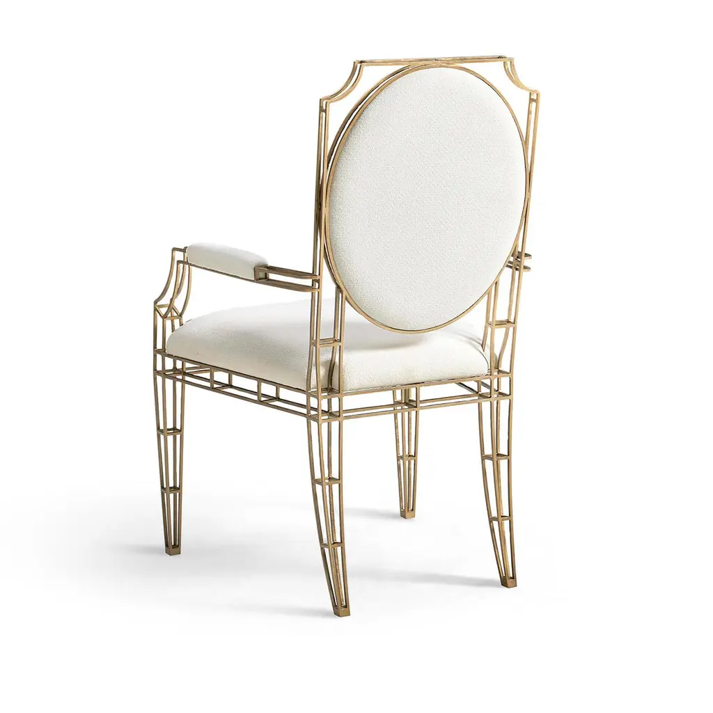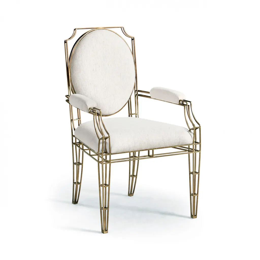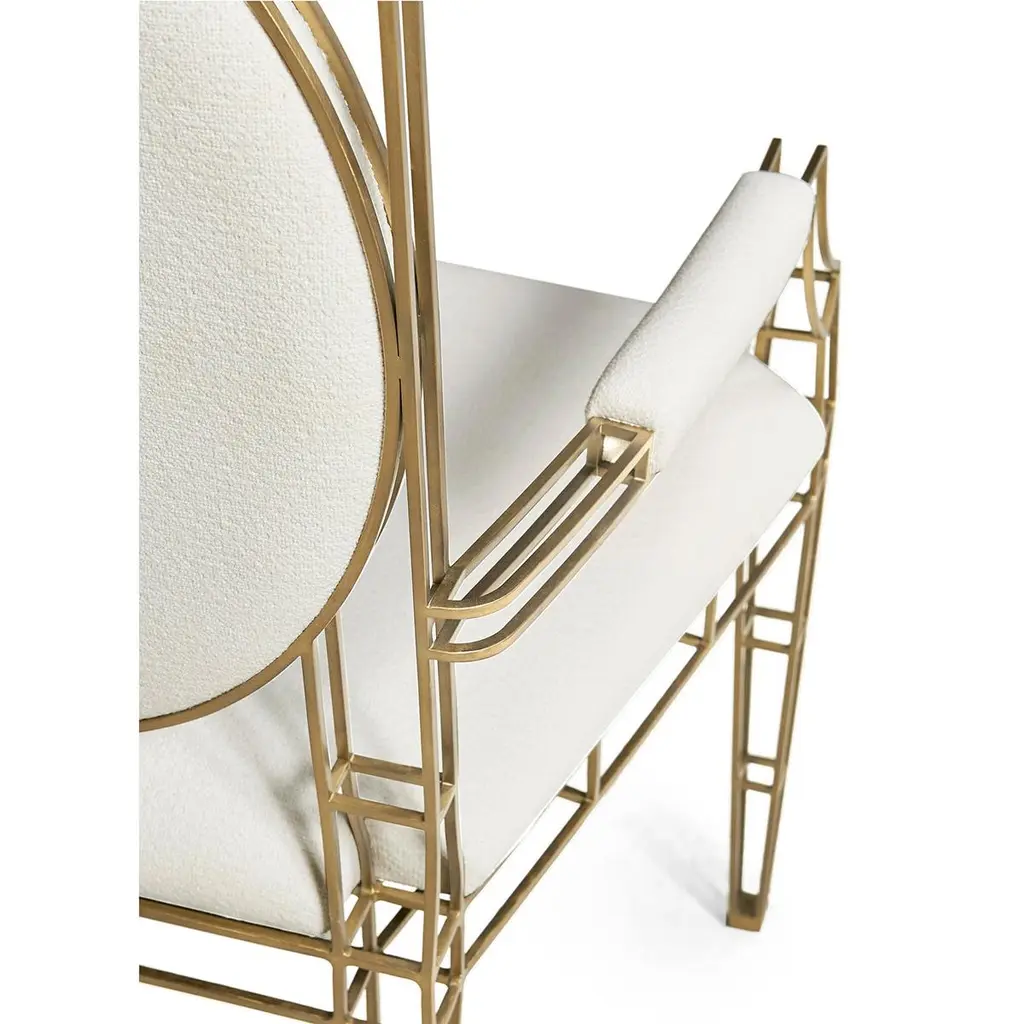 Designed to enhance any room with its elegant presence, this chair perfectly balances artistic form with functional style.Crafted with precision from stainless steel, ensuring durability and a gleaming appearance. The exoskeleton frame of the chair not only supports but also accentuates the minimalist lines and clean geometry that define its structure.A warm bronze finish envelops the frame, adding a rich depth to the steel's natural sleekness and offering a visual warmth that complements any decor. The upholstered seat, back, and armrests are covered in a high-performance neutral fabric, which is both visually appealing and plush, providing a comfortable seating experience.Dimensions: 23.63" W x 25" D x 40.63" HSeat - 19.75" HArm - 27" H