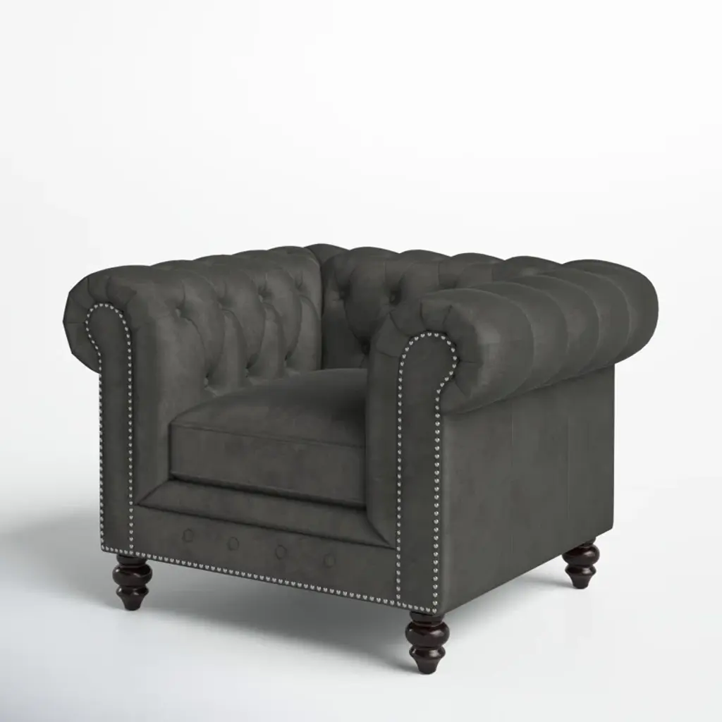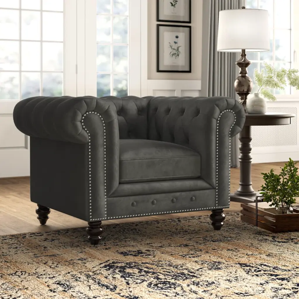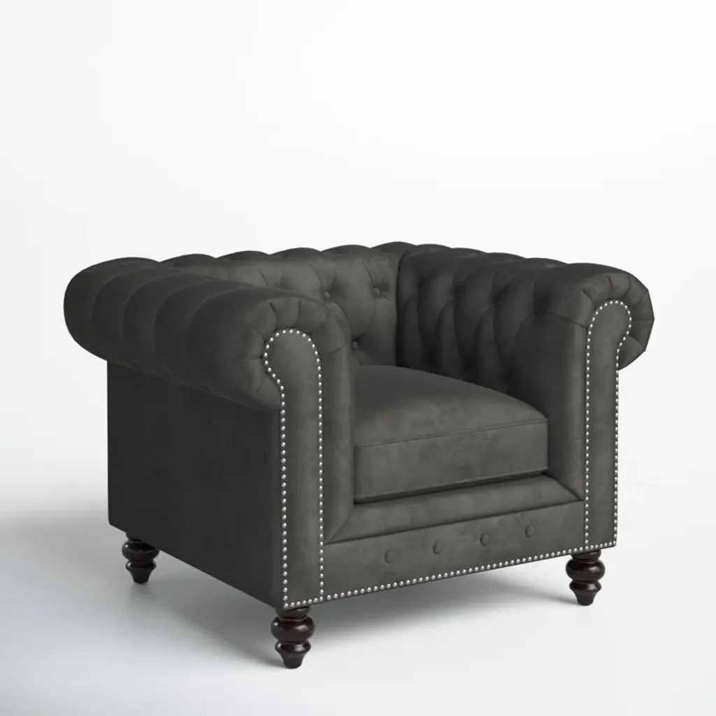 Elevate your living space with this classic Chesterfield chair, where elegance meets comfort. The luxurious velvet upholstery, rolled arms, and tufted back create a timeless look that's both inviting and sophisticated. Made with a solid wood frame and foam-filled cushions, this chair offers a cozy spot to unwind after a long day. The nailhead trim adds a touch of refinement, while the four-leg base in hardwood ensures stability. Plus, the seat cushion is removable for easy care – just give it a light brush or vacuum to keep it looking fresh.