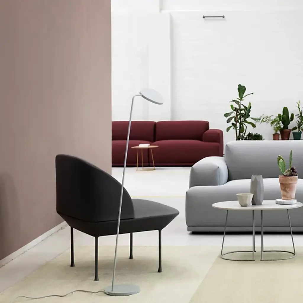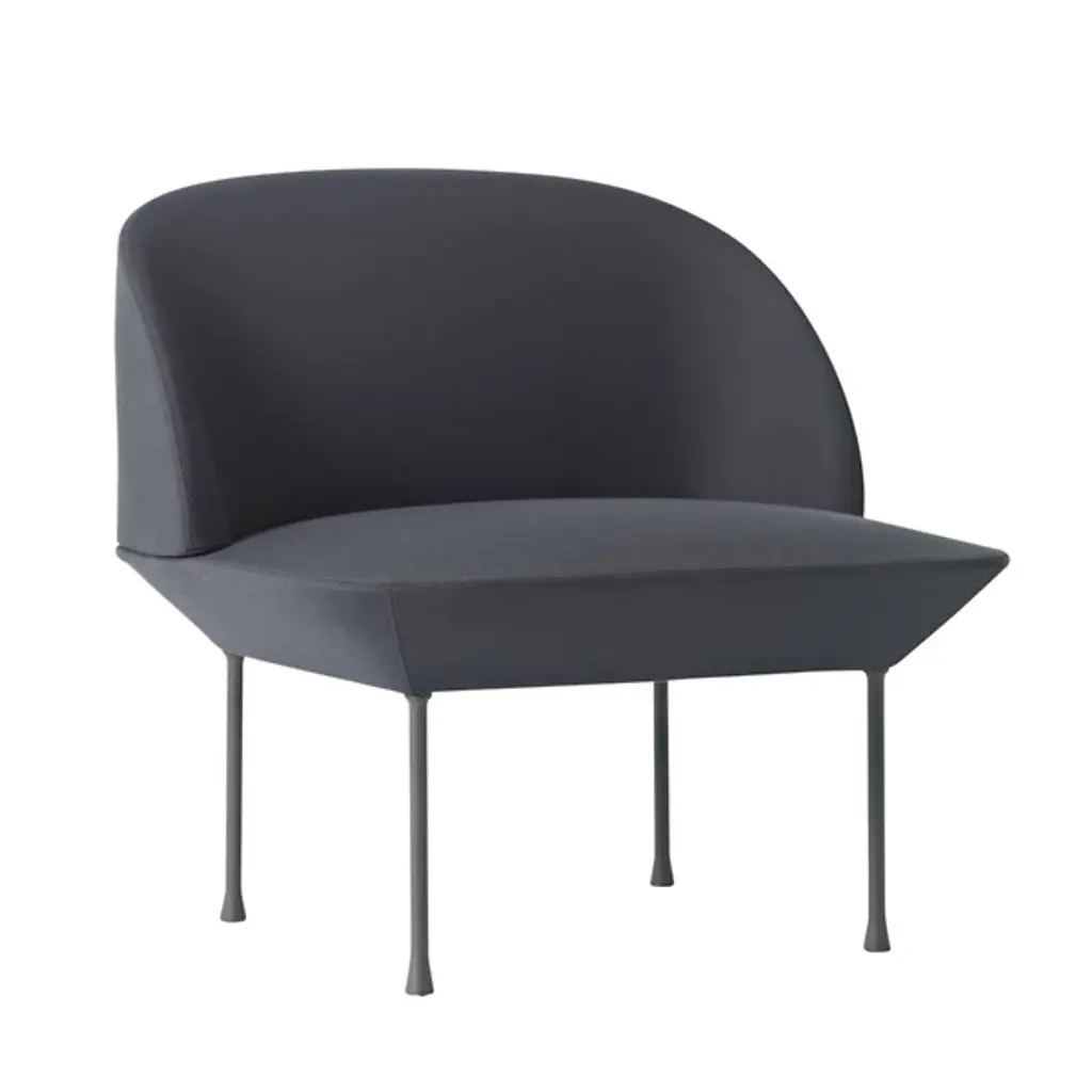 Stately, soft, and sculptural, the Oslo Lounge Chair from Muuto offers considered comfort with a prominent appeal. Made in Denmark and emblematic of the “Hygge” ethos of residential comfort, it’s balanced atop four slender steel legs that narrow as they rise to an outwardly beveled seat to offer a broader seating spread that still allows legs to be tucked underneath it. A large, curving back extends from the seat, with both upholstered in smooth Kvadrat fabric that creates easy, elegant seating.