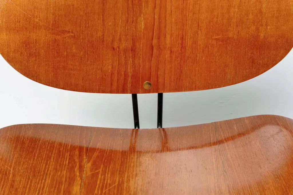 Beautiful and rare set of 4 P31 chairs by Osvaldo Borsani and made in Italy by Tecno in 1957. The chairs are in good original condition with normal signs of usage and have a wonderful patina, which only adds value to them. These chairs are marked with the Tecno emblem on the back and have a matching table originating from the same home as an option.The teak wood is bright, nicely curved and the hardware has some nice brass details. Due to the organic shaped plywood seats and backs, these chairs are very comfortable as well. A nice surviving pair from the hand of one of the founding fathers of Tecno. Matching table is available in another listing.Priced and sold in a set of 2.