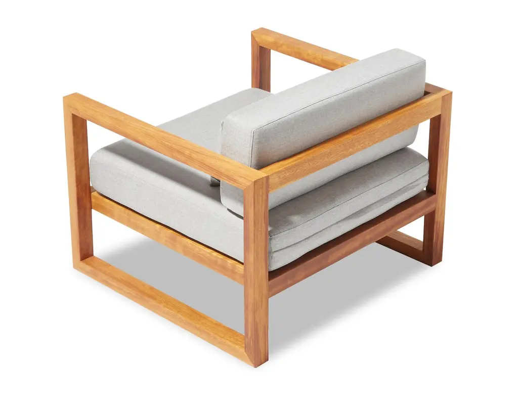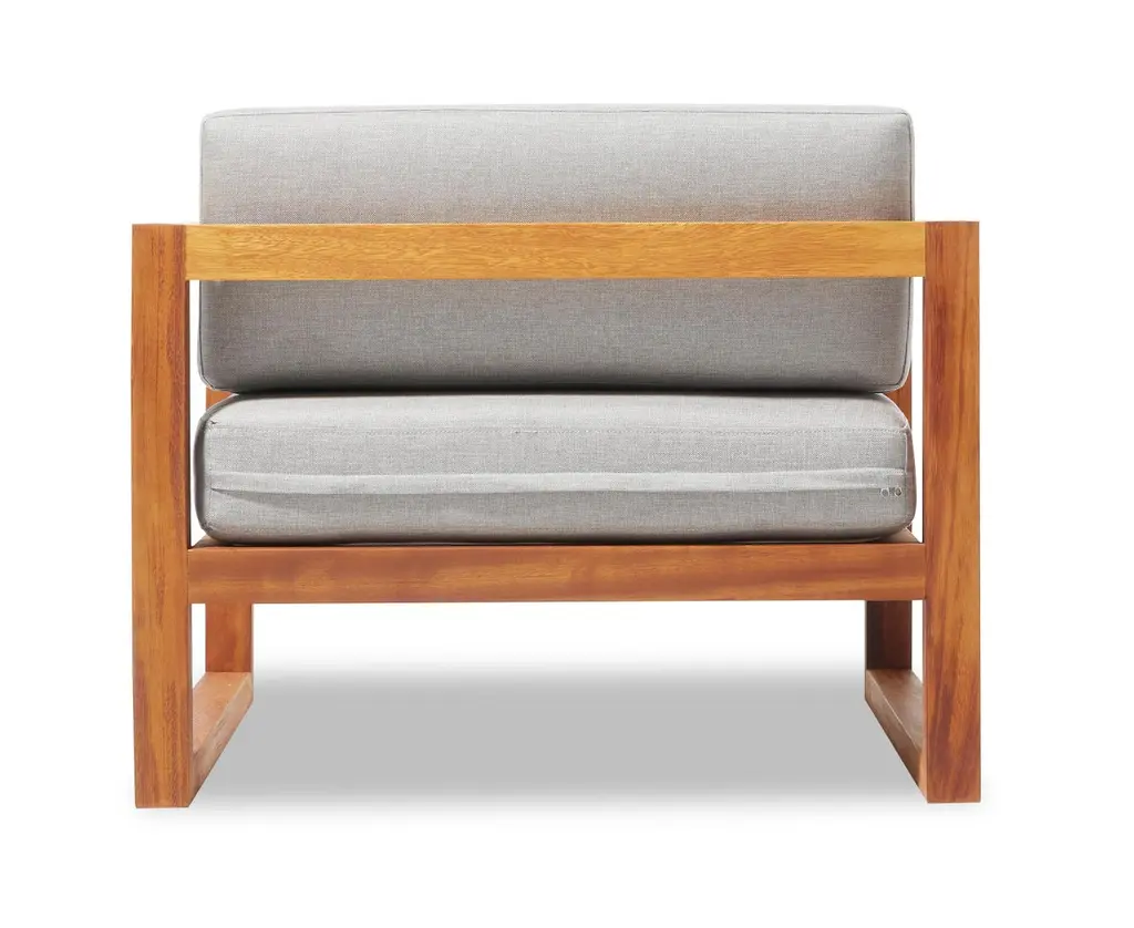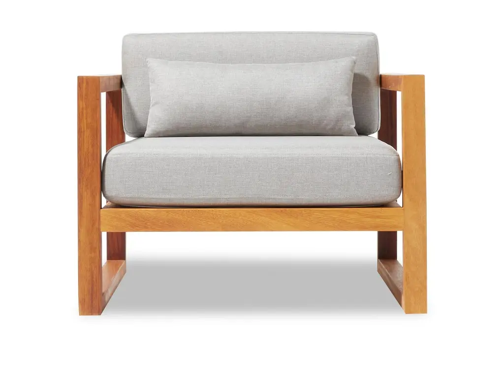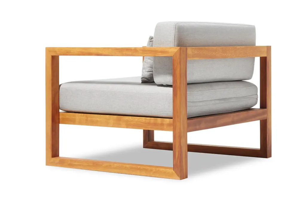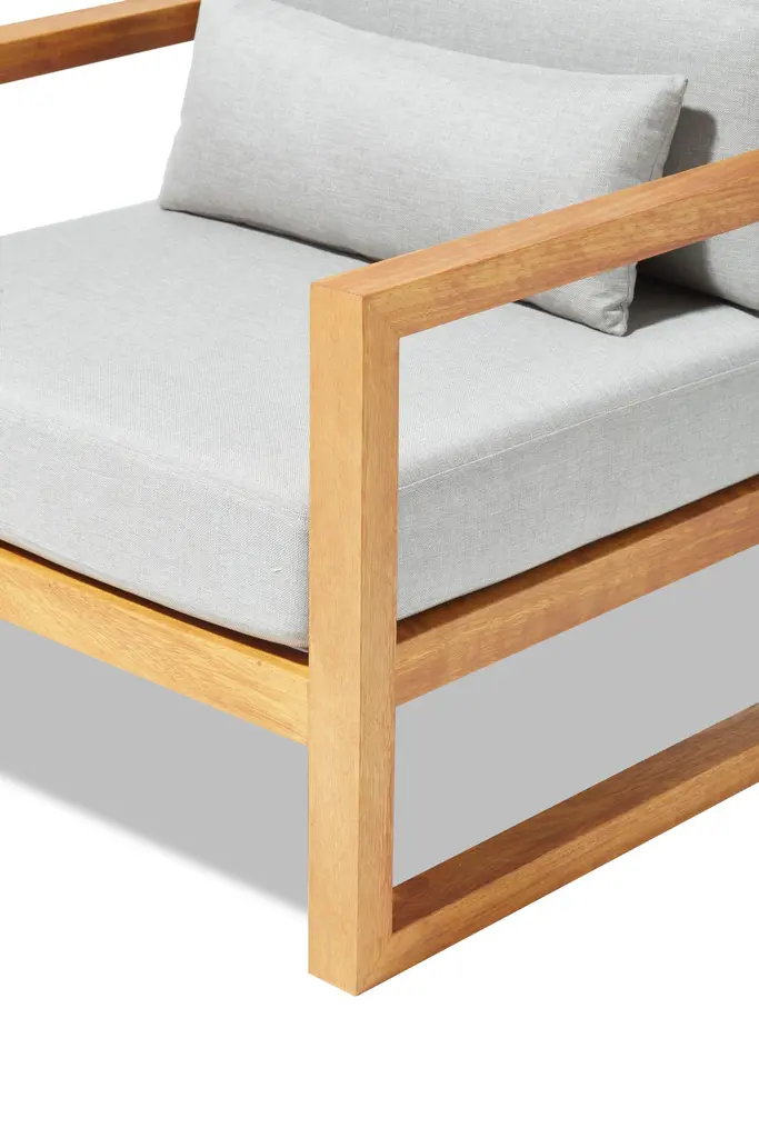 Crafted for enduring outdoor elegance, the Gusto Armchair brings architectural simplicity and robust comfort to any garden, terrace, or veranda. Made from premium-grade Iroko wood, this chair is naturally resistant to moisture and decay, ensuring long-lasting durability in outdoor settings. Its sleek, linear frame complements the plush cushions upholstered in Water-Repellent, UV-resistant fabric, available in two versatile color options. Gusto is designed for year-round performance without compromising style. Whether paired with the Gusto Sofa and Coffee Table or used alone, this armchair creates a refined outdoor atmosphere where timeless design meets the warmth of nature.