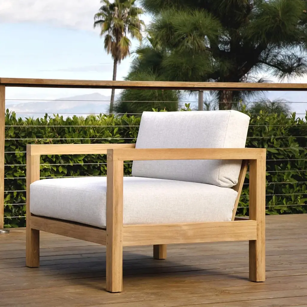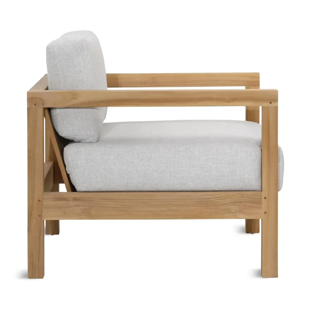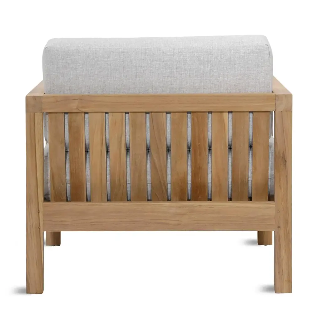 Natural teak wood frame outdoor arm chair with pale grey upholstered cushions. Fabric is solution-dyed acrylic. Each chair may vary slightly in coloring, wood grain, and natural imperfections. Seat height is 17" and seat depth is 24". Weighs approx. 50 lbs. Recommended for under cover use only. Exposure to the elements will change the finish.