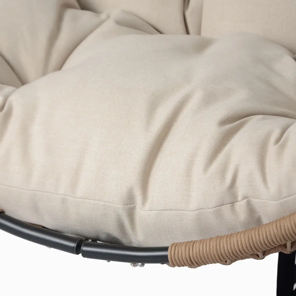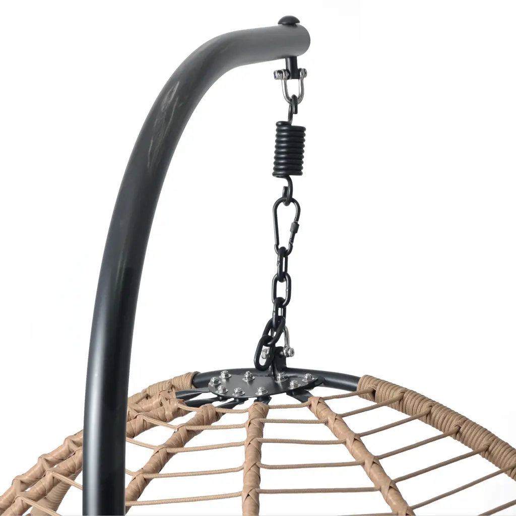 Bringing a perfect blend of rustic charm and modern comfort, this hanging chair elevates any indoor or outdoor space. The woven rattan strips and shallow brown rope detailing create a timeless aesthetic, complemented by a plush beige cushion for extra coziness. A sturdy black iron frame ensures lasting durability, while the fade-resistant fabric keeps the seat looking fresh. Designed for versatility, it seamlessly fits patios, balconies, or living rooms, enhancing any decor. Whether for reading, meditation, or pure relaxation, this chair offers a serene retreat with a stylish, space-saving design.