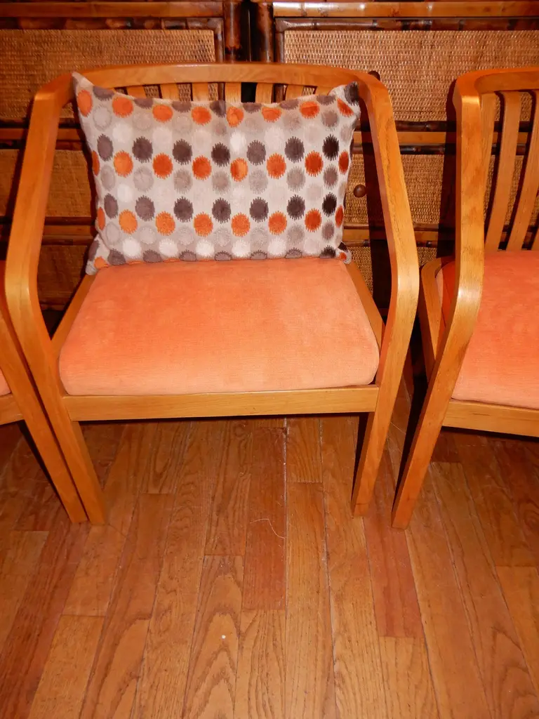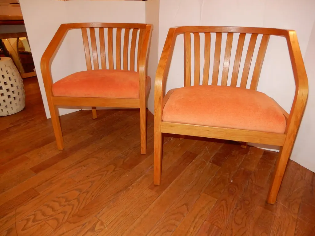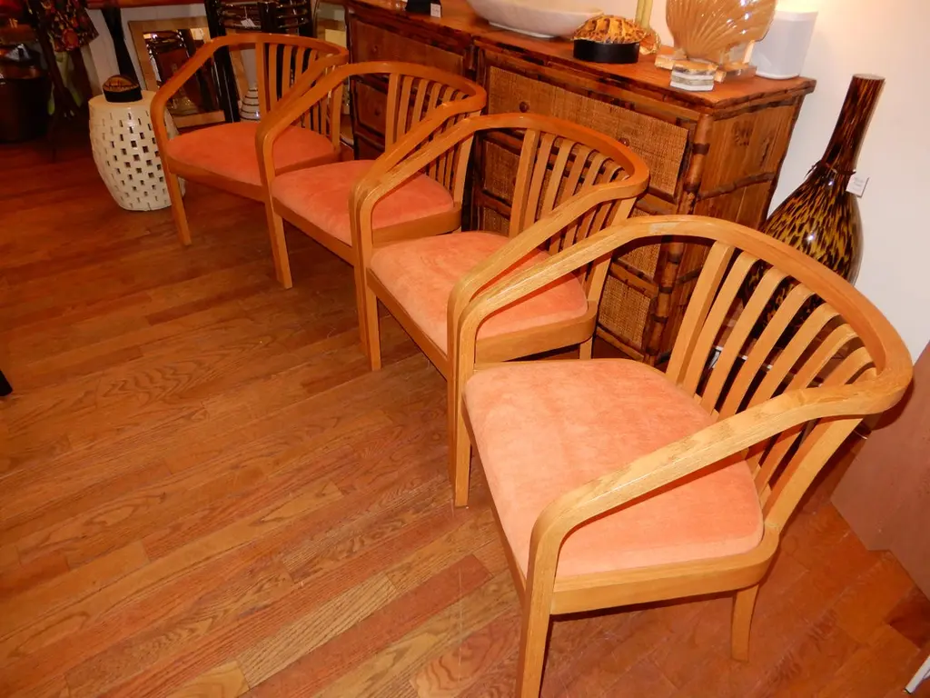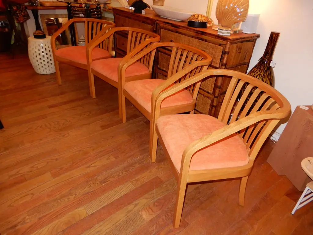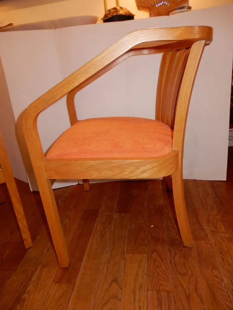 There are four chairs available and sold in sets of two,all new upholstery in a soft chenille fabric,immaculate condition. Generous deep seat,light oak wood curvaceous frames. Danish modern circa 1970s.All hand crafted.