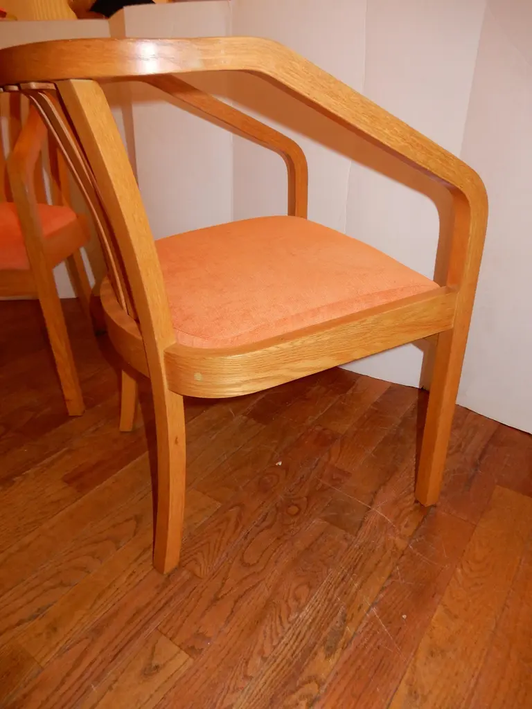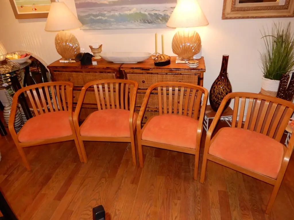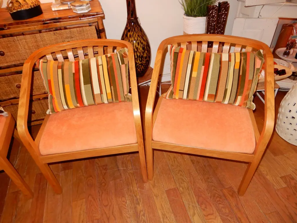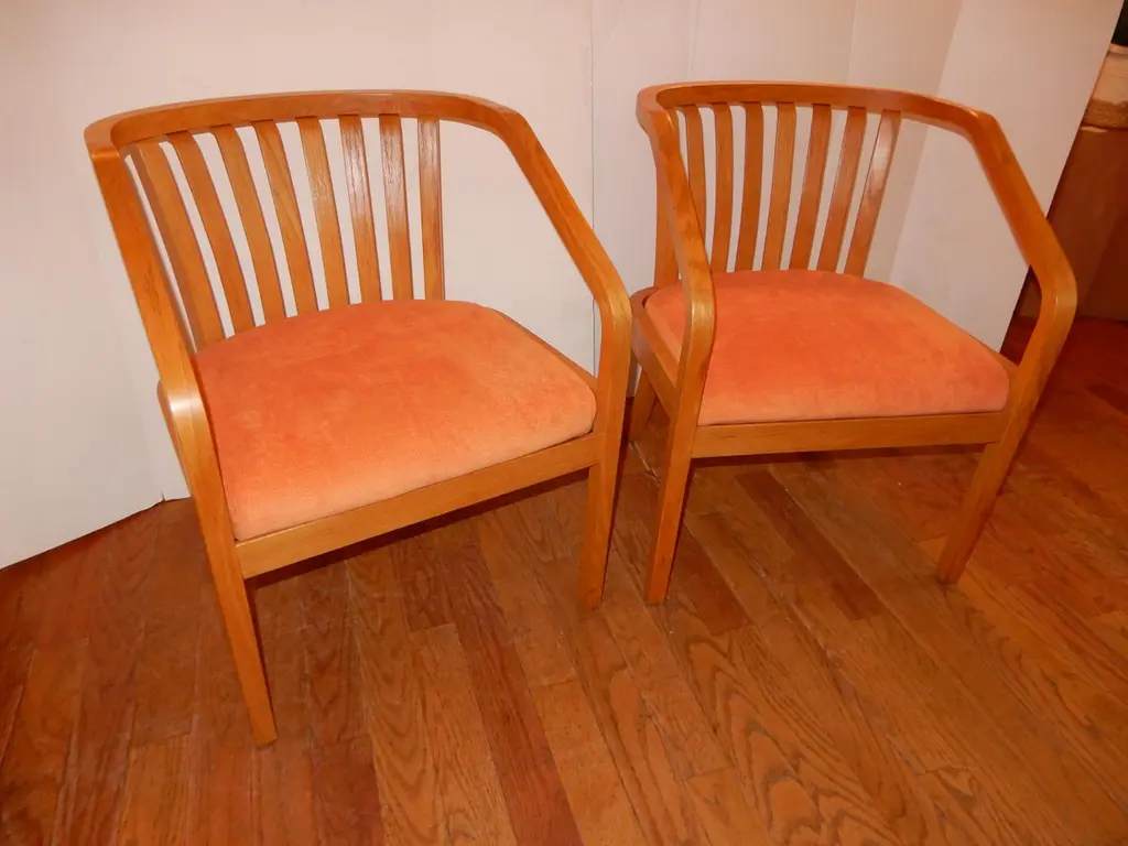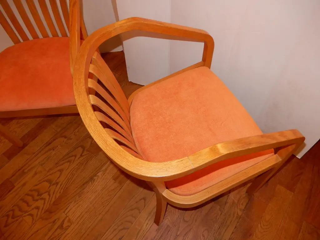 There are four chairs available and sold in sets of two,all new upholstery in a soft chenille fabric,immaculate condition. Generous deep seat,light oak wood curvaceous frames. Danish modern circa 1970s.All hand crafted.