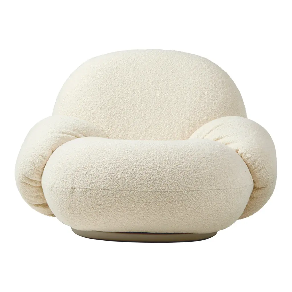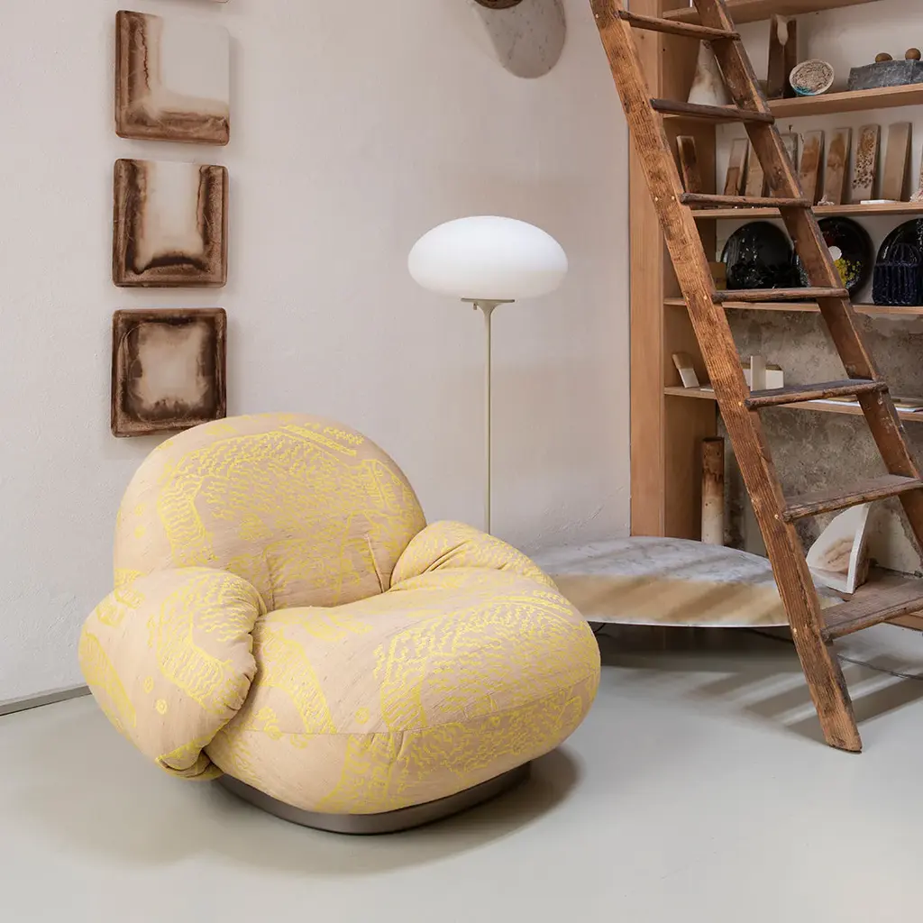 The GUBI Pacha Lounge Chair with Armrests realizes Pierre Paulin's visionary concept of "sitting on clouds" while adding supportive elements that enhance both function and comfort. This sophisticated variation of the iconic 1975 designâ€"once ahead of its time and now perfectly aligned with contemporary sensibilitiesâ€"preserves the revolutionary essence of Paulin's work while offering additional ergonomic benefits. The addition of gracefully integrated armrests transforms the Pacha's floating, cloud-like form into an even more complete sanctuary. These sculptural extensions emerge organically from the main body, providing gentle support for extended relaxation without compromising the chair's radical low-level living concept that challenged traditional seating conventions by eliminating standard legs. Paulin's genius reveals itself in the chair's masterful proportions and organic architecture. The curvaceous, whimsical silhouette, carefully traced with inward-inclining stitching lines, creates an embracing experience that seems to defy gravity. This sophisticated construction transforms a radical design concept into an elegantly resolved form that looks as contemporary today as it did during the height of French modernism. Part of GUBI's thoughtfully reissued Pacha Collection, this armrest version can be customized in an extensive array of fabrics and materials. The distinctive silhouette confidently carries bold colors and tactile expressions, allowing for personalization while maintaining the design's iconic character. When upholstered in premium materials like velvet or leather, the chair develops intentional wrinkles along its curved seamsâ€"a characteristic that adds to its sensual, lived-in appeal. Whether placed as a standalone statement piece or combined with other Pacha modules to create endless seating possibilities, this evolved version continues to epitomize the freedom and creativity of 1970s French design. The Pacha with Armrests offers a perfect balance of historical significance and practical functionality, creating an inviting cocoon for today's relaxation needs across both residential interiors and sophisticated commercial environments. For thicker materials such as leather and velvet, there will be some wrinkling along the curved seams of Pacha. This is intentional and inherent to the upholstery process.
