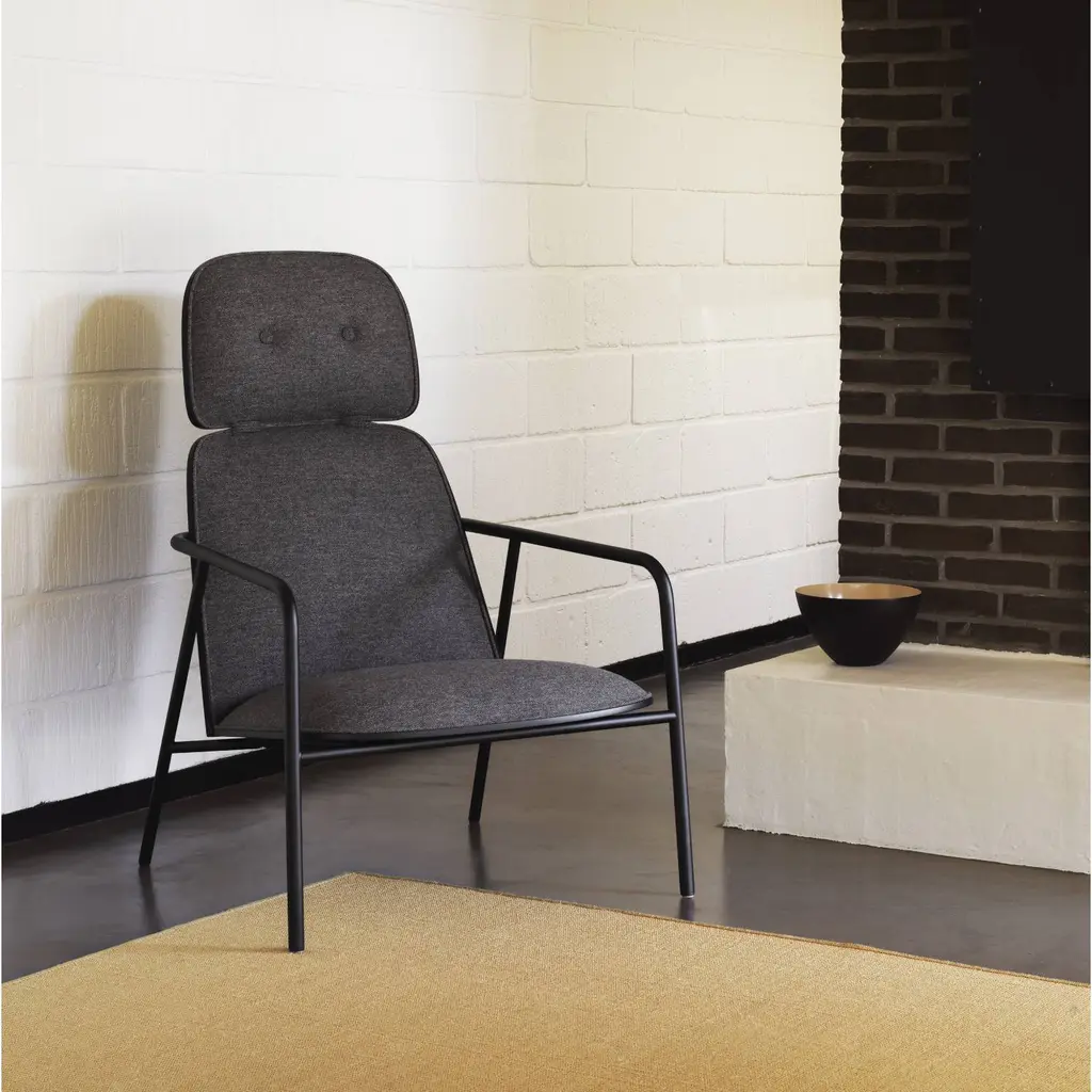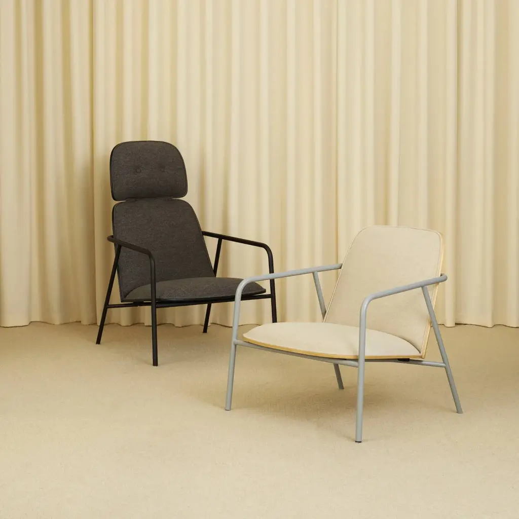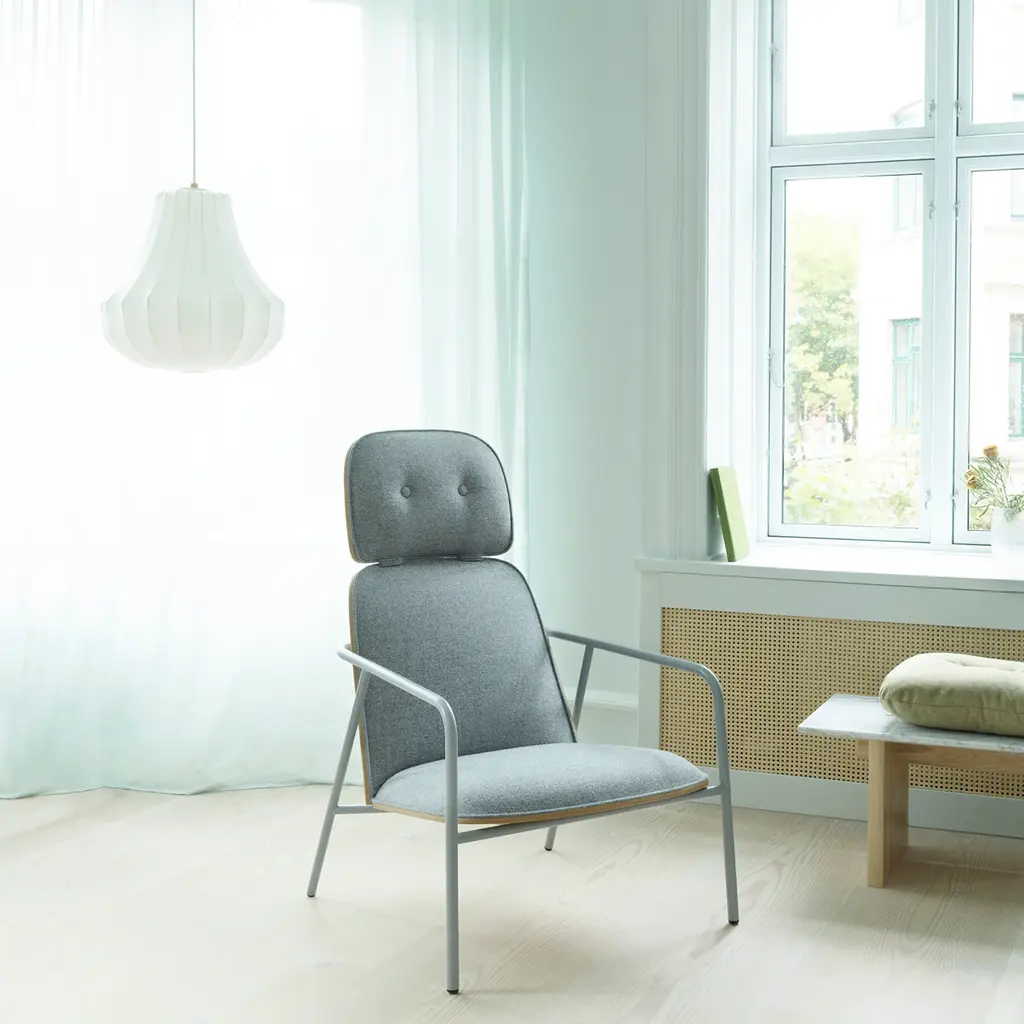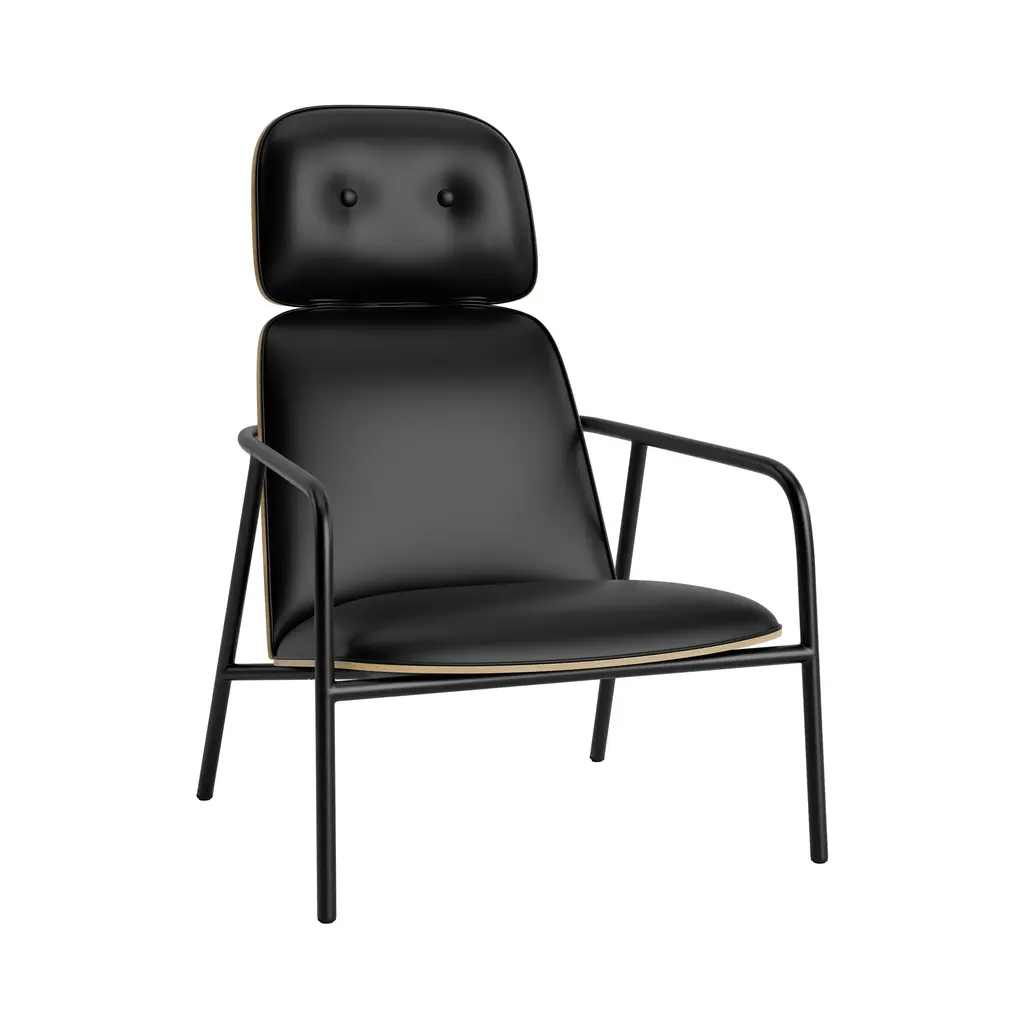 The high-backed version of Pad lounge seating exudes plush contentment, enveloped in its veneer shell. Skillfully upholstered in the finest fabric or silky leather, the chair is cushioned with a generous underpinning of molded PU foam and has a steel reinforcement for flexibility and ultimate sitting comfort. Legs are made of powder-coated steel tubing in black or grey to complement the choice of natural oak or painted ash veneer.