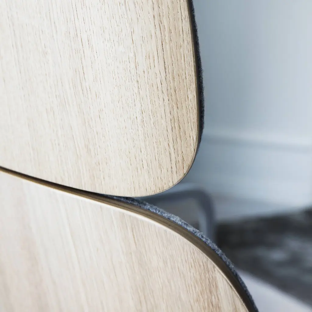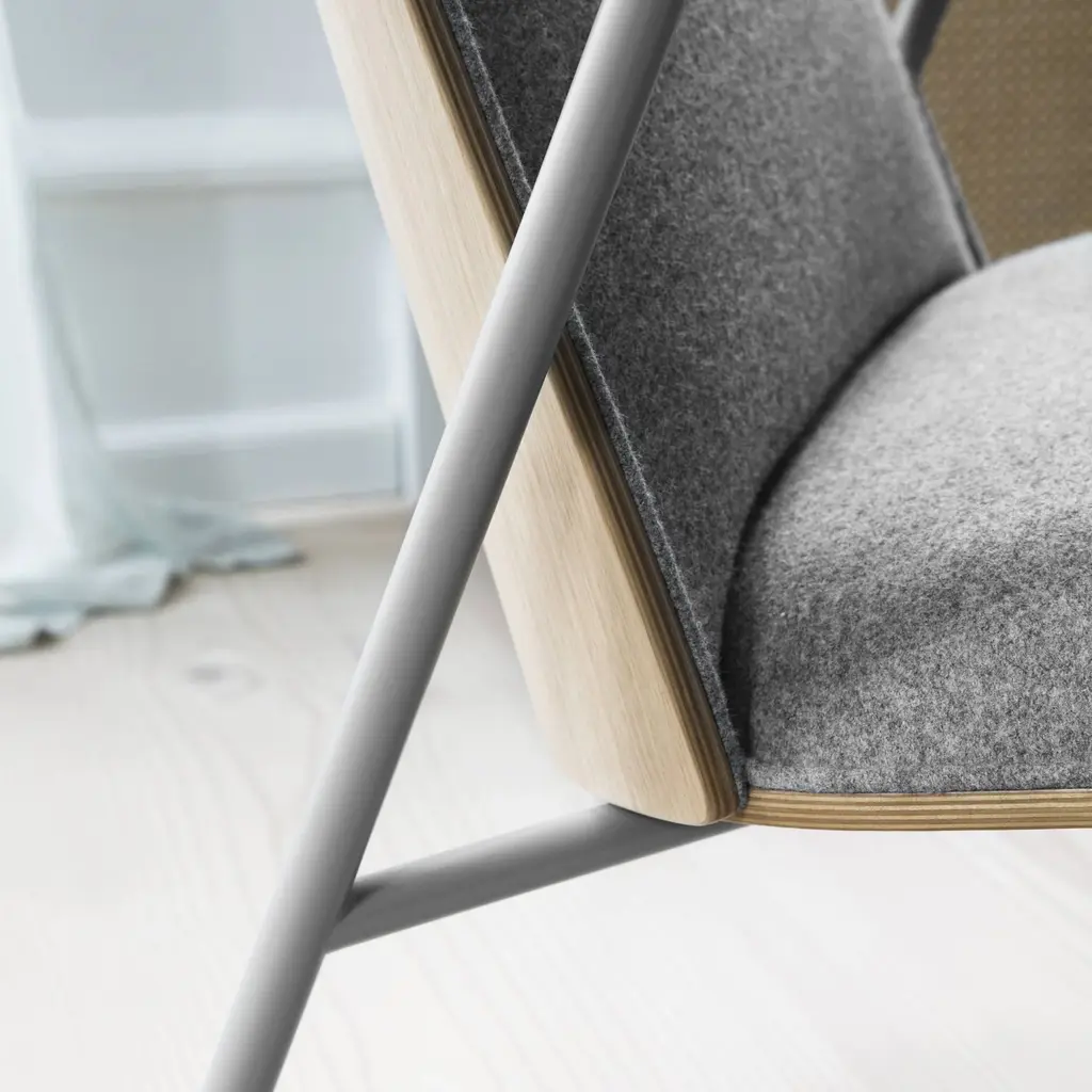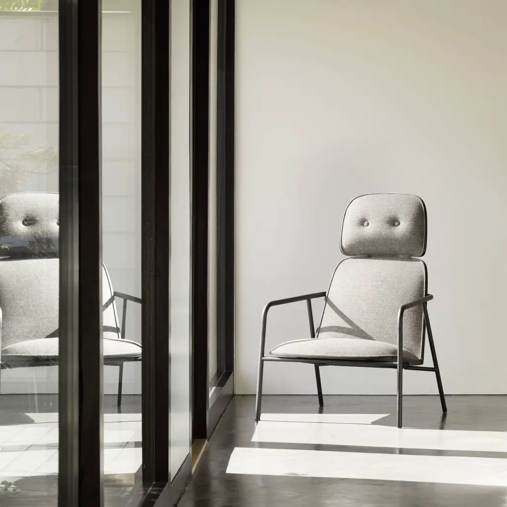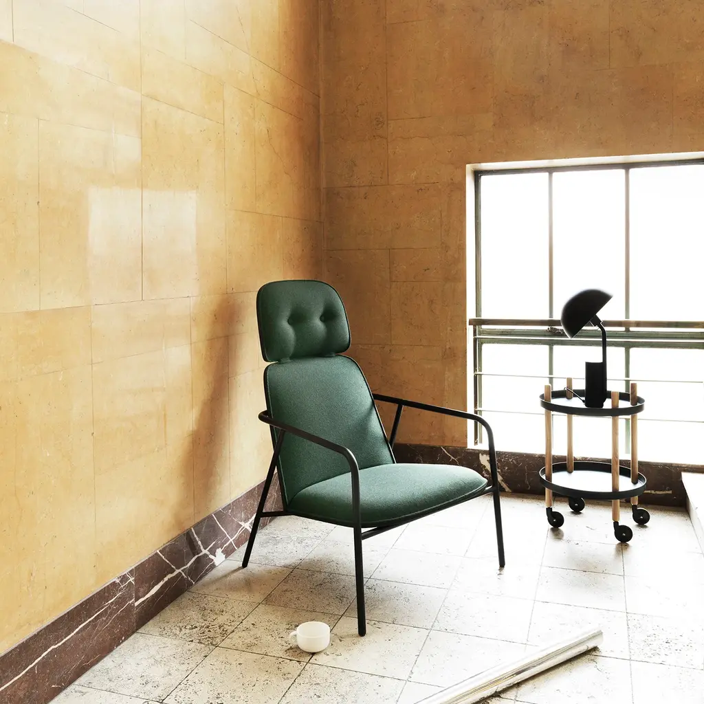 The high-backed version of Pad lounge seating exudes plush contentment, enveloped in its veneer shell. Skillfully upholstered in the finest fabric or silky leather, the chair is cushioned with a generous underpinning of molded PU foam and has a steel reinforcement for flexibility and ultimate sitting comfort. Legs are made of powder-coated steel tubing in black or grey to complement the choice of natural oak or painted ash veneer.