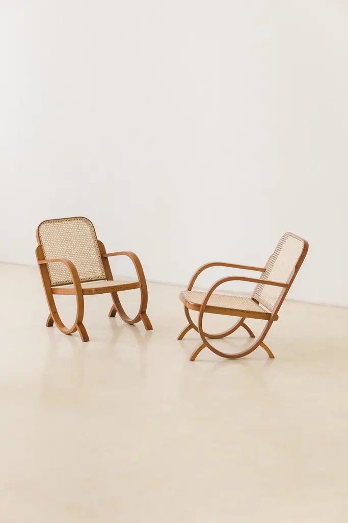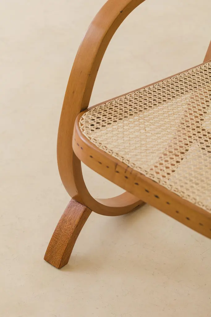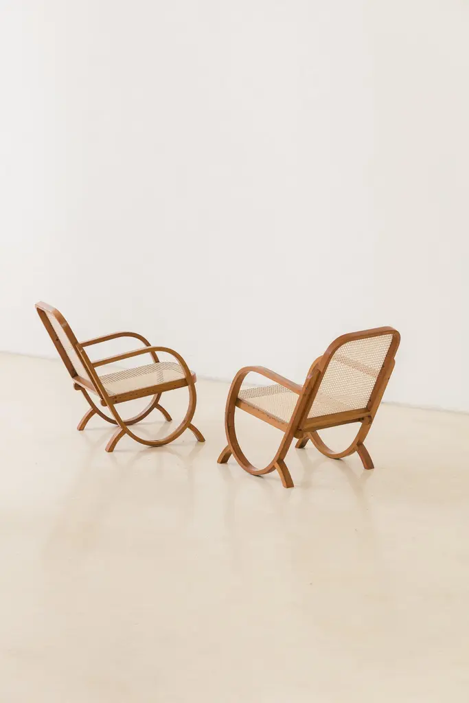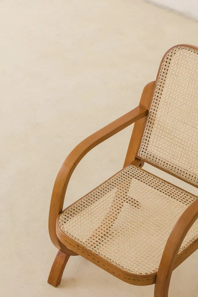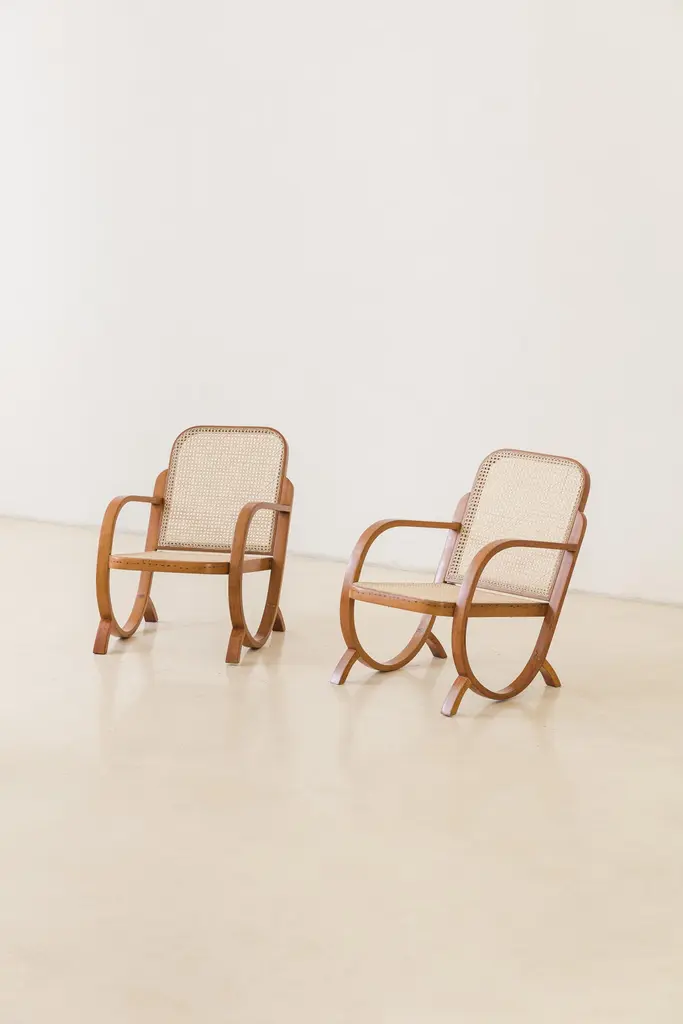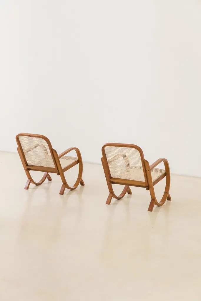 This pair of armchairs was produced by the Brazilian company Móveis Gerdau in the 1930s. The restored pieces were made of bent wood and plastic cane, which provides optimal ventilation for furniture in tropical climates. These armchairs exude elegance and are versatile additions to living rooms, reading corners, and bedrooms, offering both comfort and durability.