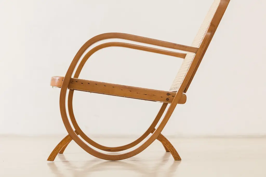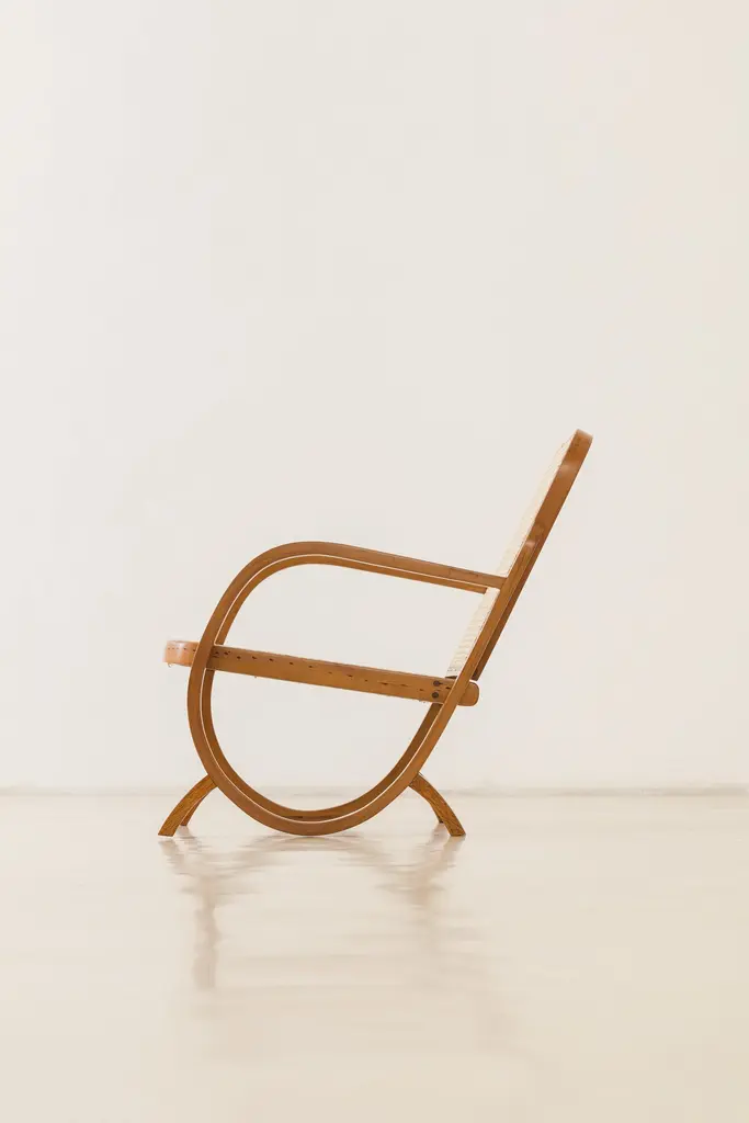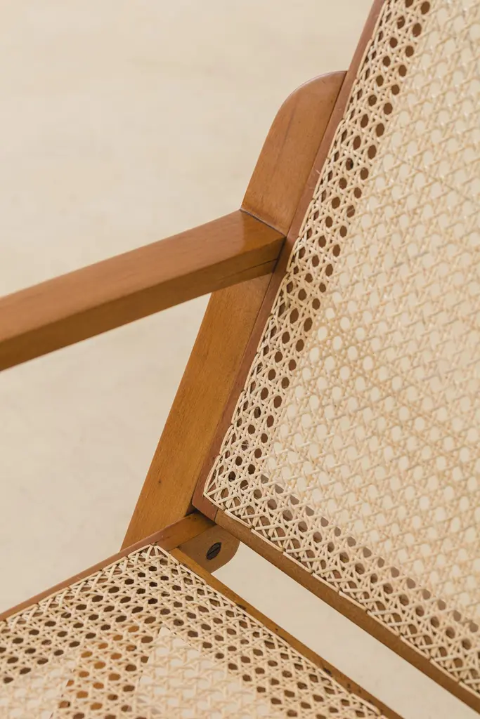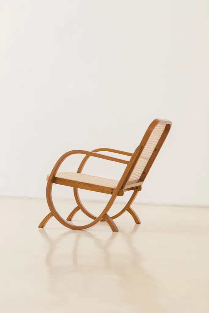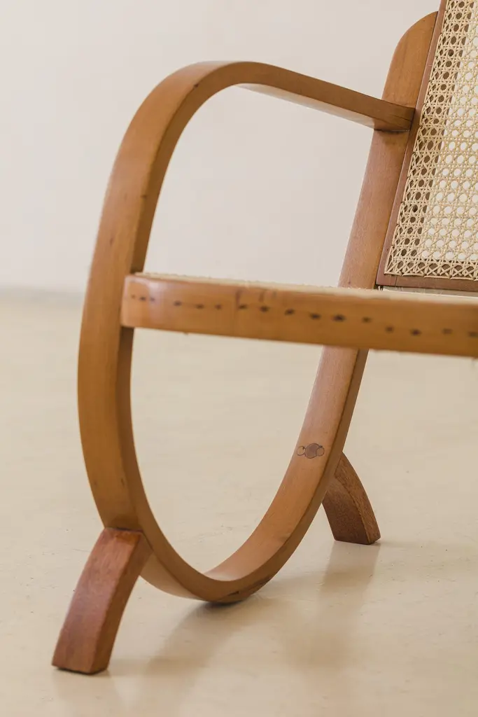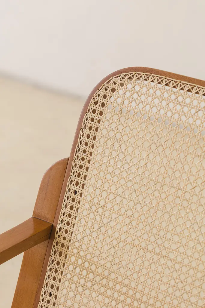 This pair of armchairs was produced by the Brazilian company Móveis Gerdau in the 1930s. The restored pieces were made of bent wood and plastic cane, which provides optimal ventilation for furniture in tropical climates. These armchairs exude elegance and are versatile additions to living rooms, reading corners, and bedrooms, offering both comfort and durability.